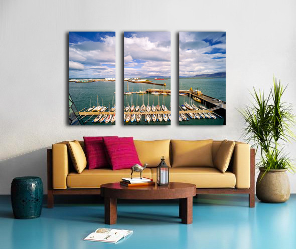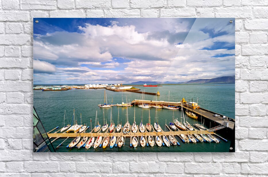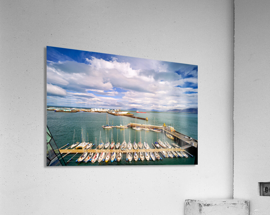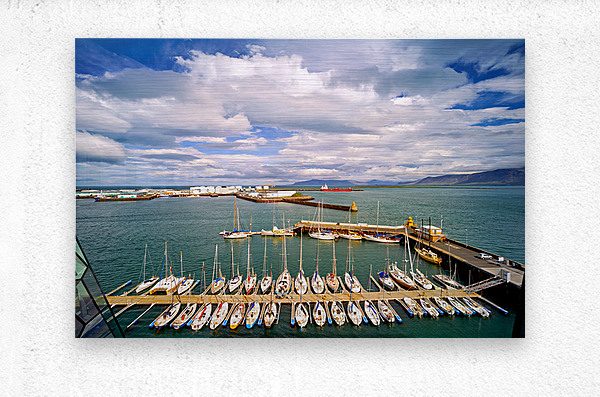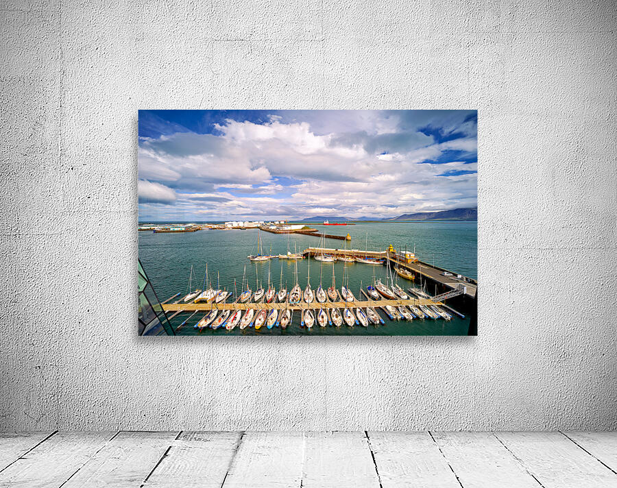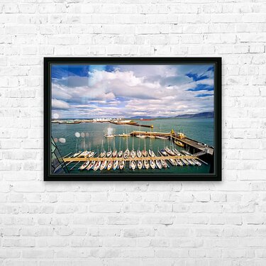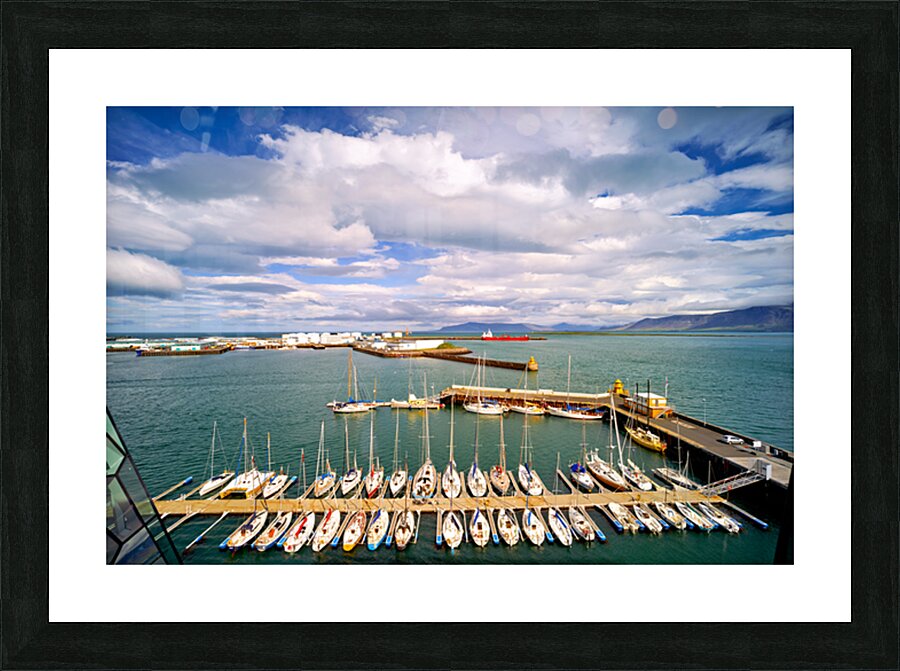 "Harbor view in Reykjavik Iceland with sailing boats and clouds" in a framed print.
