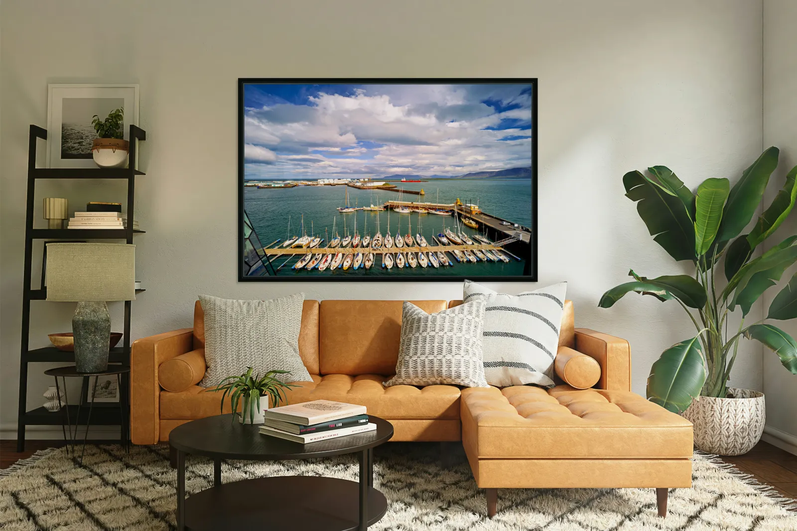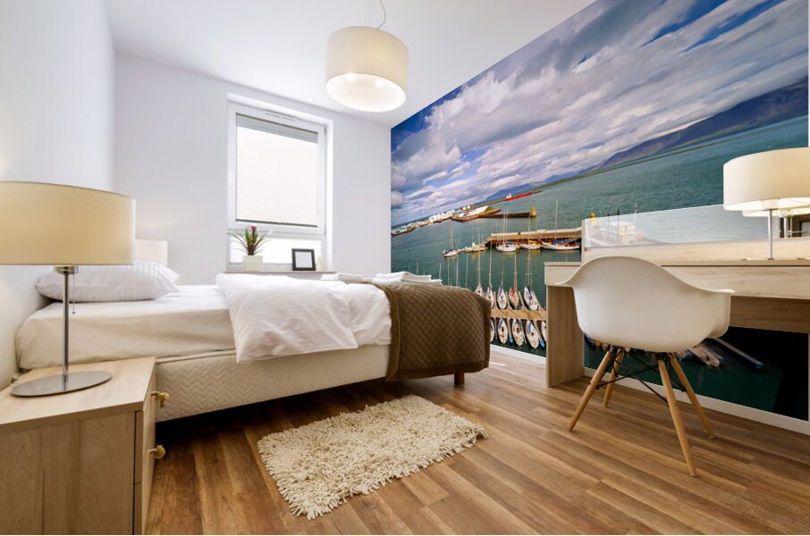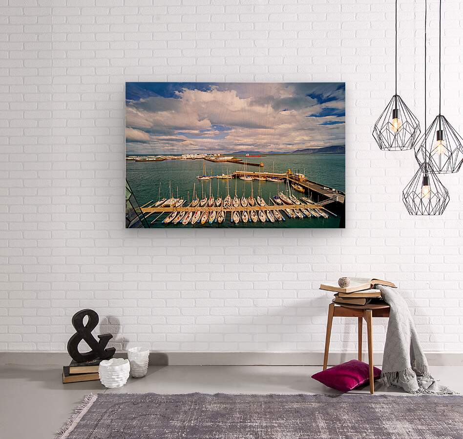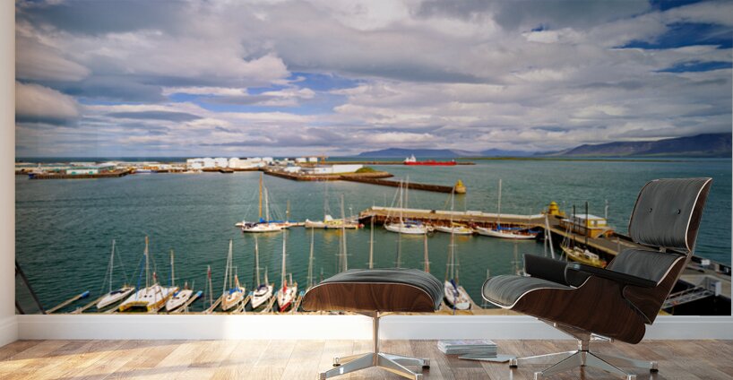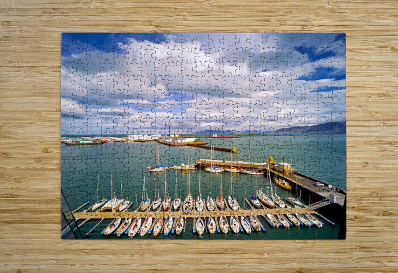 "Harbor view in Reykjavik Iceland with sailing boats and clouds" in a framed print.