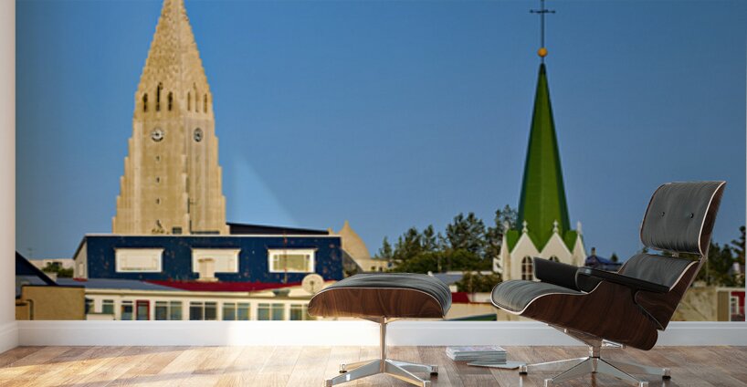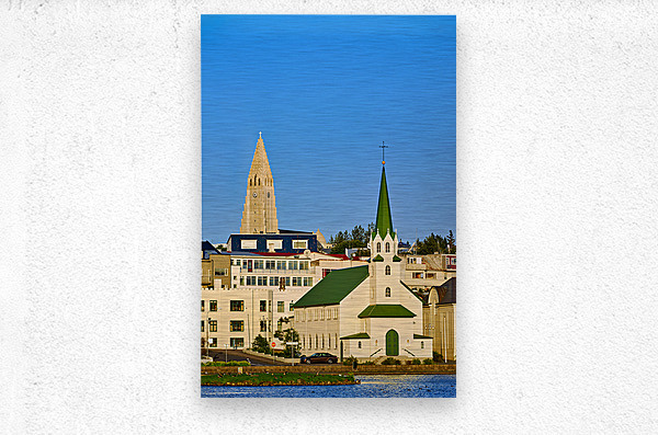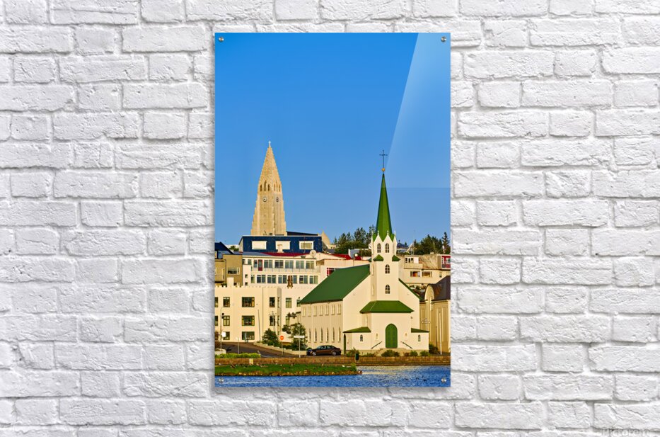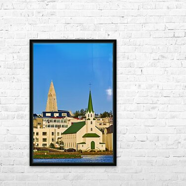 Get this artwork "Lutheran free church by lake Tjornin and Halgrimskirkja" in a framed print.