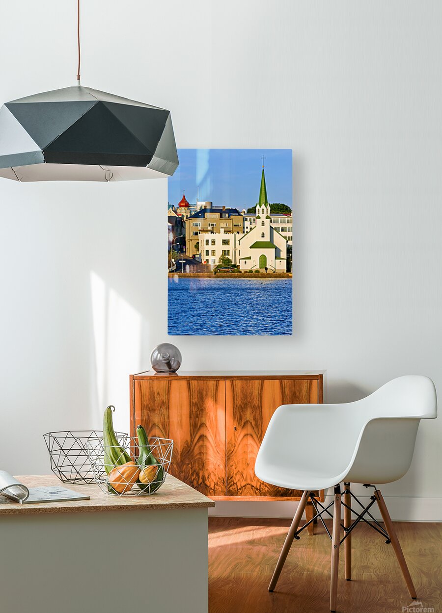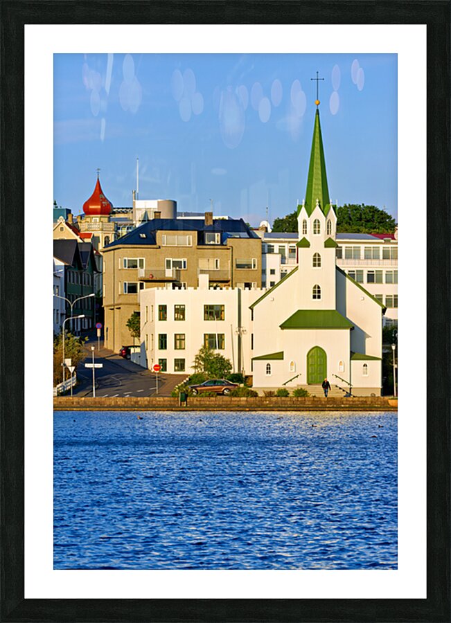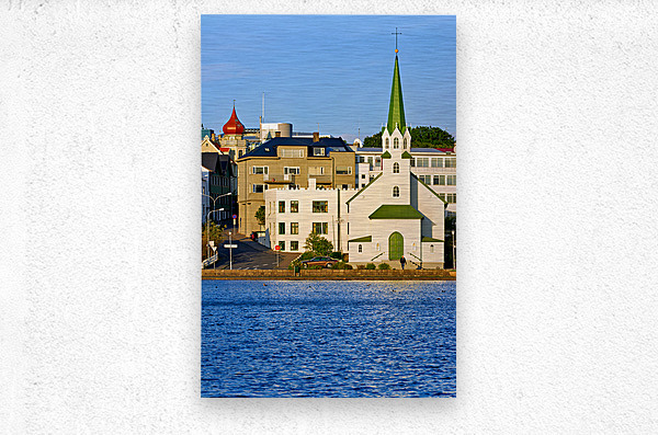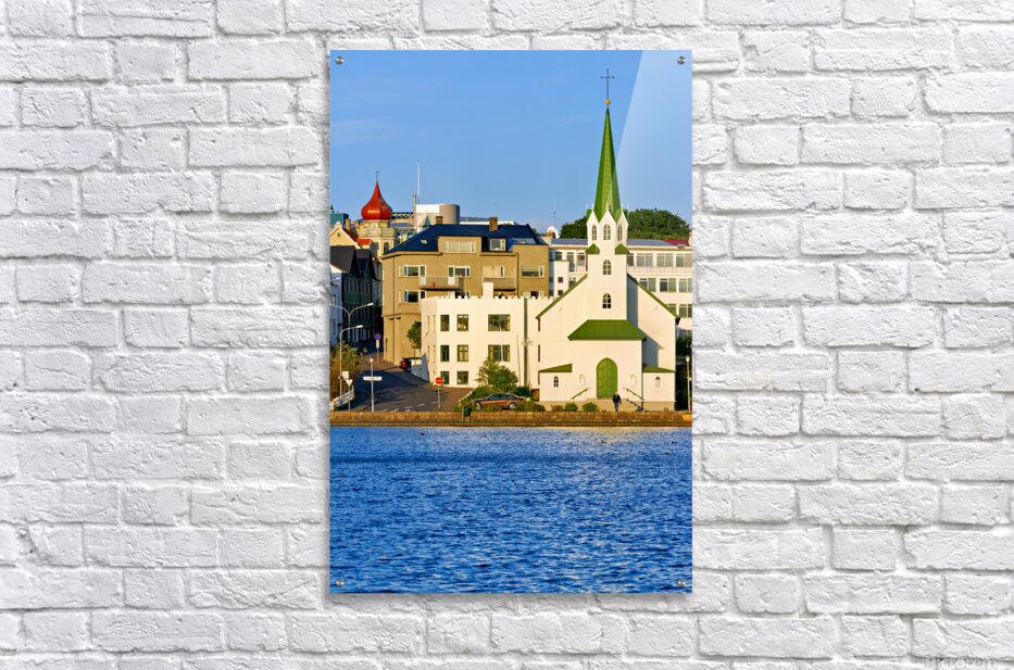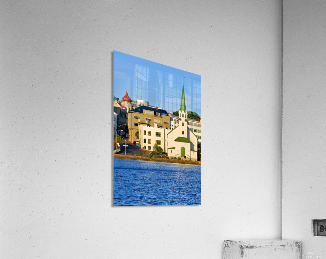 Lutheran Free Church stands by Lake Tjornin in Reykjavik with buildings and streets showing activity in the area during daytime.