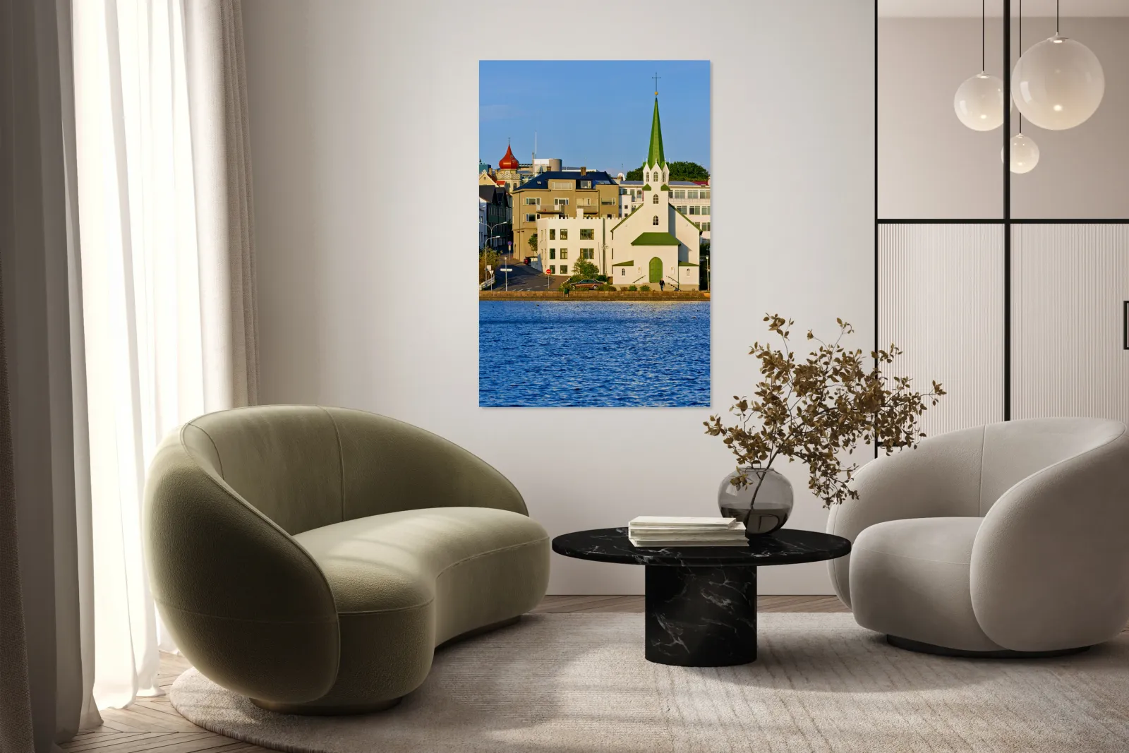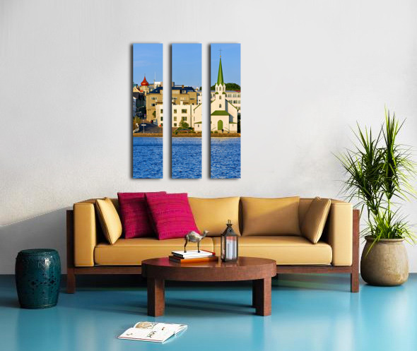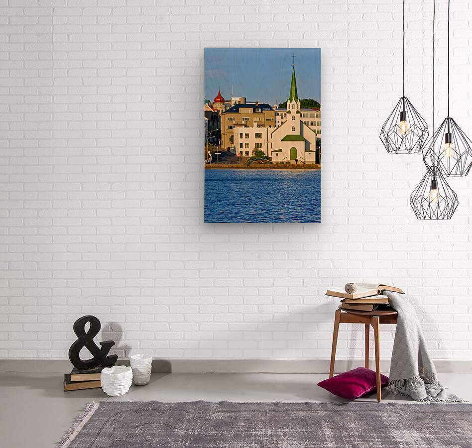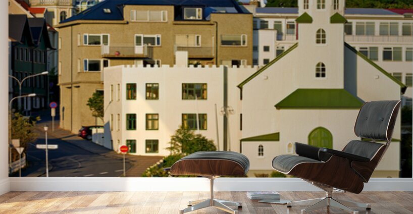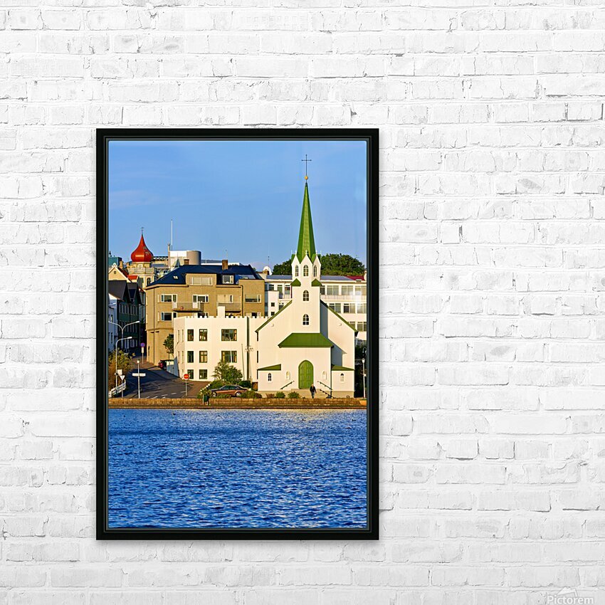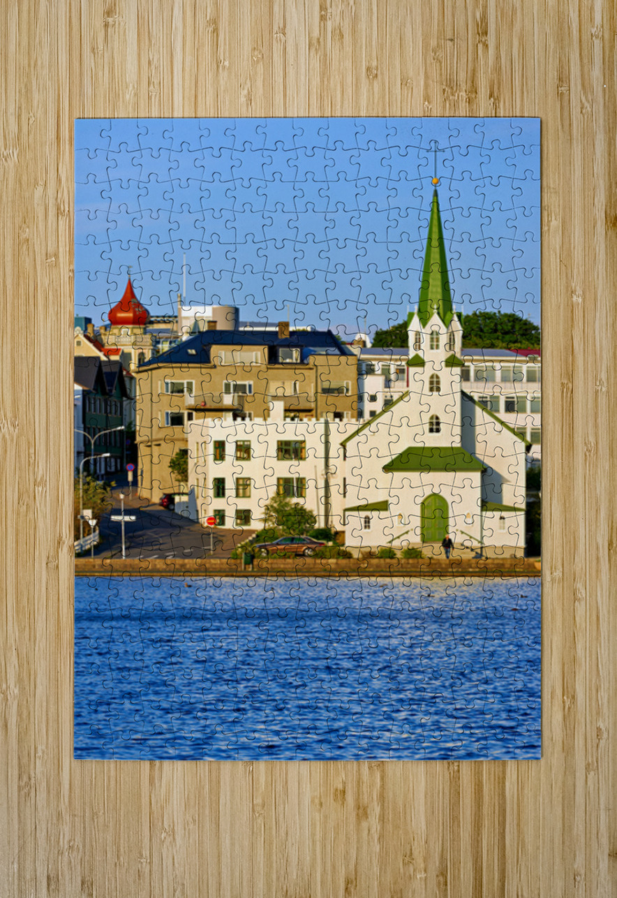 Lutheran Free Church stands by Lake Tjornin in Reykjavik with buildings and streets showing activity in the area during daytime.