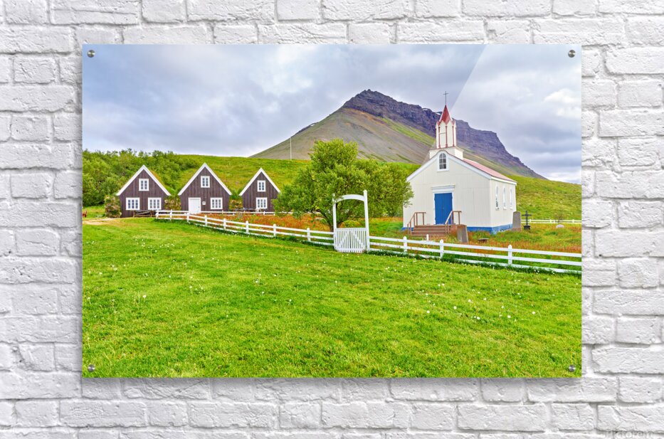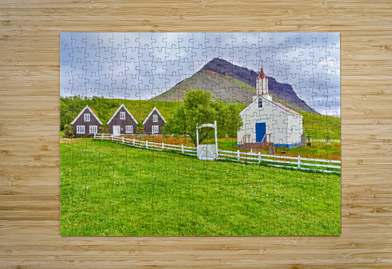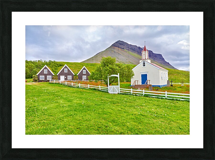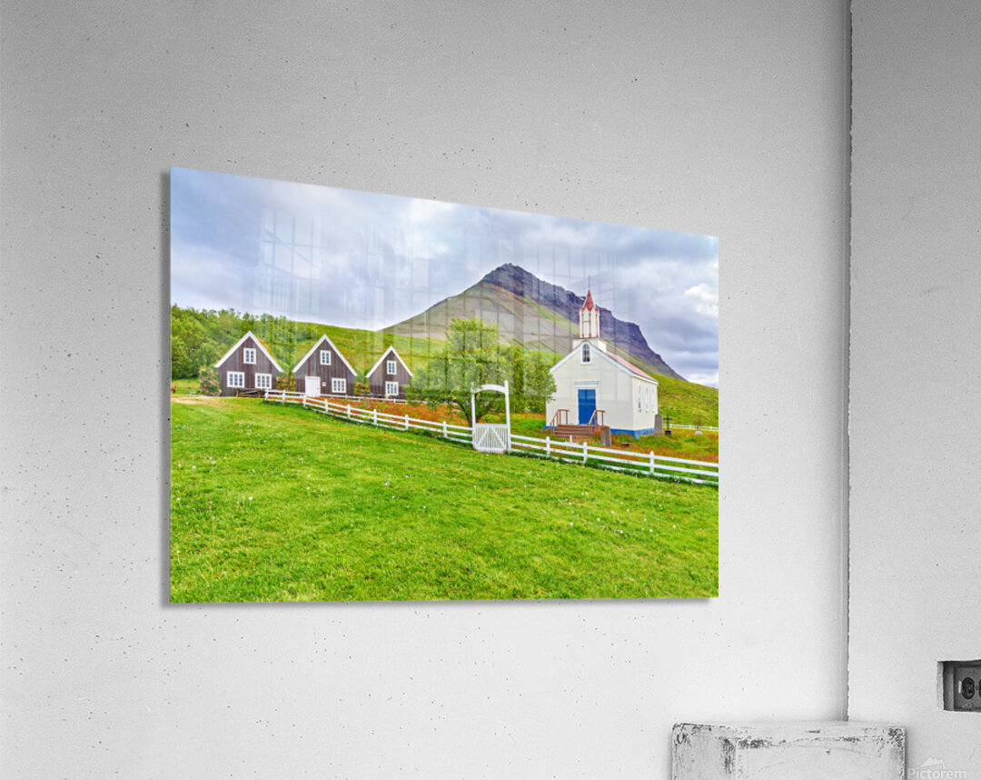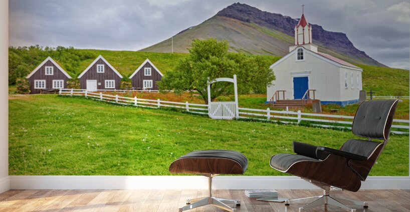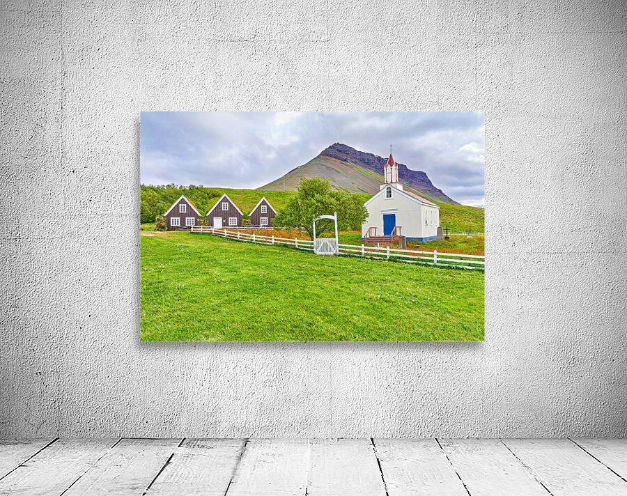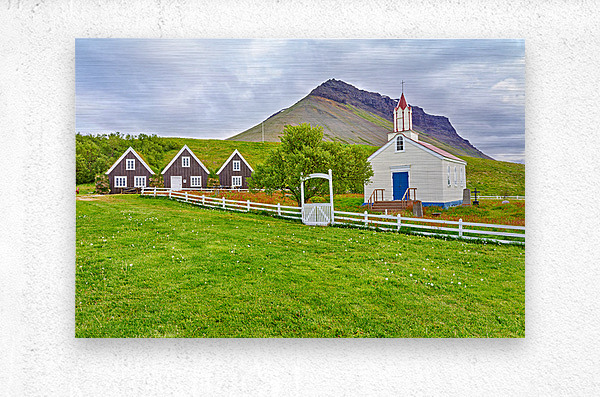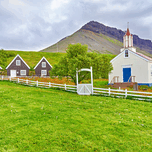 The Jon Sigurdsson Museum and Church stand together near a mountain. Green grass surrounds the buildings under a cloudy sky.