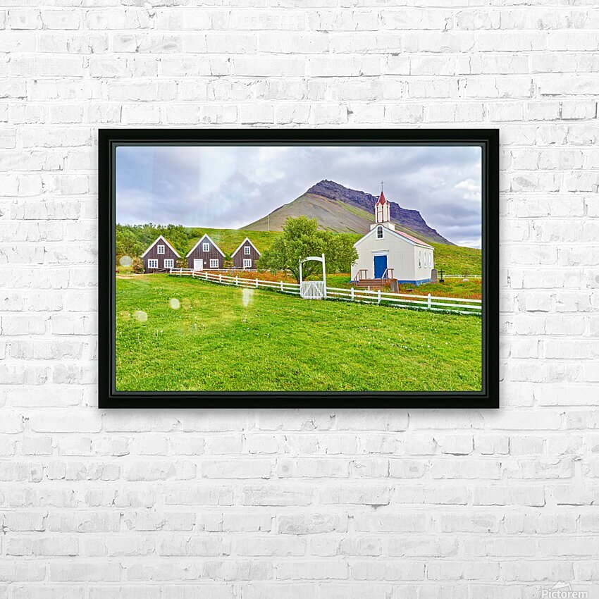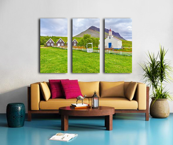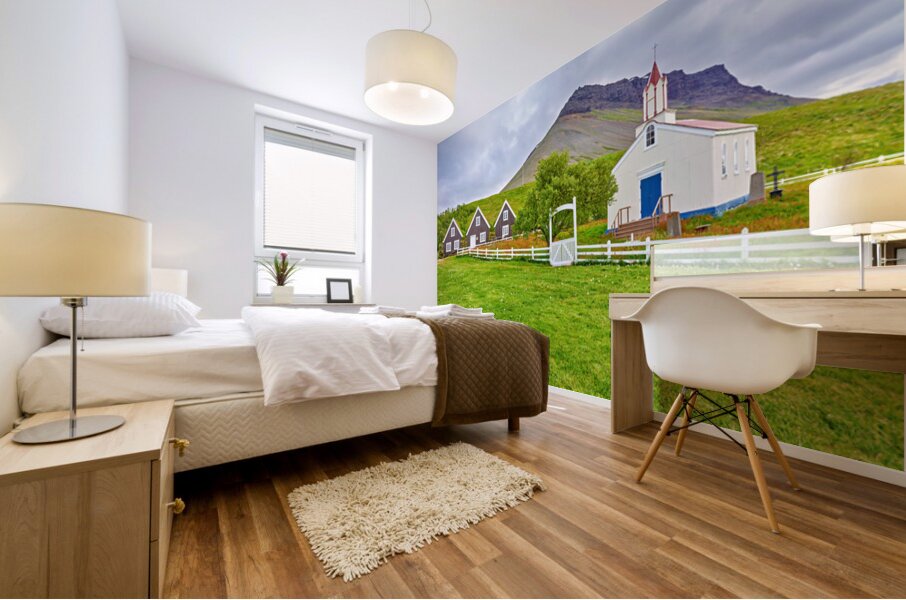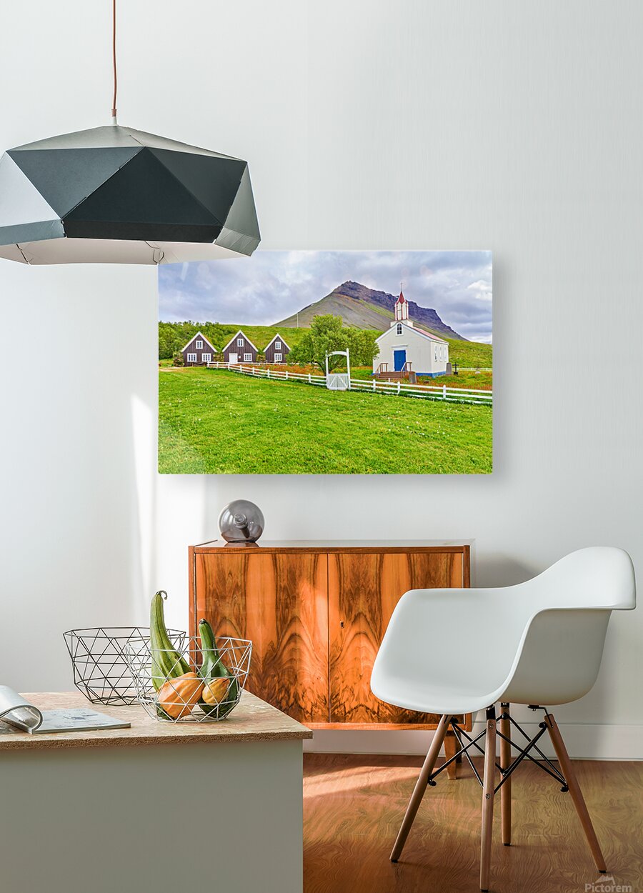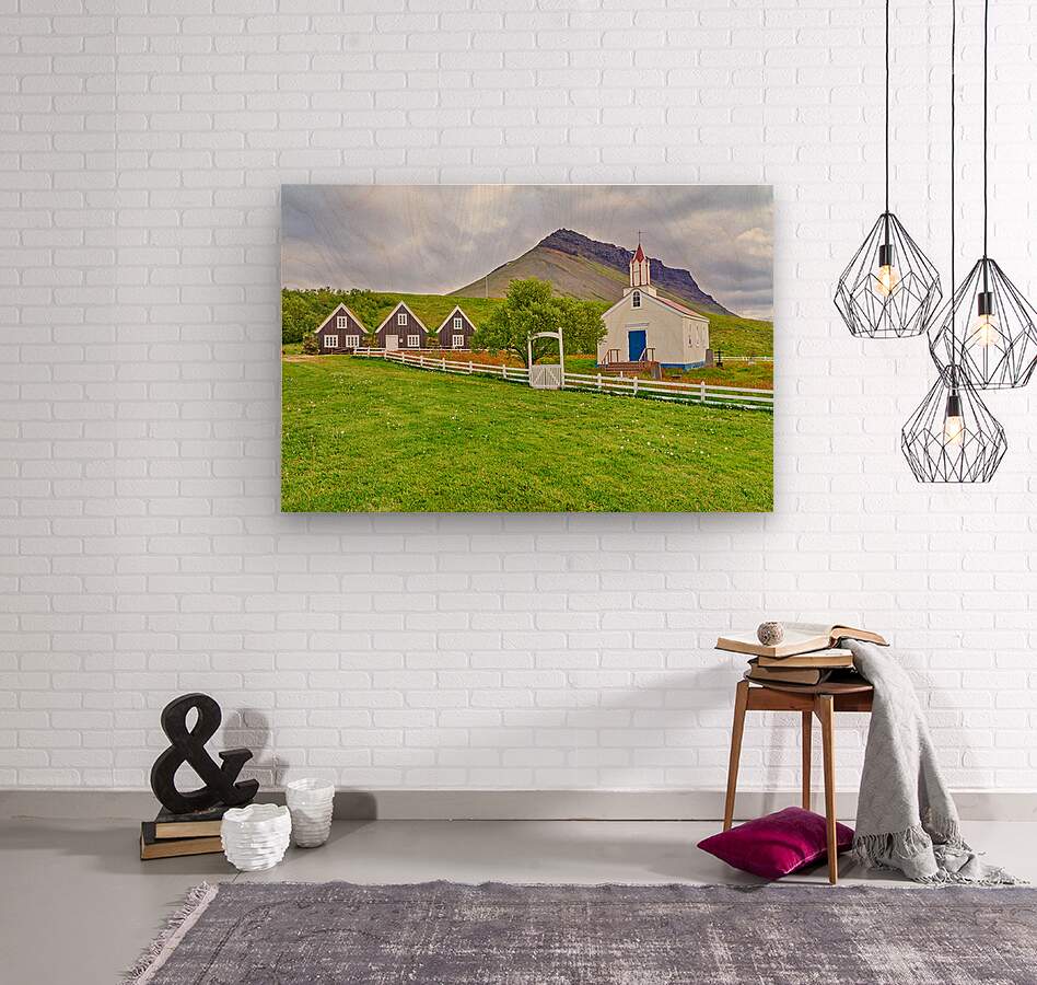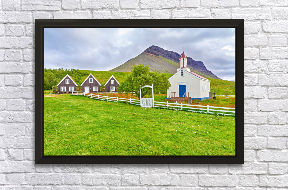 The Jon Sigurdsson Museum and Church stand together near a mountain. Green grass surrounds the buildings under a cloudy sky.