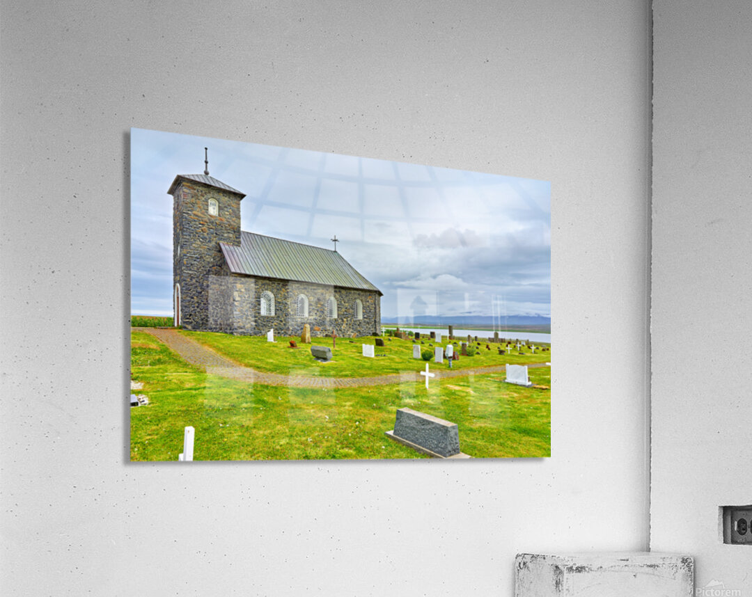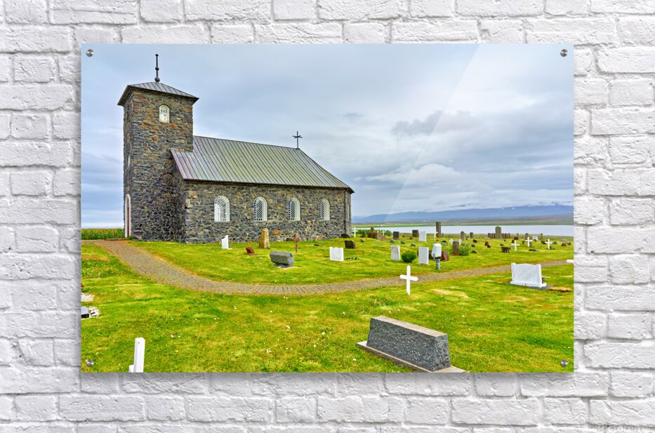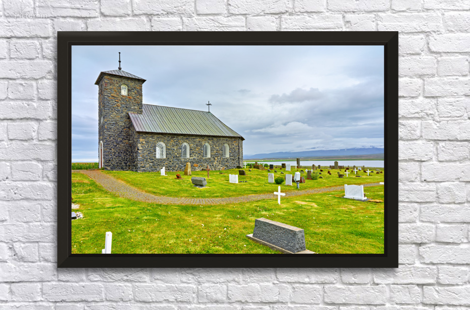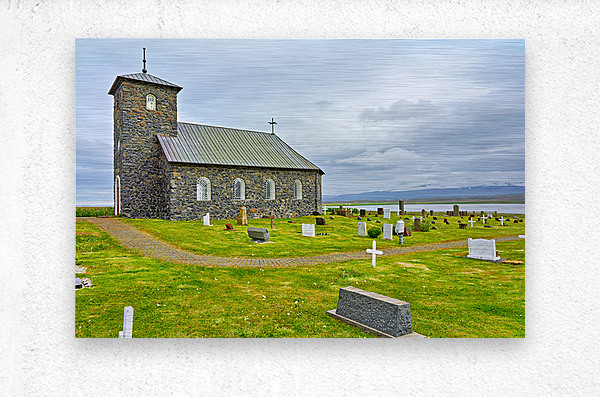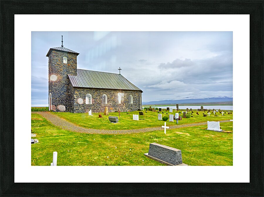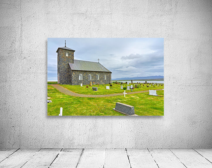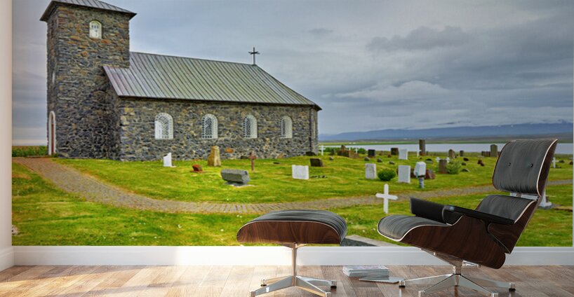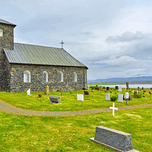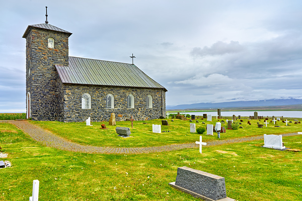 Tyngeyraklausturskirkja church stands near a graveyard by the coast. Clouds cover the sky as visitors explore the area.