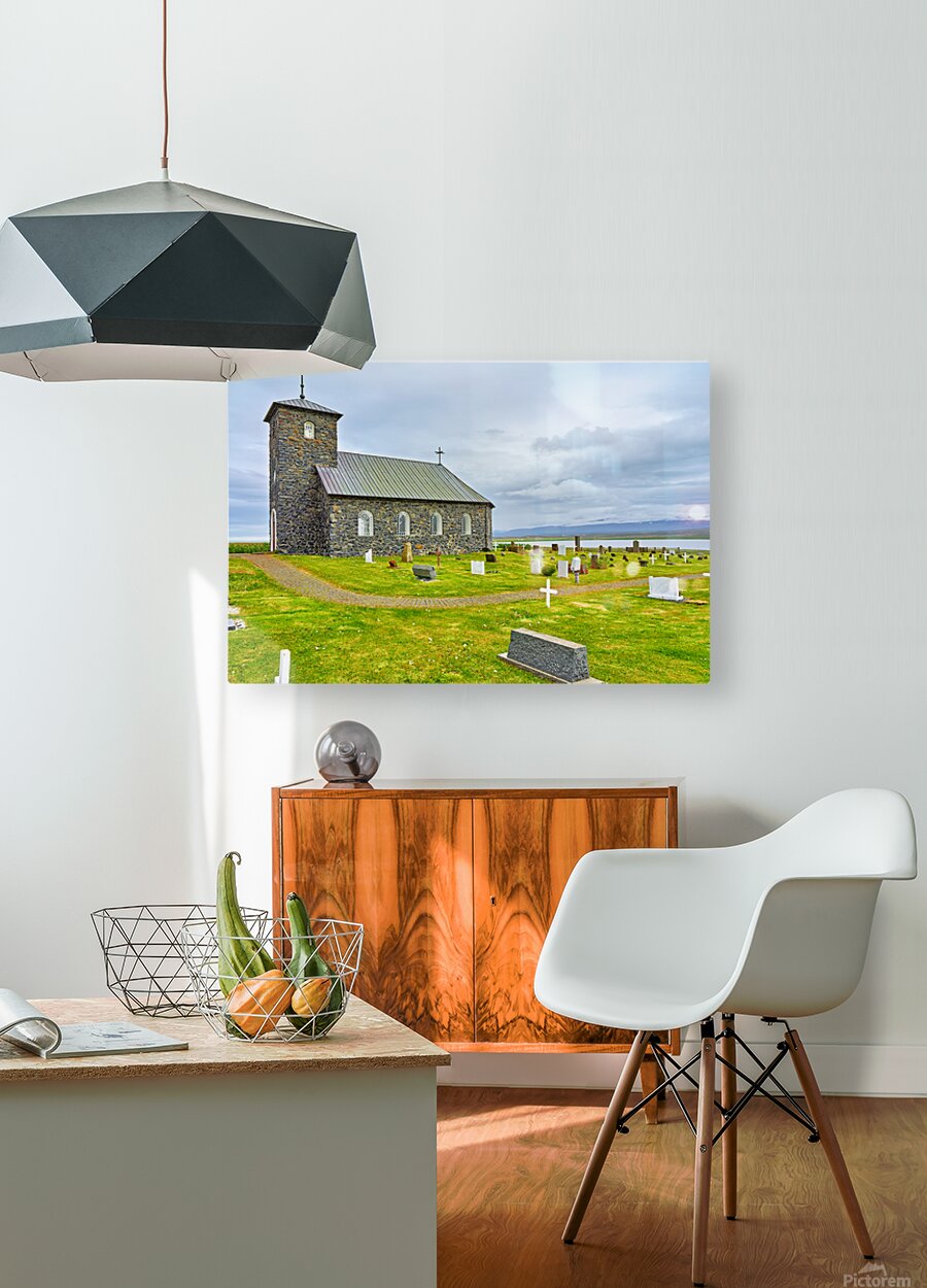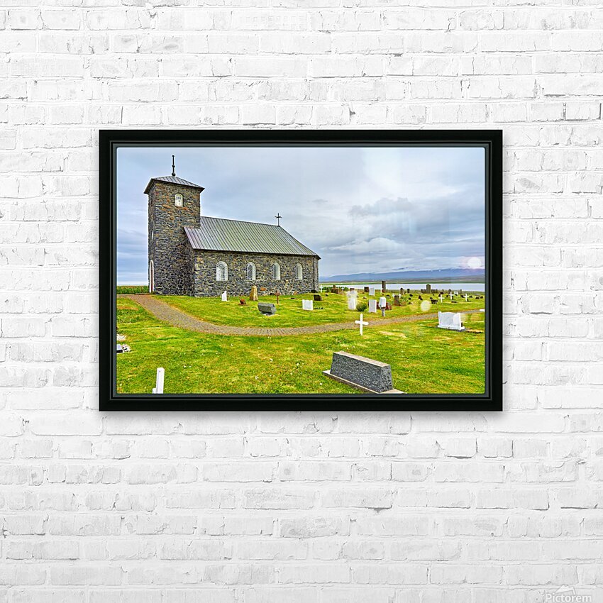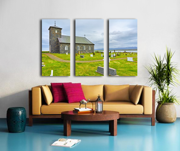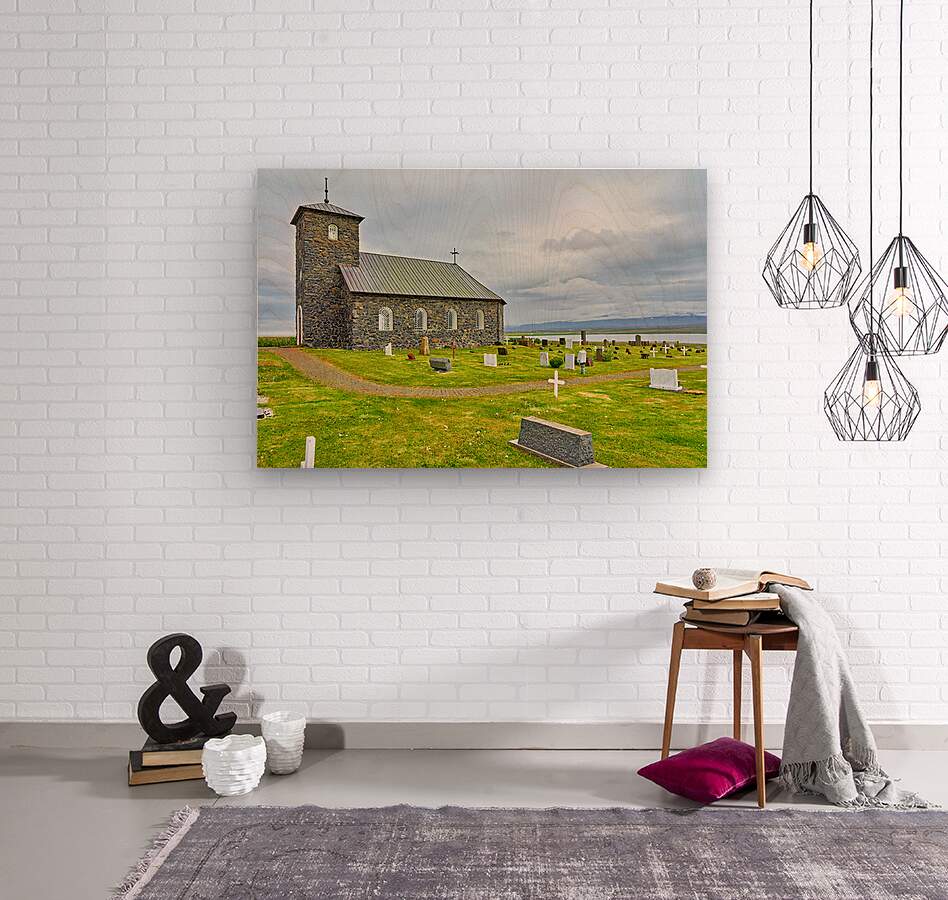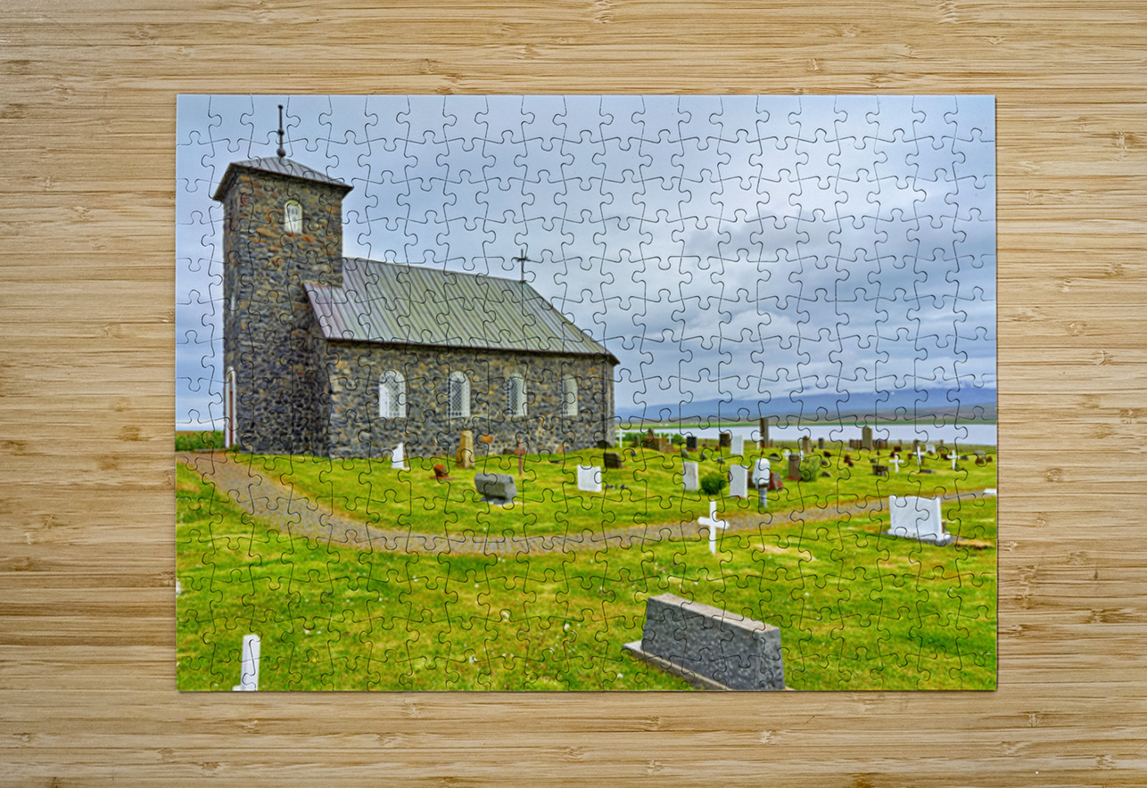 Tyngeyraklausturskirkja church stands near a graveyard by the coast. Clouds cover the sky as visitors explore the area.