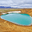 A geothermal lake sits in the Krafla volcanic area of Iceland. The surrounding land is bare with hints of volcanic activity visible nearby.