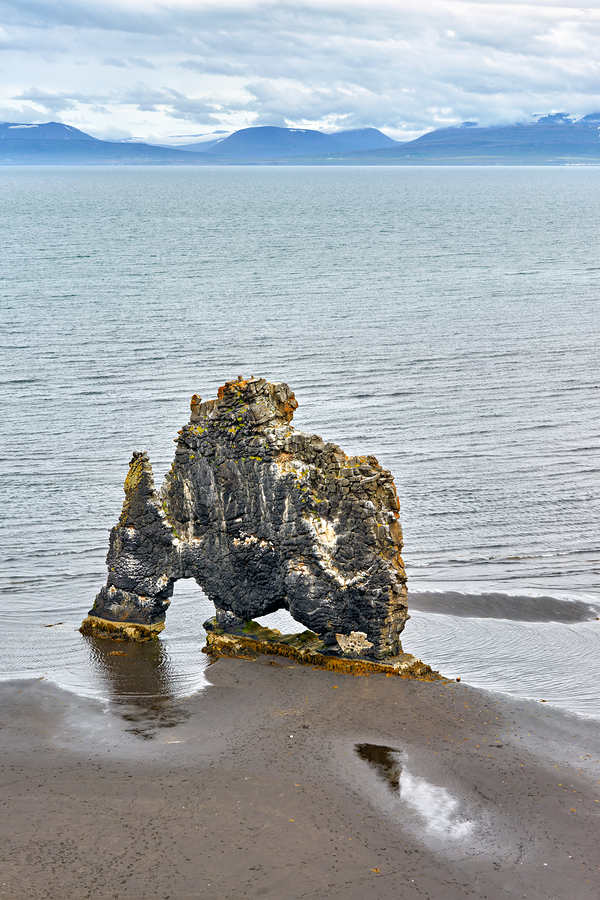 Hvitserkur rock formation stands tall by the water during low tide. The area shows sand and the calm sea around the rock at a cloudy time.