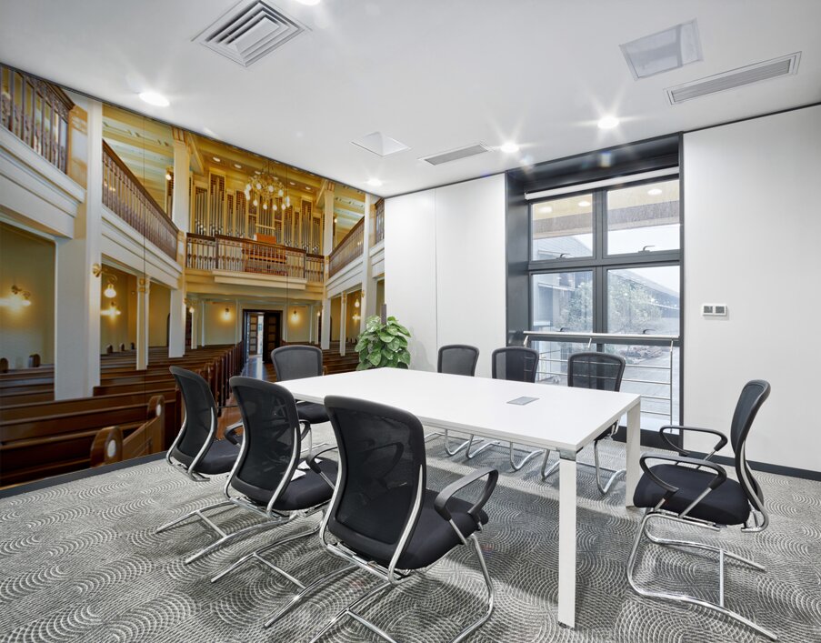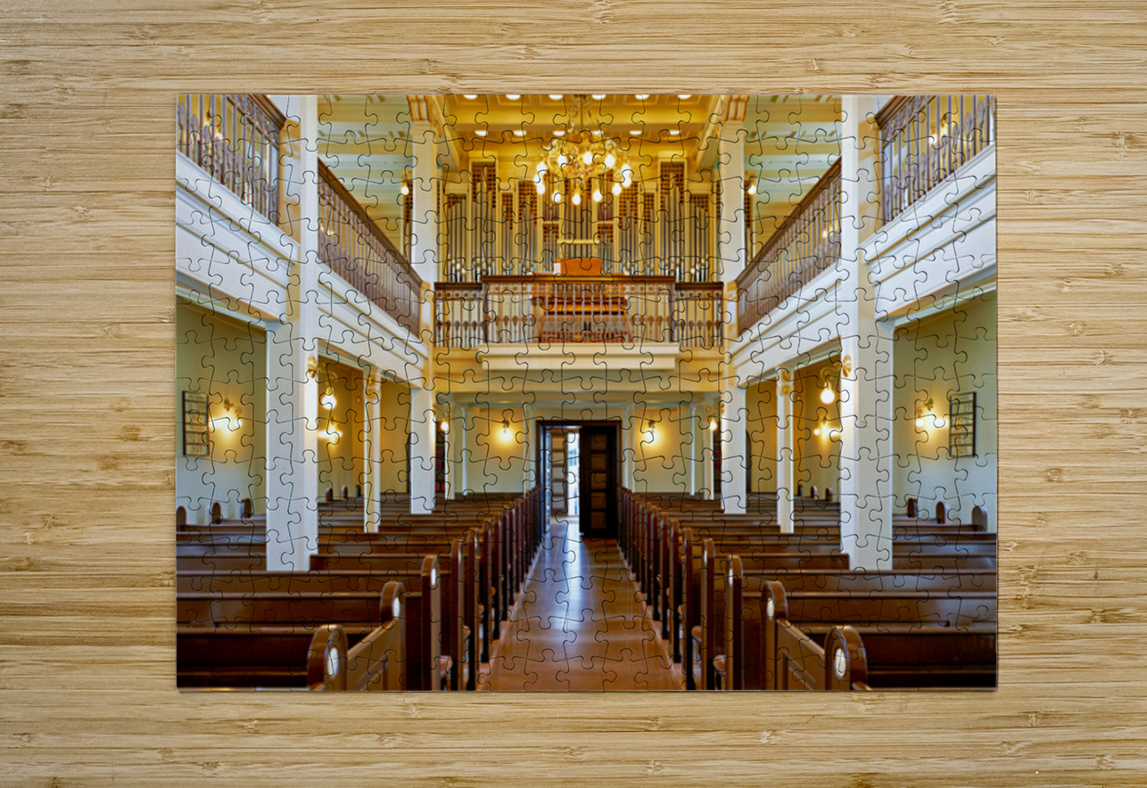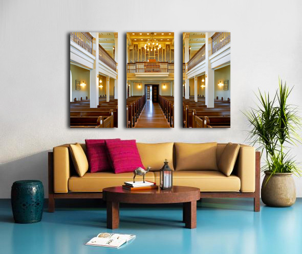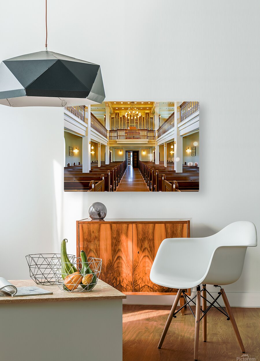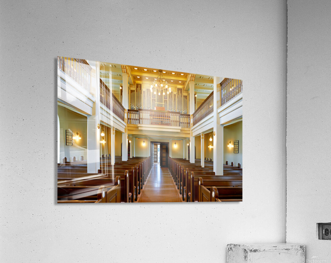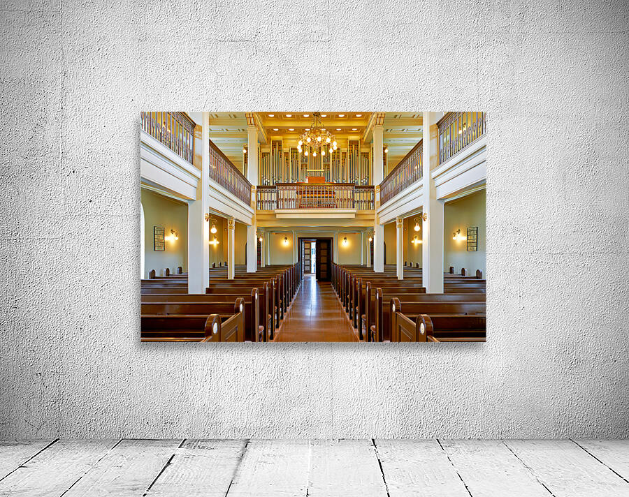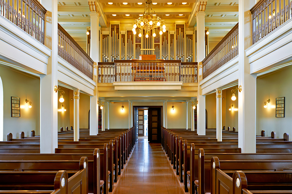 Inside Domkirkjan Church the benches are empty. Light comes in from the windows and the organ is visible above.