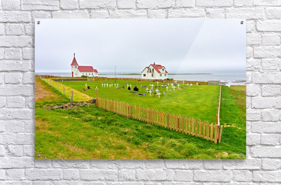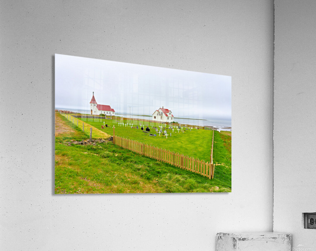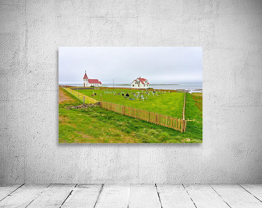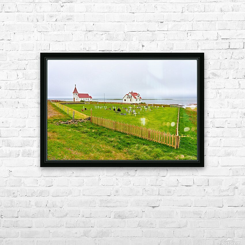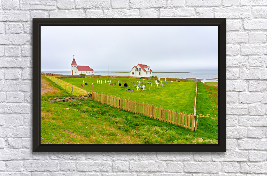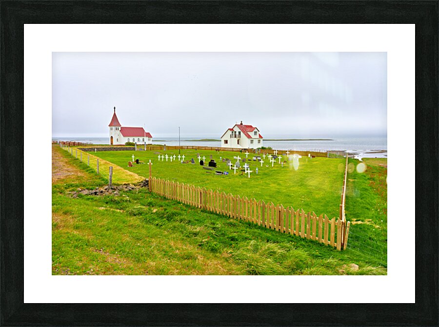 "Prestbakkakirkja church and graveyard in Iceland by the sea" in a framed print.