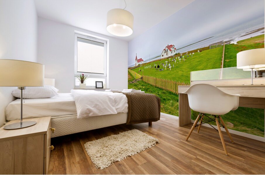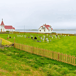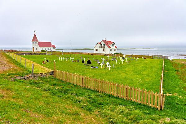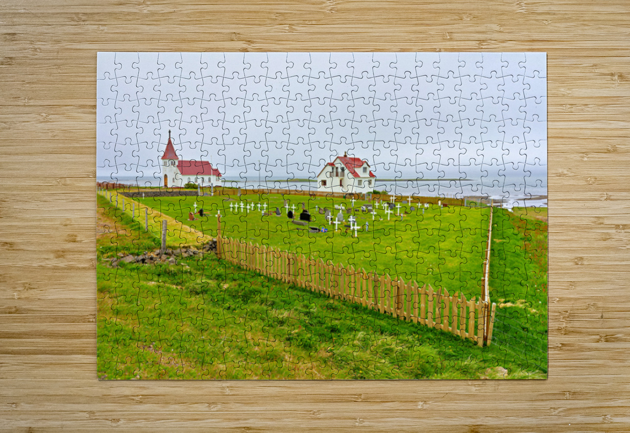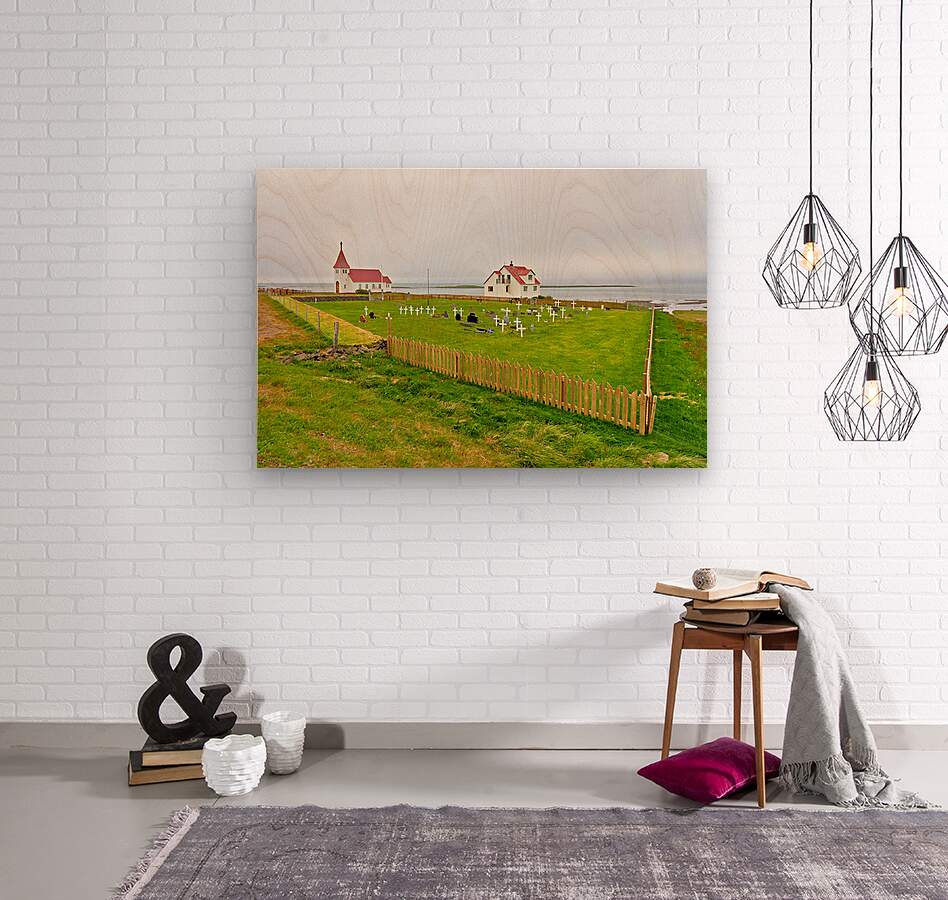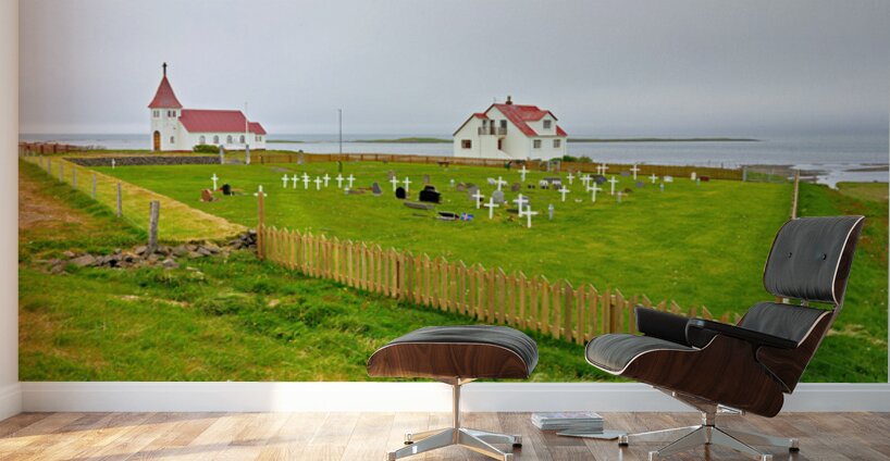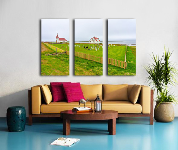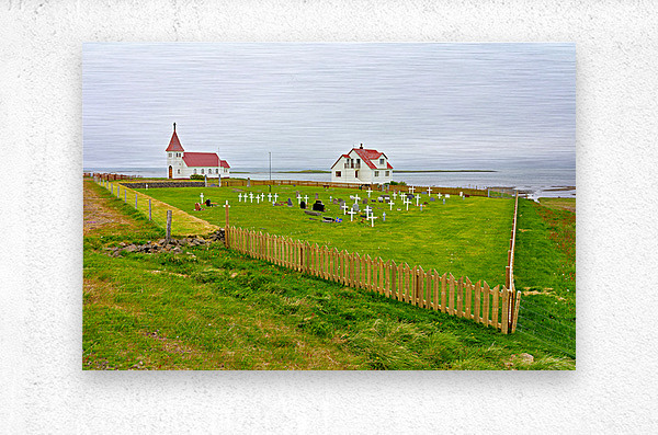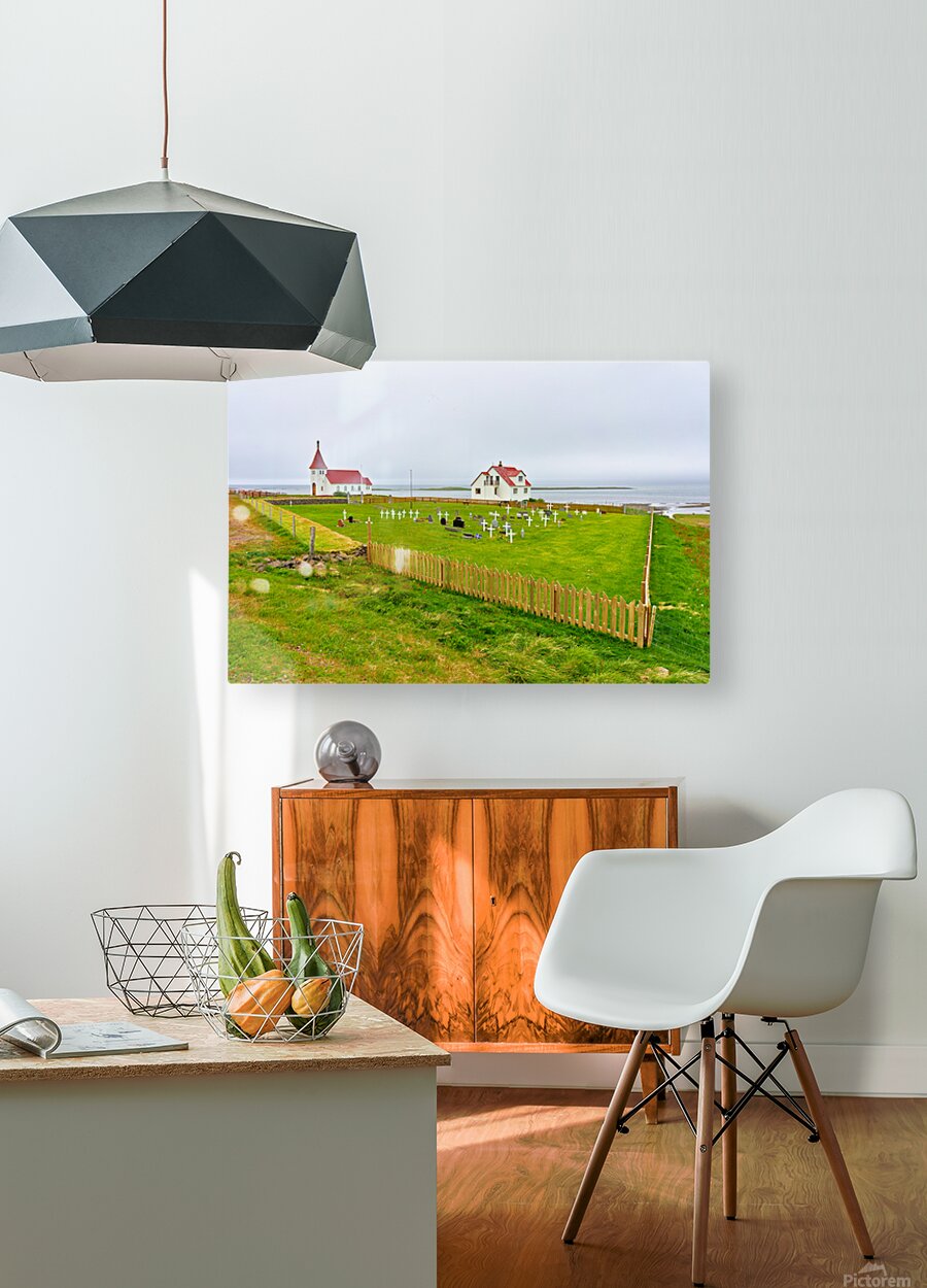 "Prestbakkakirkja church and graveyard in Iceland by the sea" in a framed print.