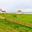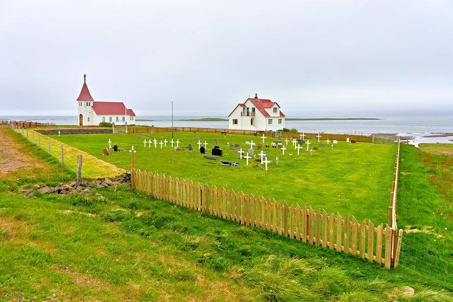 Prestbakkakirkja church stands next to a graveyard with white crosses. The area is near the ocean under cloudy skies.