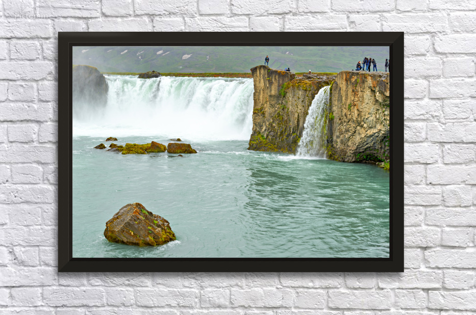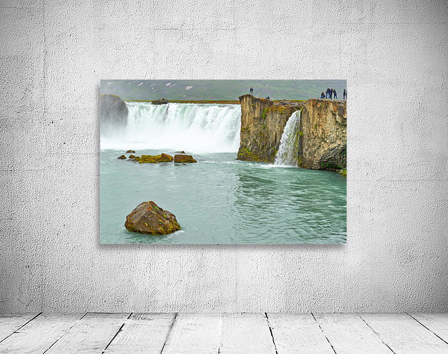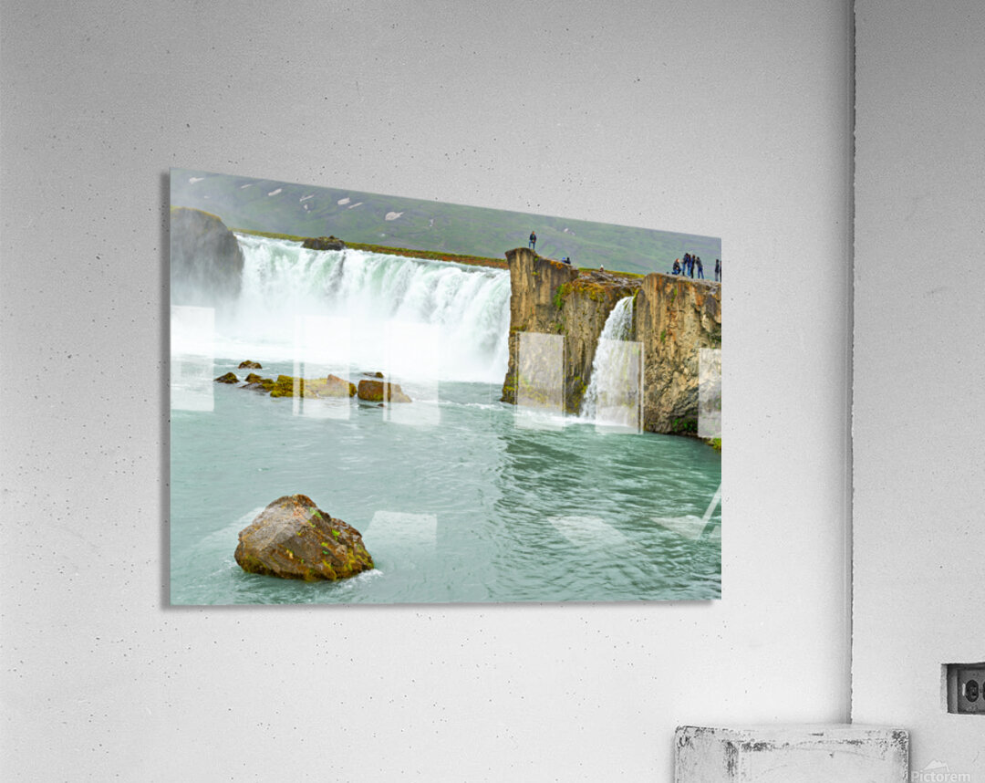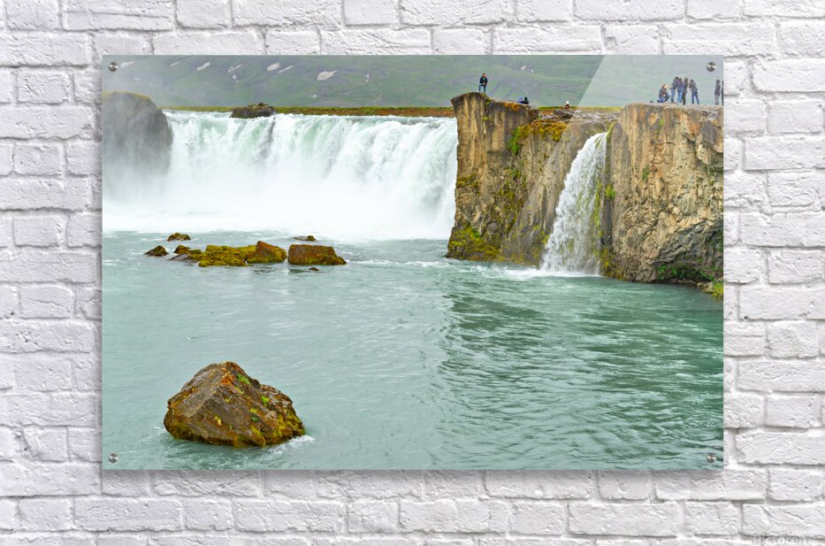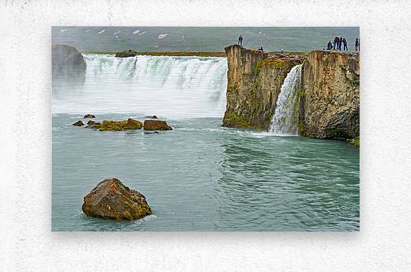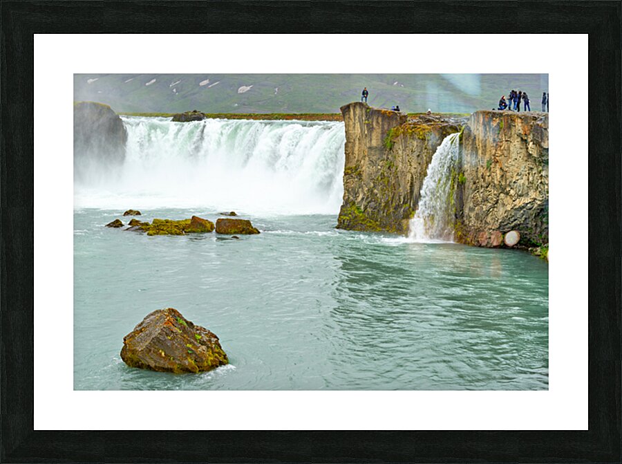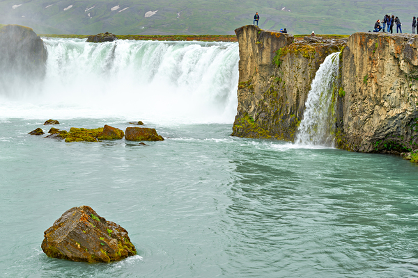 Water flows over the edge of Godafoss Waterfall in Iceland. People explore the area enjoying the view and taking photos of the waterfall.
