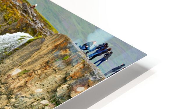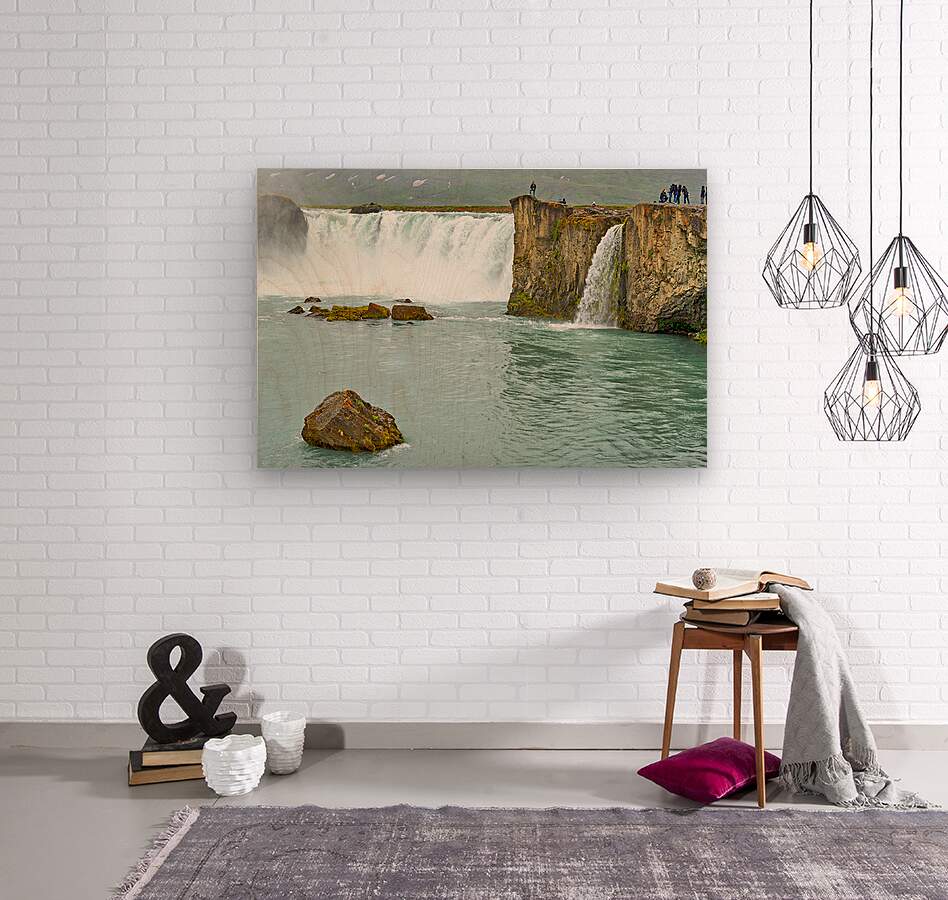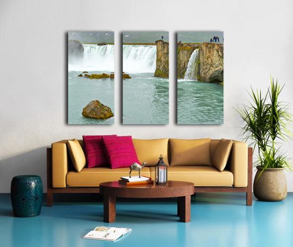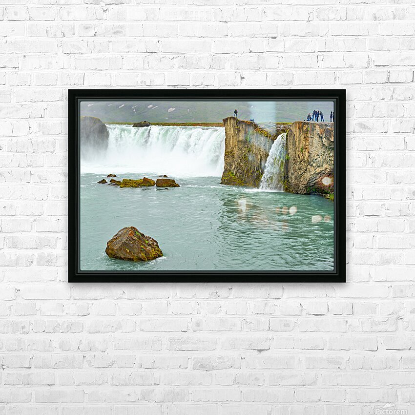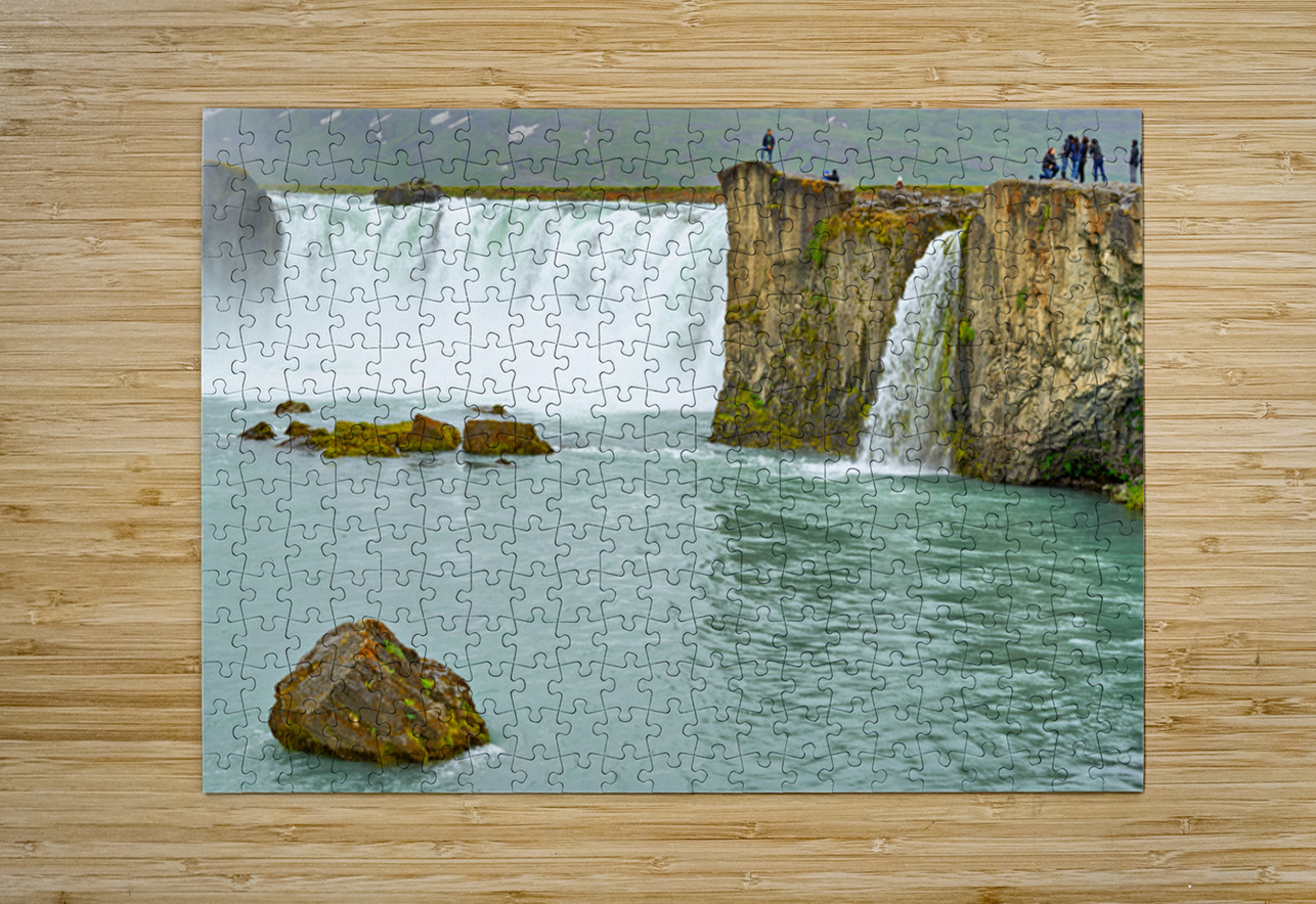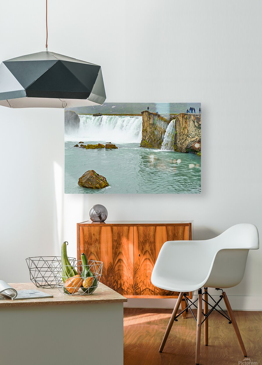 Water flows over the edge of Godafoss Waterfall in Iceland. People explore the area enjoying the view and taking photos of the waterfall.