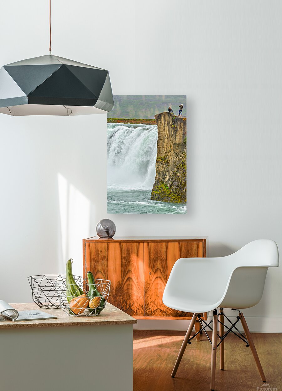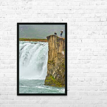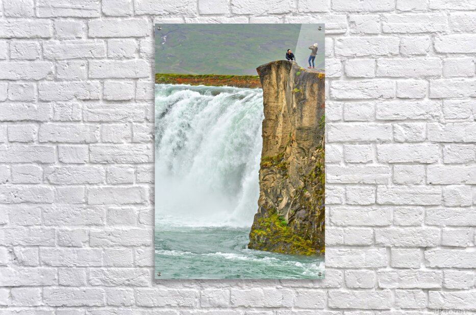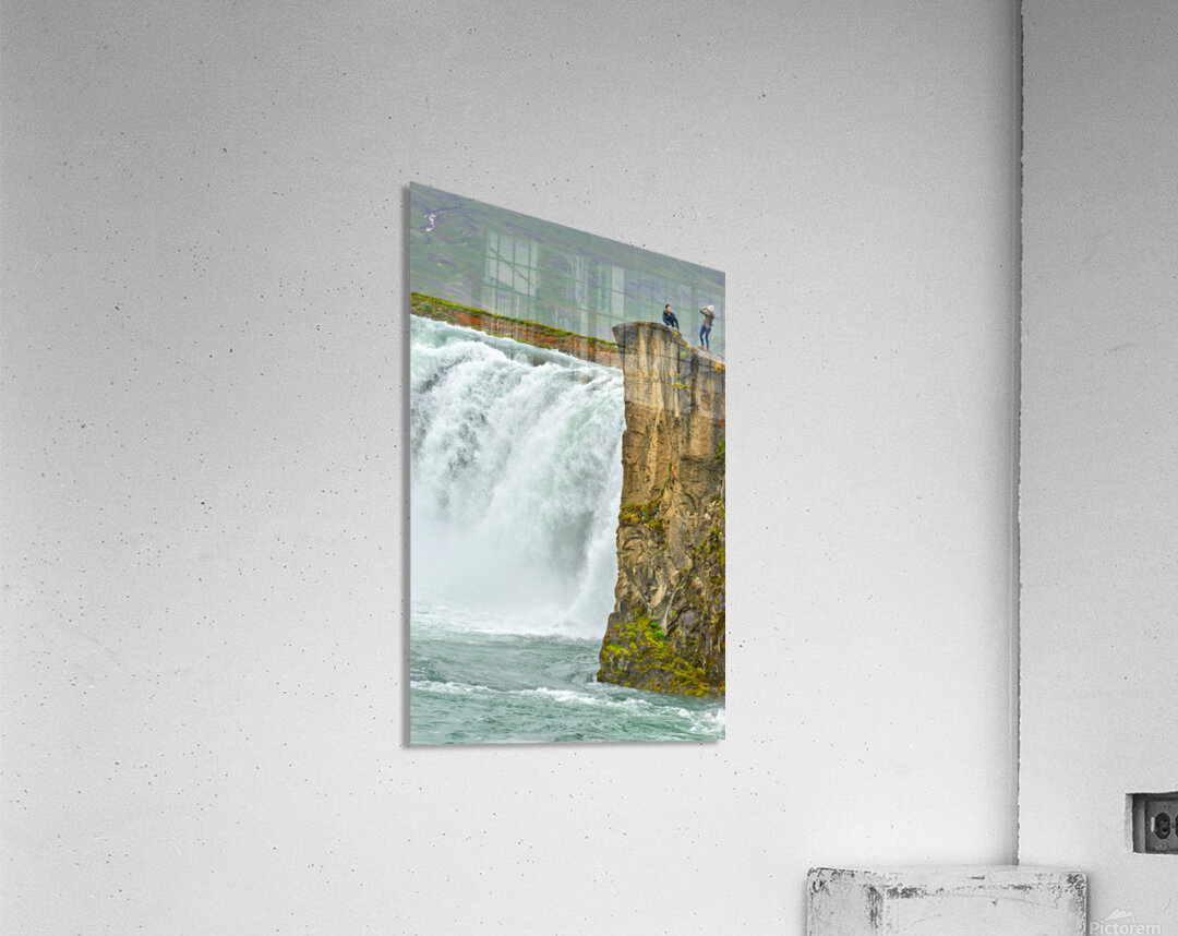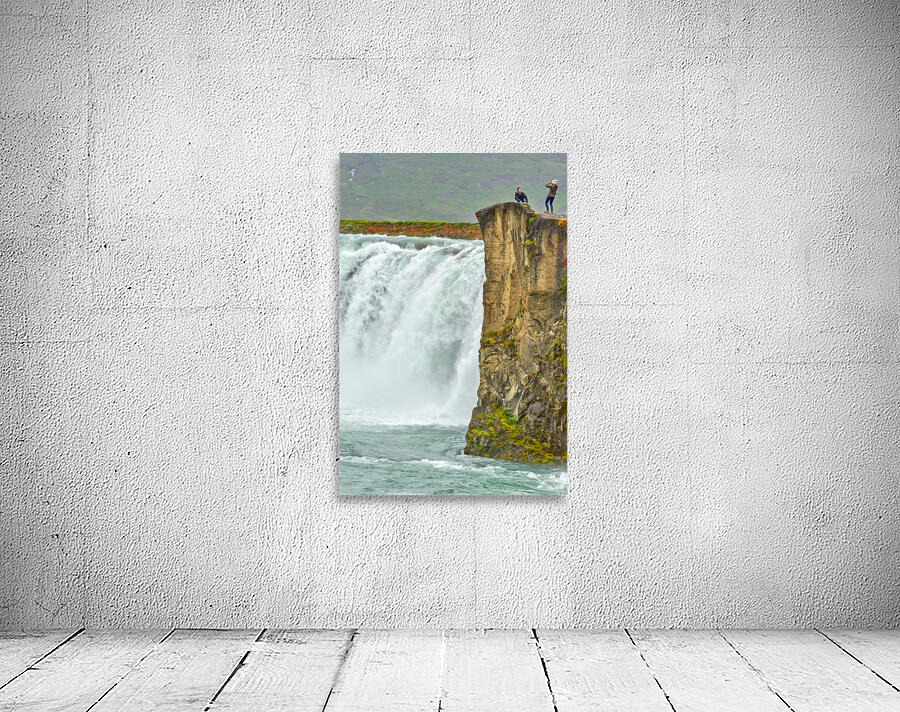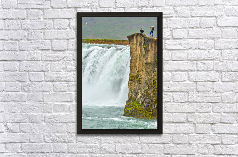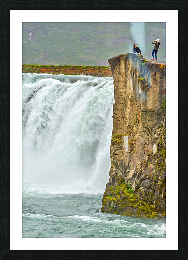 Visitors look over the edge of Godafoss waterfall in Iceland. The water flows powerfully creating a mighty scene in nature.