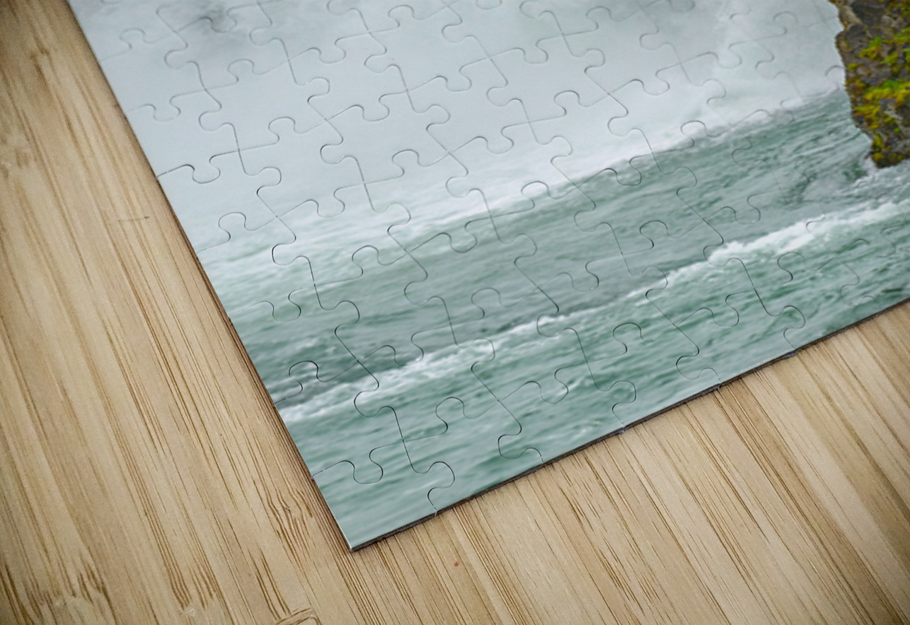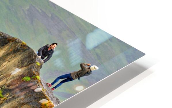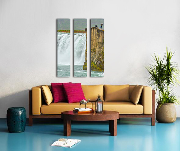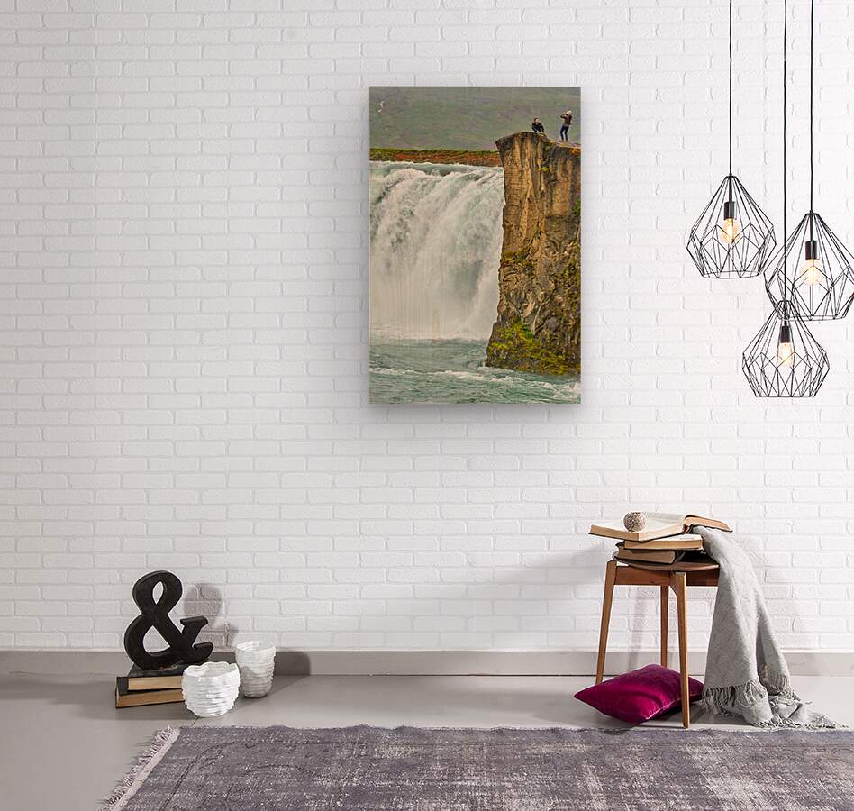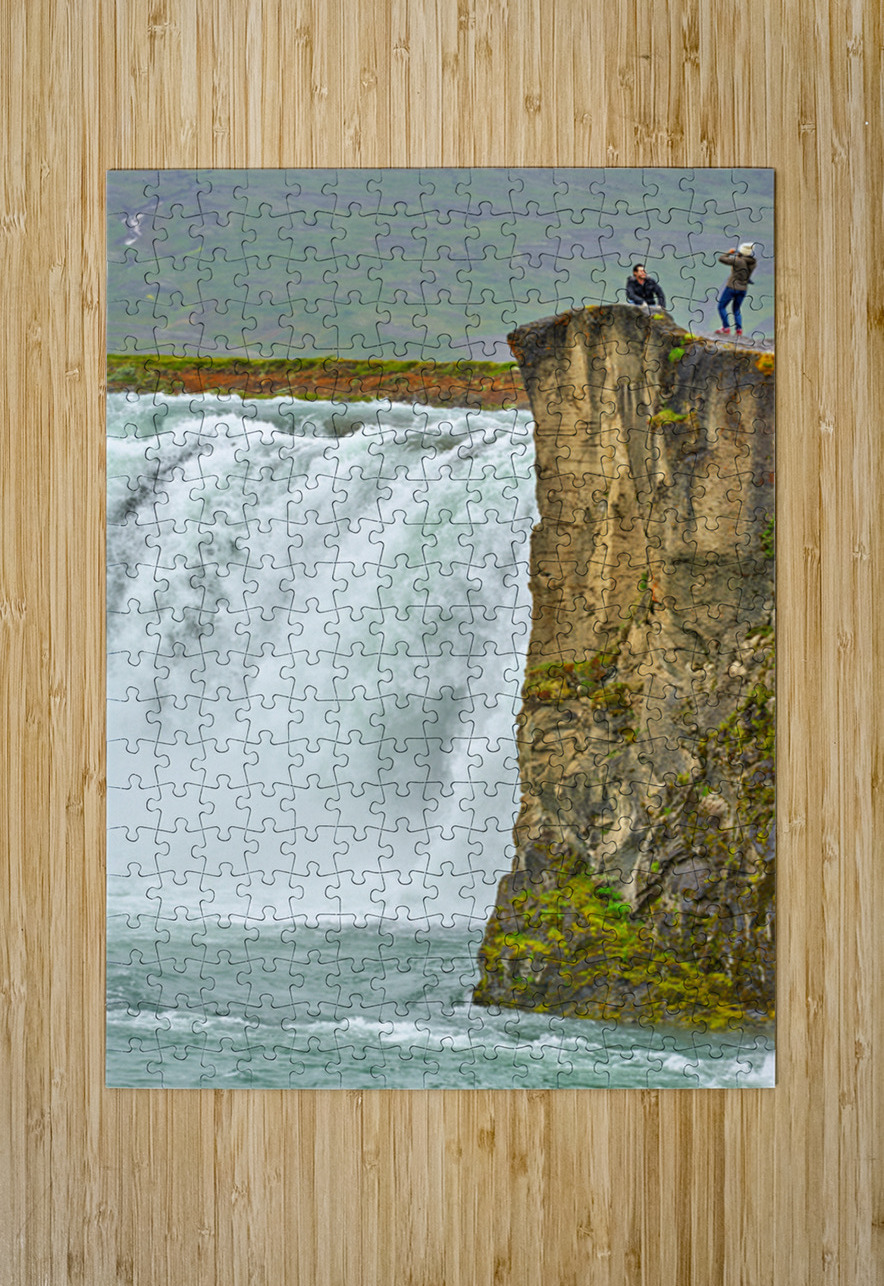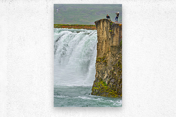Visitors look over the edge of Godafoss waterfall in Iceland. The water flows powerfully creating a mighty scene in nature.