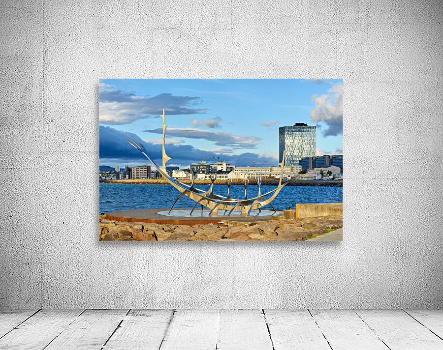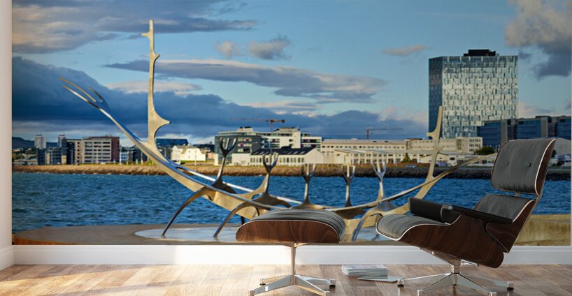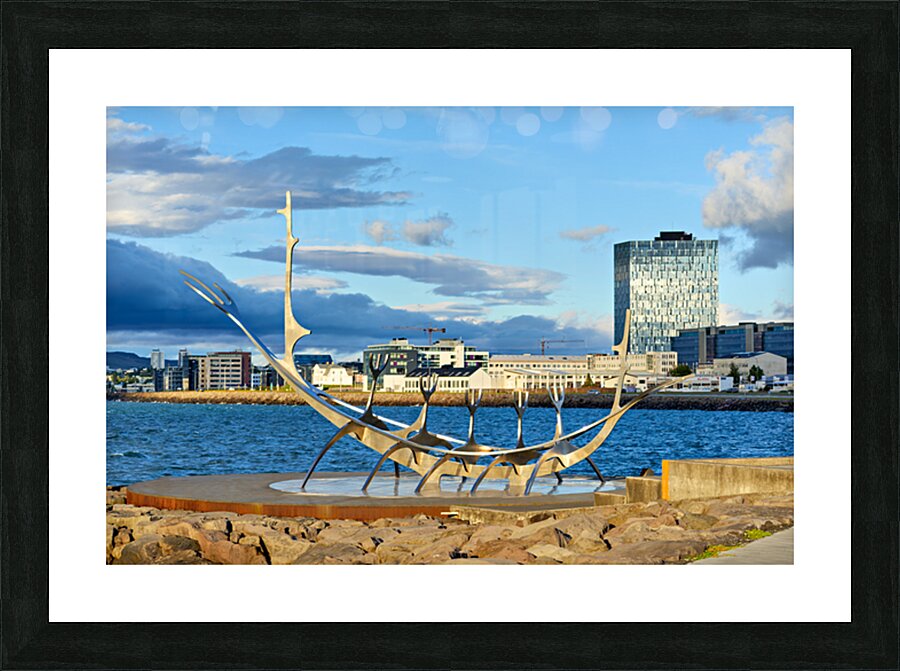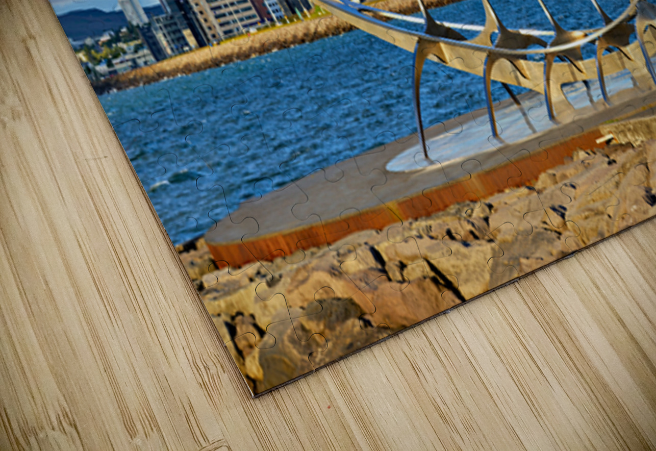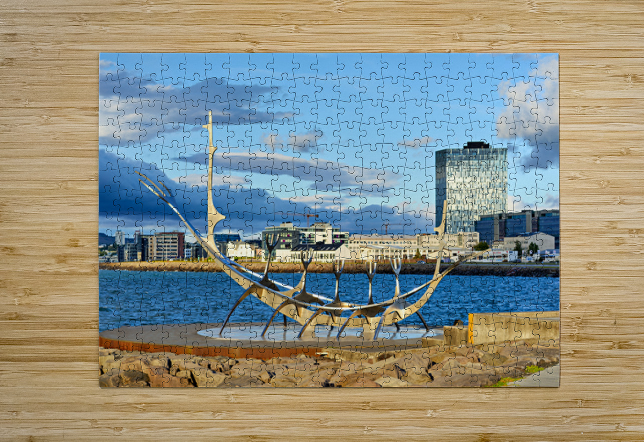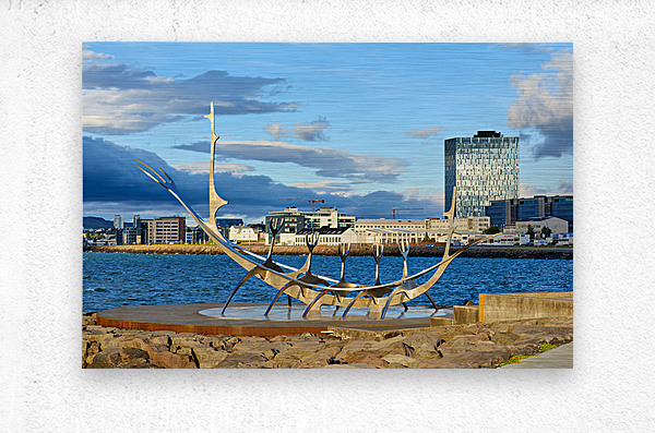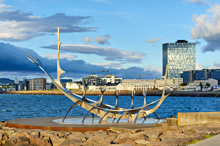 The Sun Voyager sculpture in Reykjavik near the water while the city skyline is displayed against the sky.