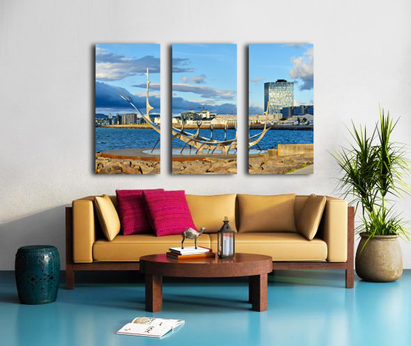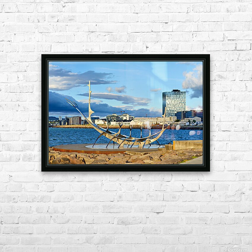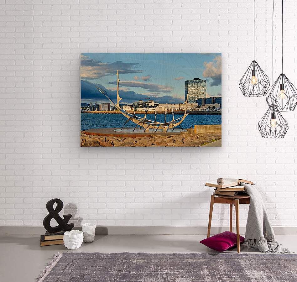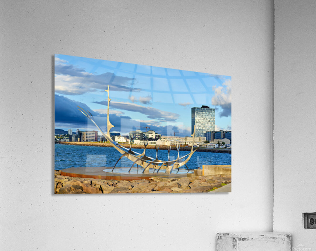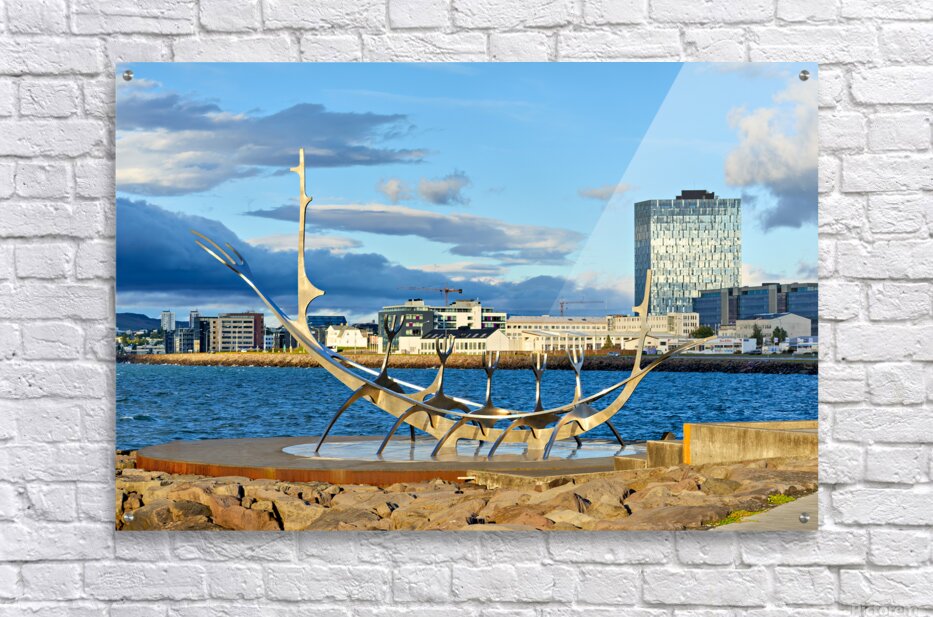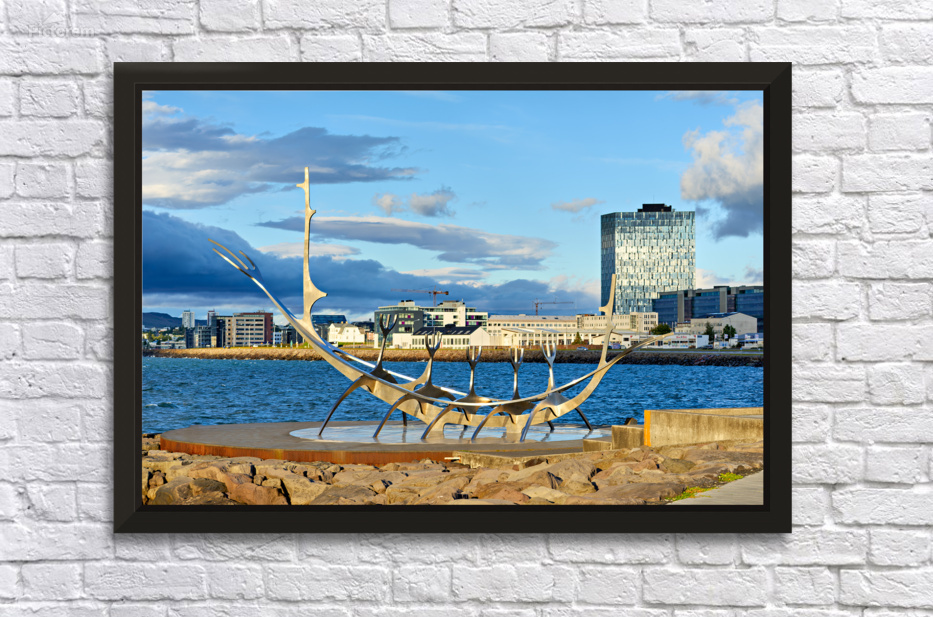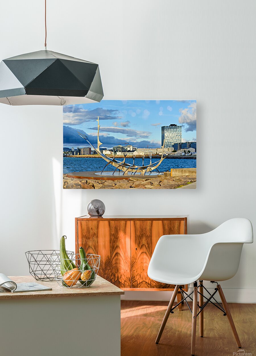 The Sun Voyager sculpture in Reykjavik near the water while the city skyline is displayed against the sky.