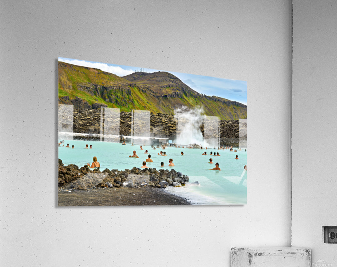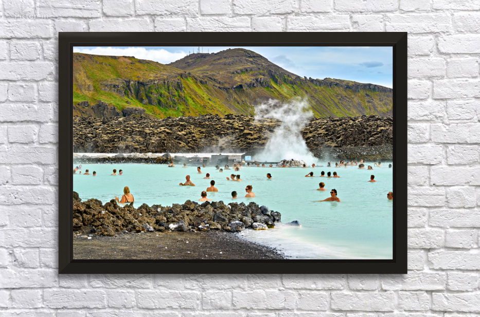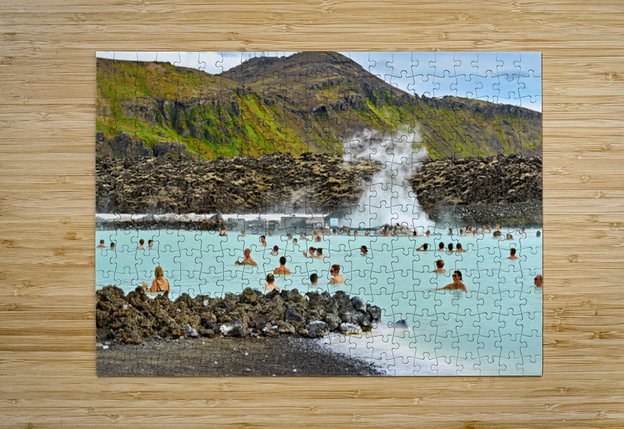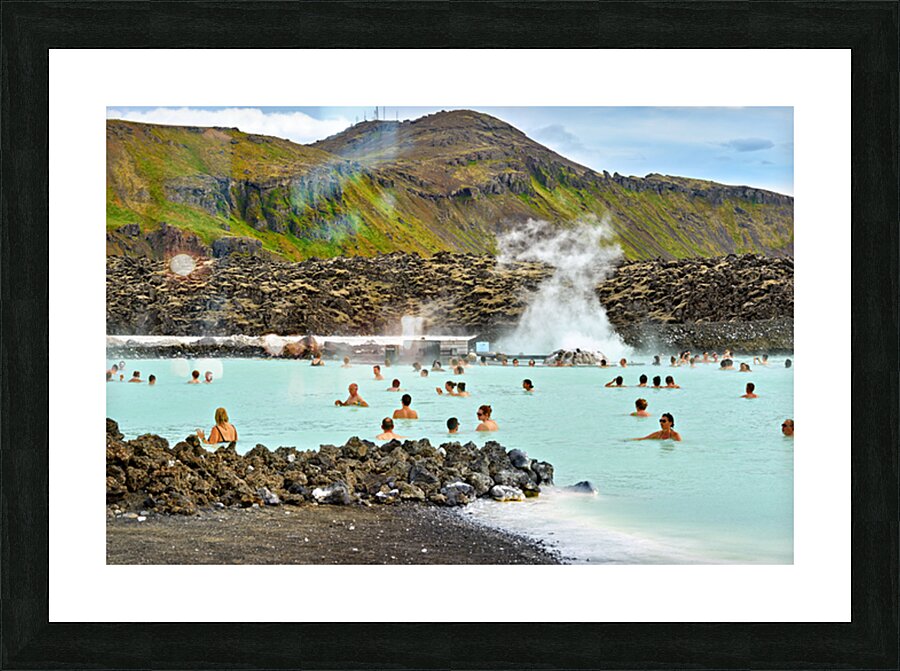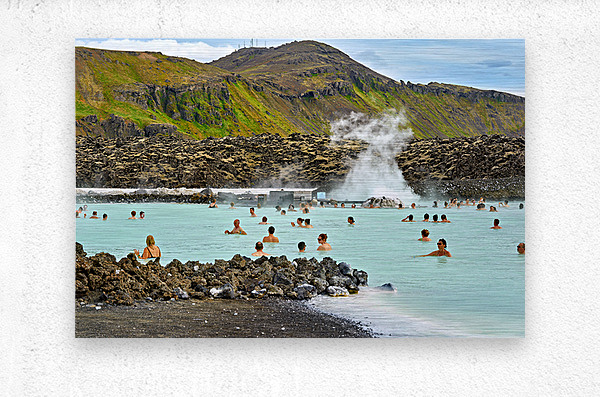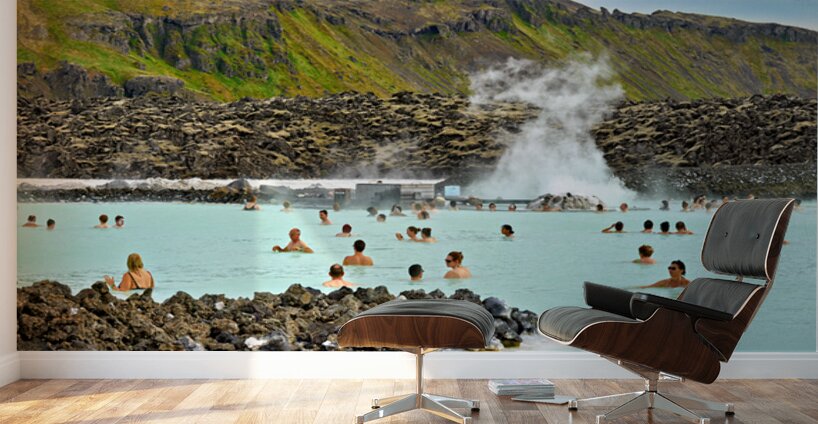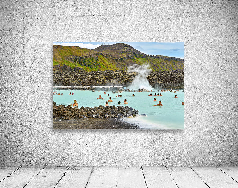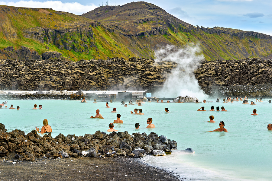 People enjoy bathing in the warm water of Blue Lagoon Spa in Grindavik Iceland. Steam rises from the water as visitors relax.