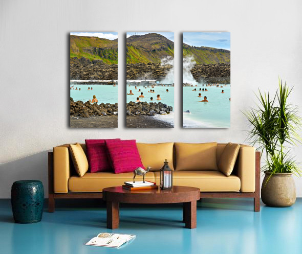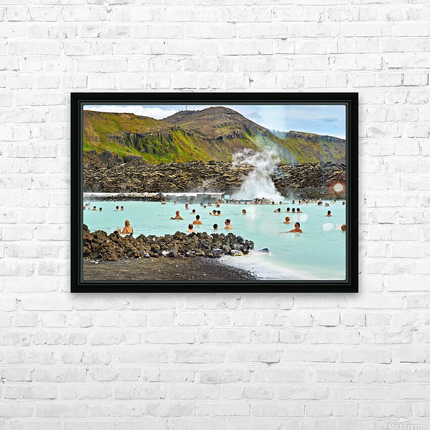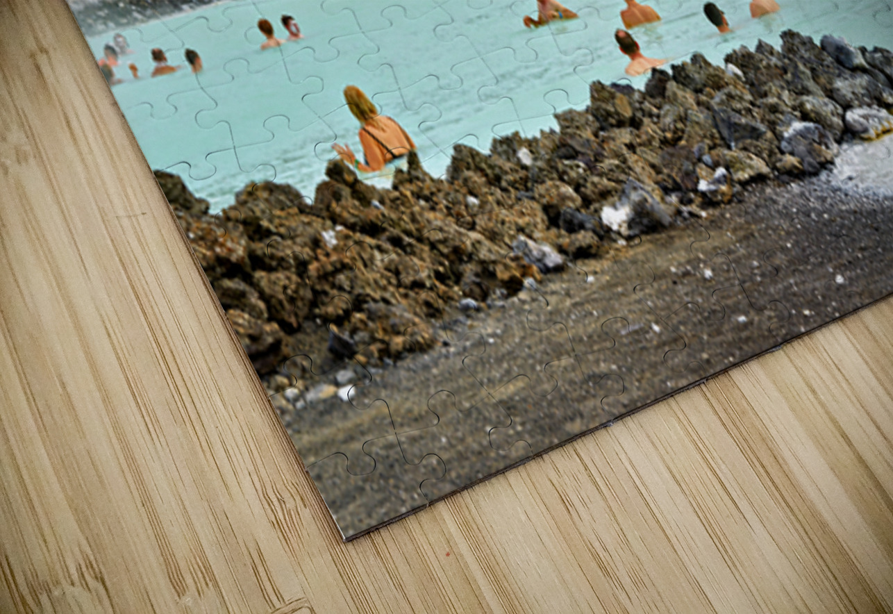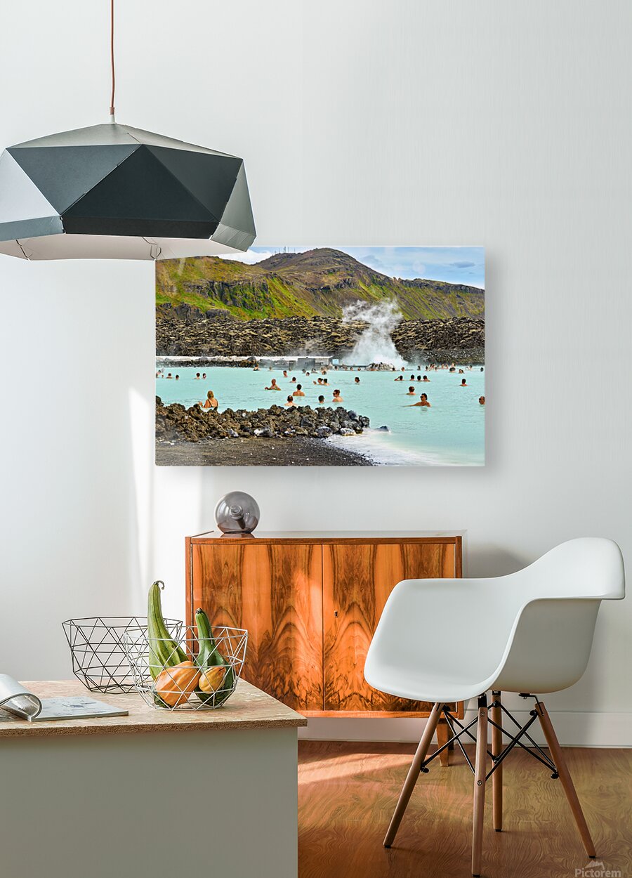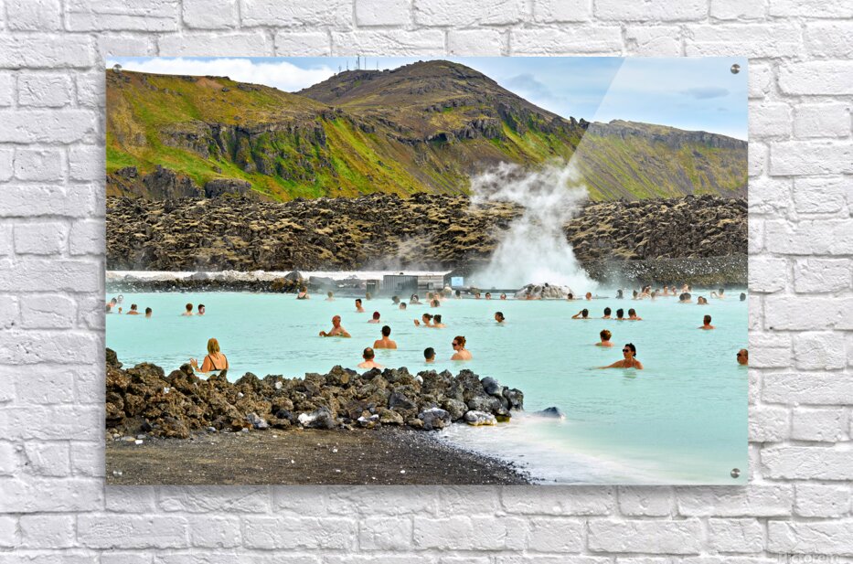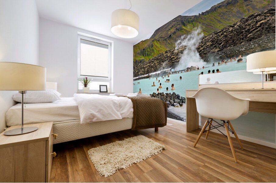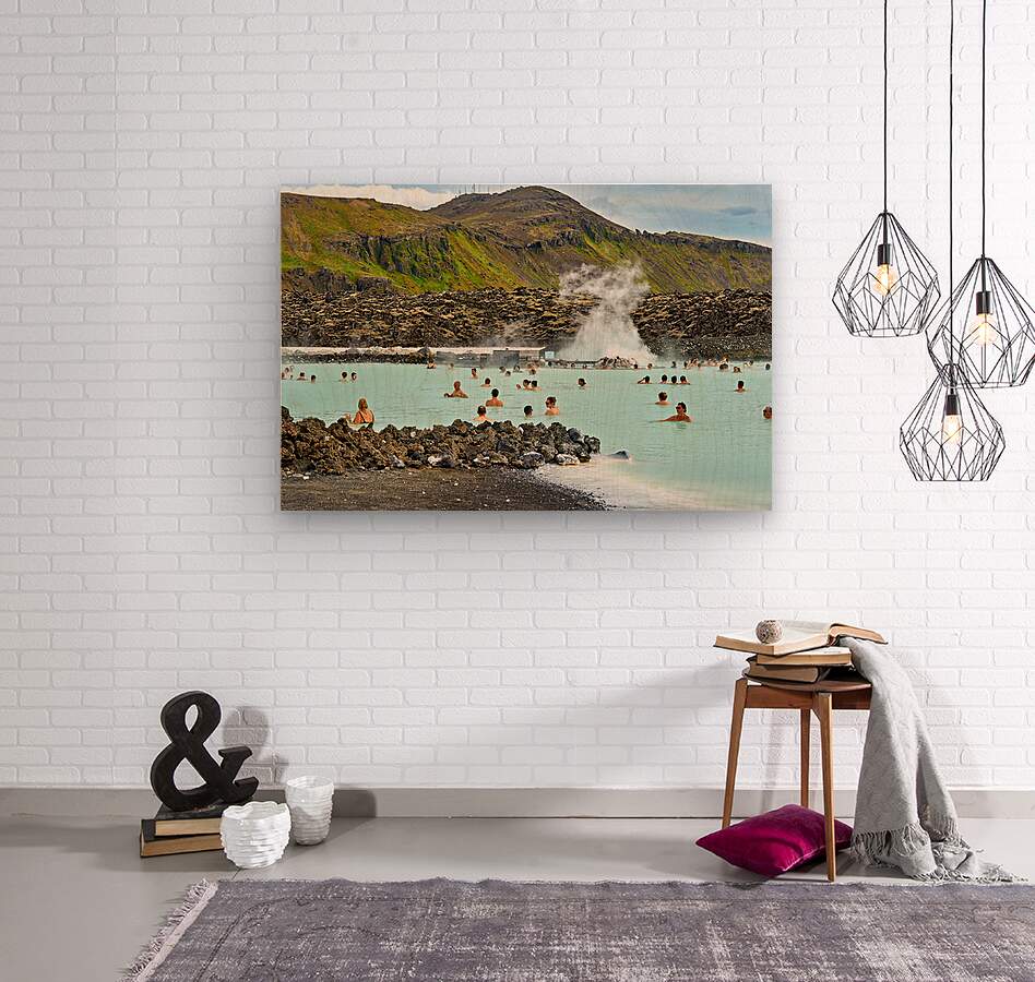 People enjoy bathing in the warm water of Blue Lagoon Spa in Grindavik Iceland. Steam rises from the water as visitors relax.