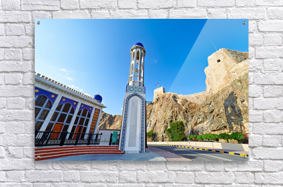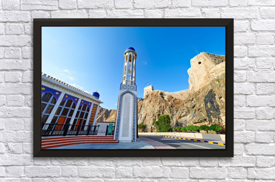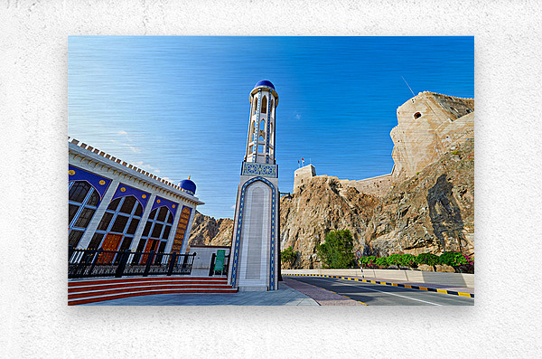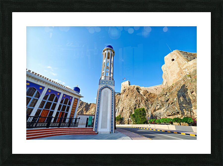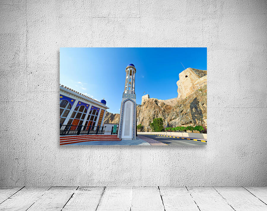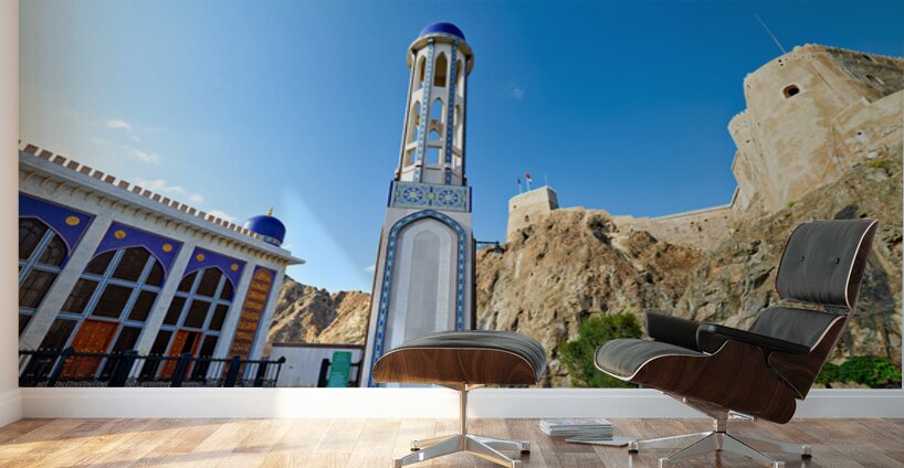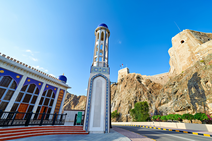 People walk near Al Khor mosque in Muscat Oman. The old fort stands on the hill in the background under a clear sky.