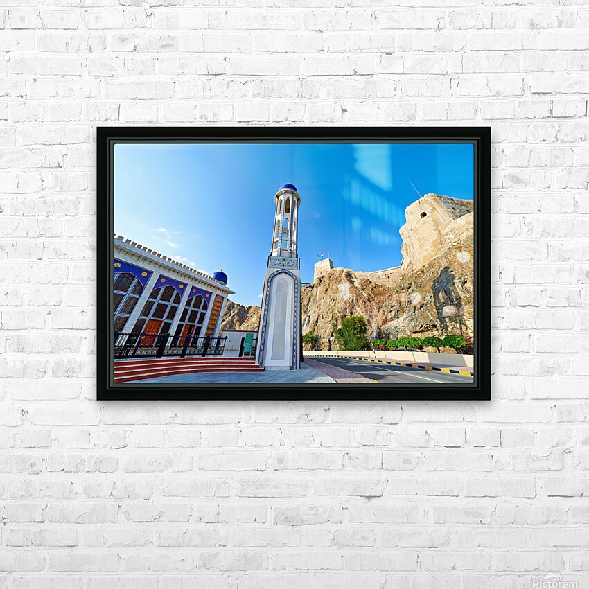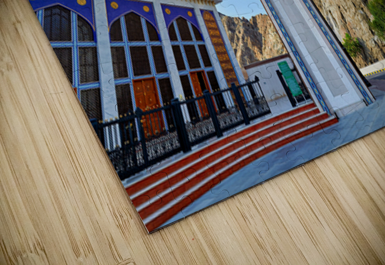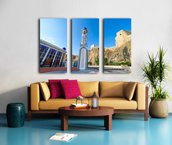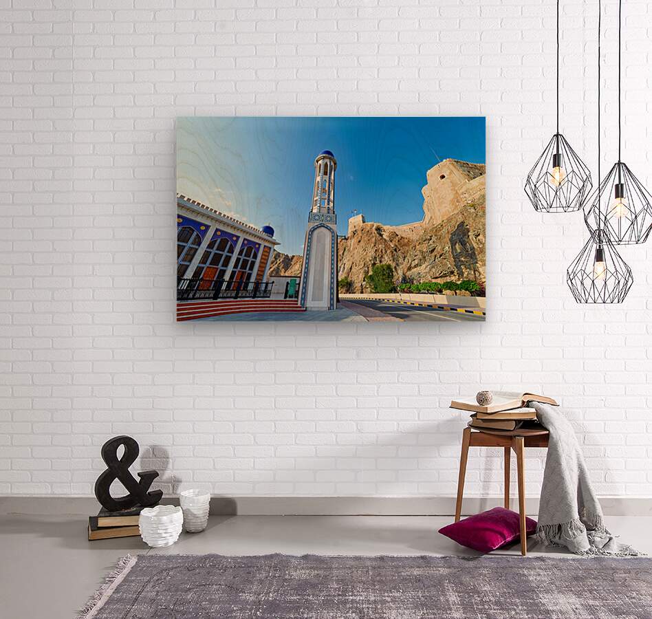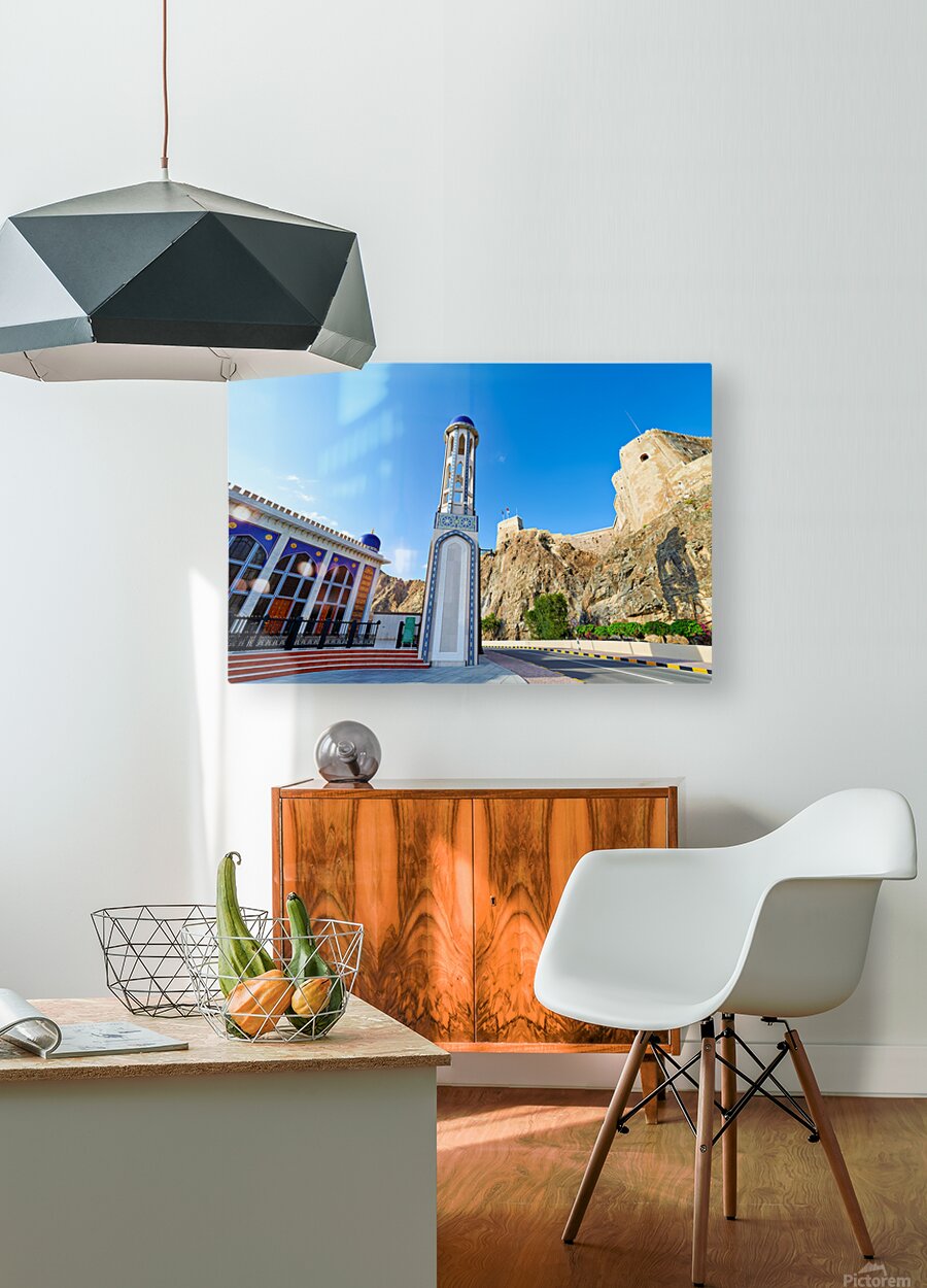 People walk near Al Khor mosque in Muscat Oman. The old fort stands on the hill in the background under a clear sky.