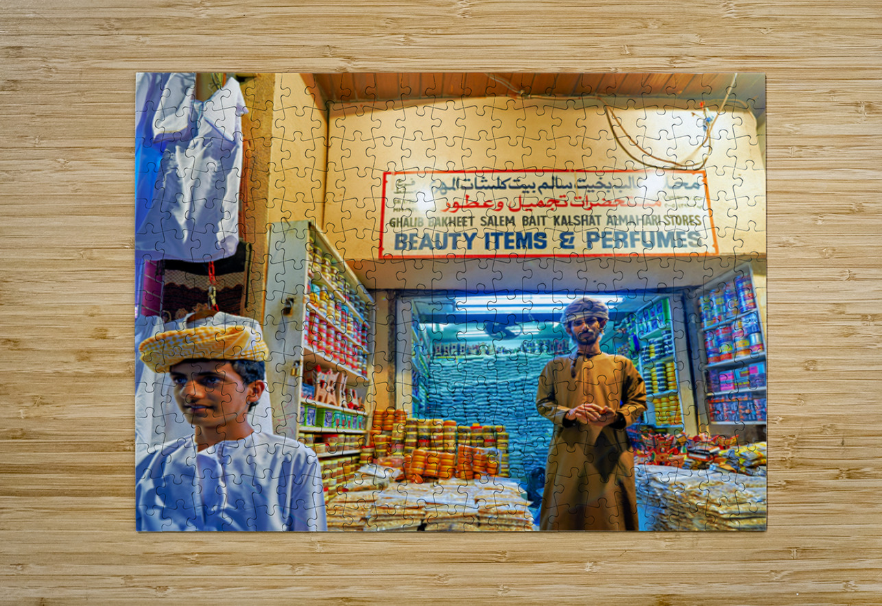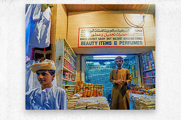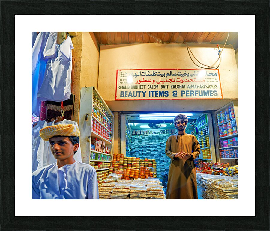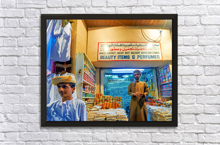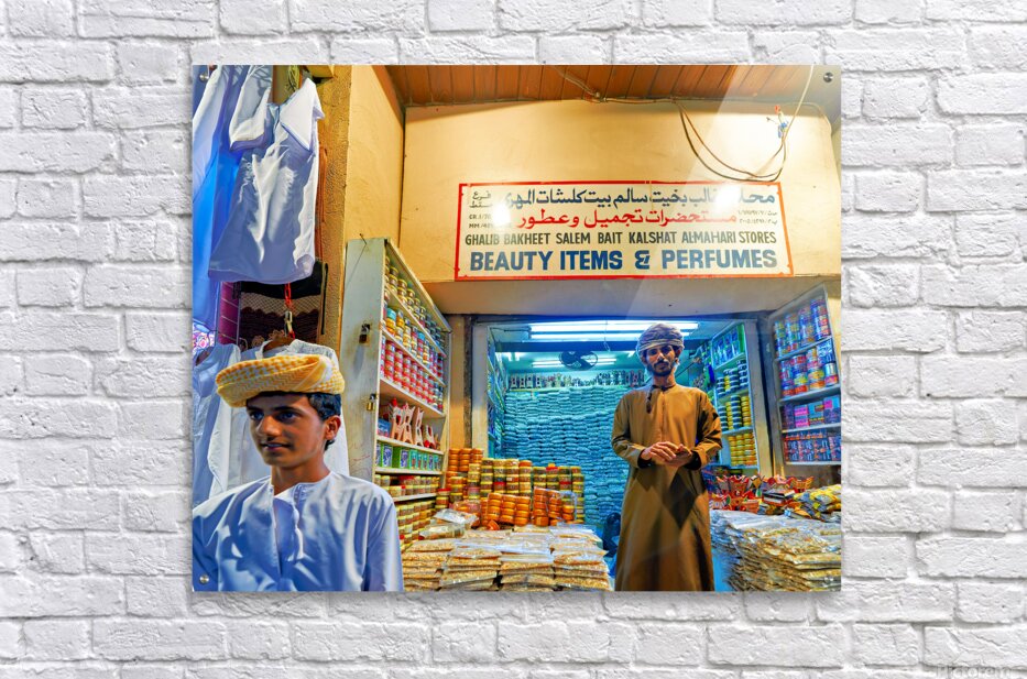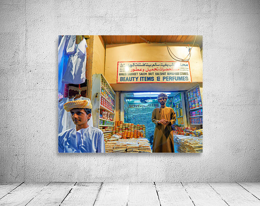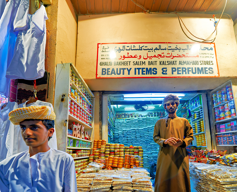 People shop for beauty items and perfumes at a store in Mutrah Souq in Muscat Oman during the evening hours.