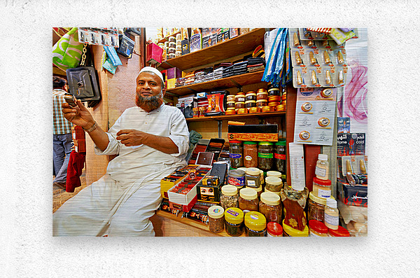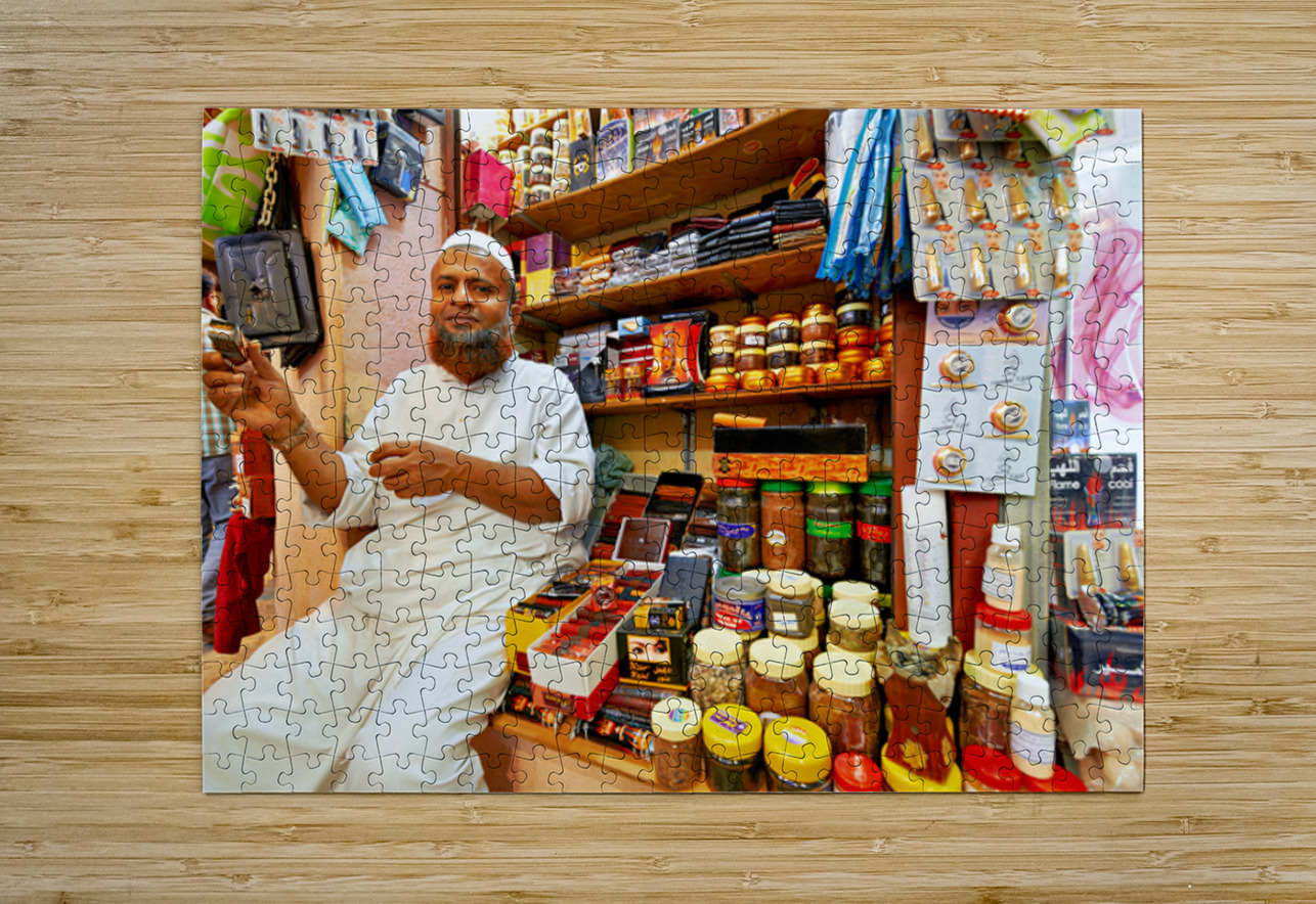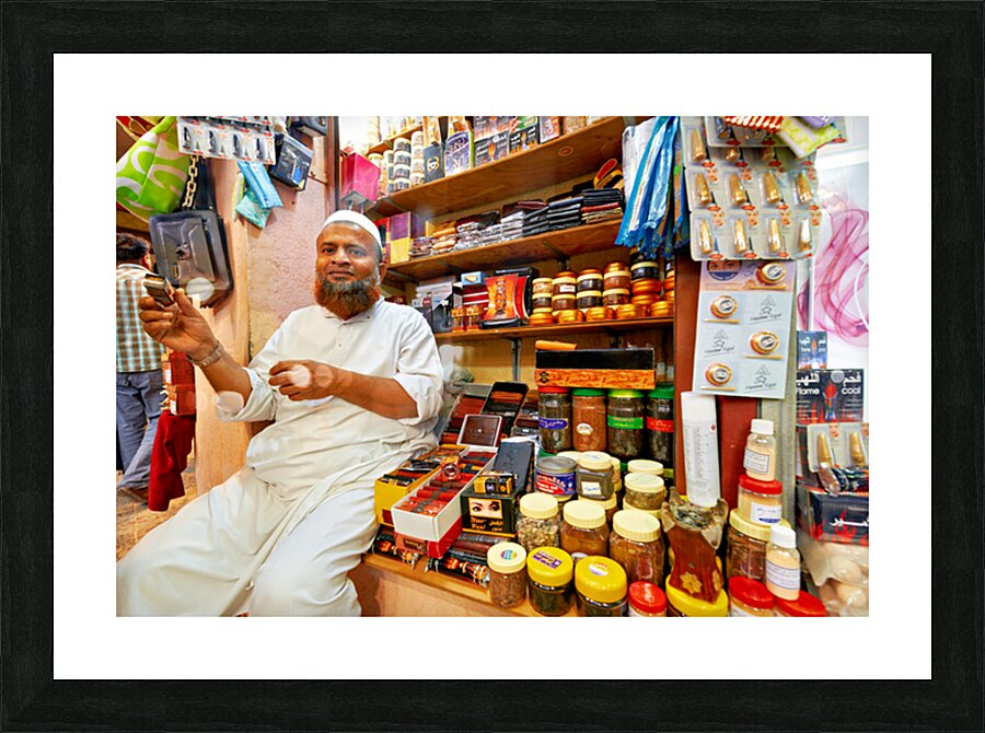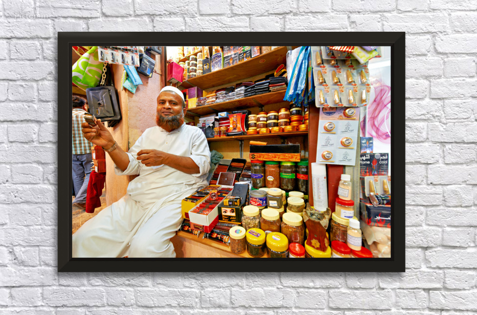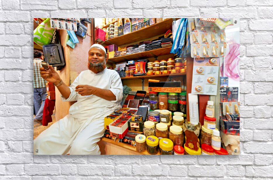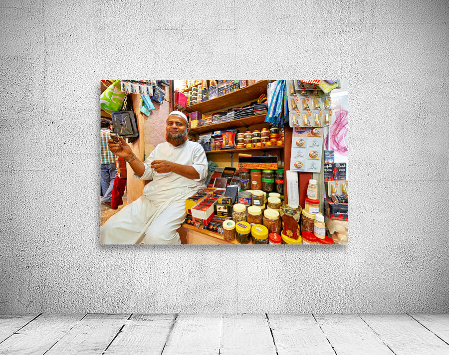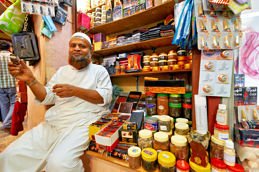 A shopkeeper waits in Mutrah Souq selling spices dates and other goods. The market is busy with travelers and local shoppers.