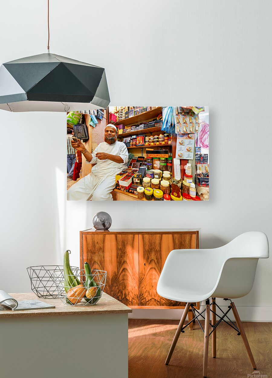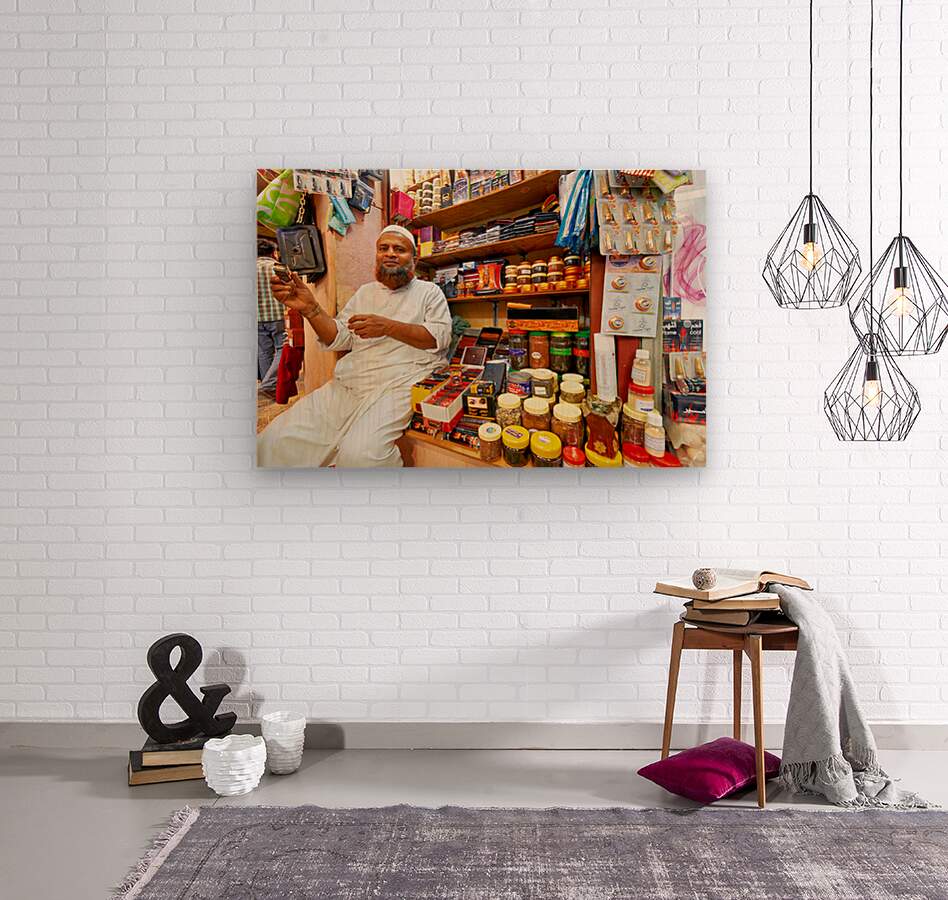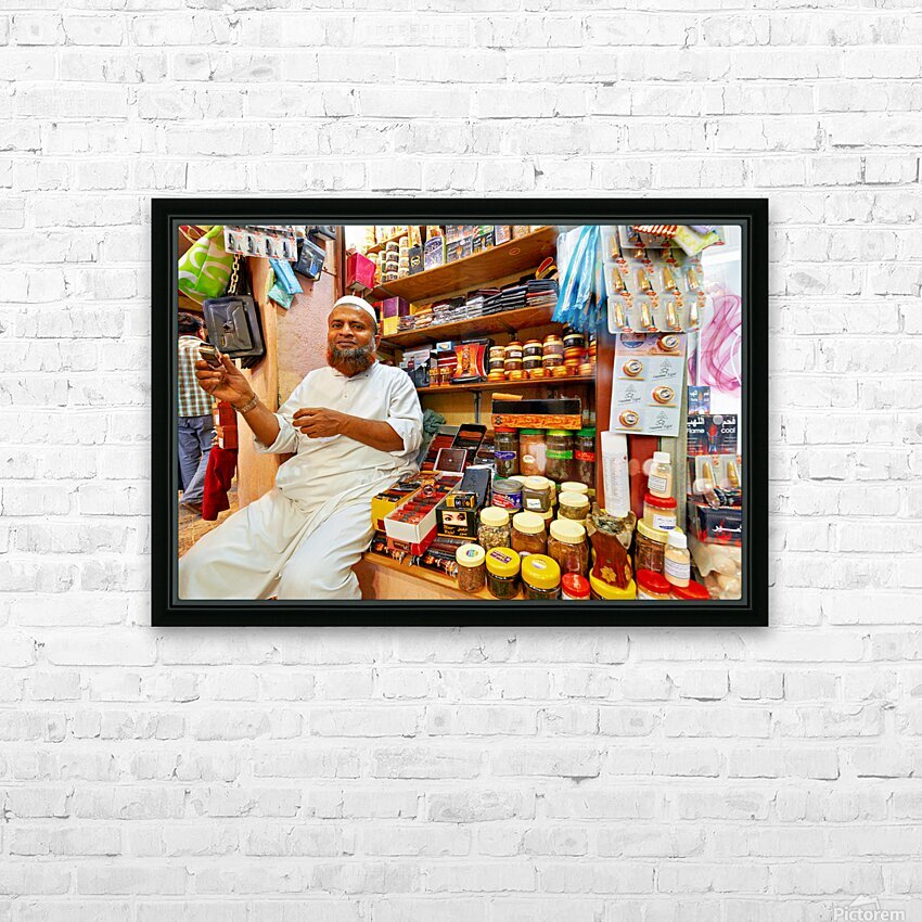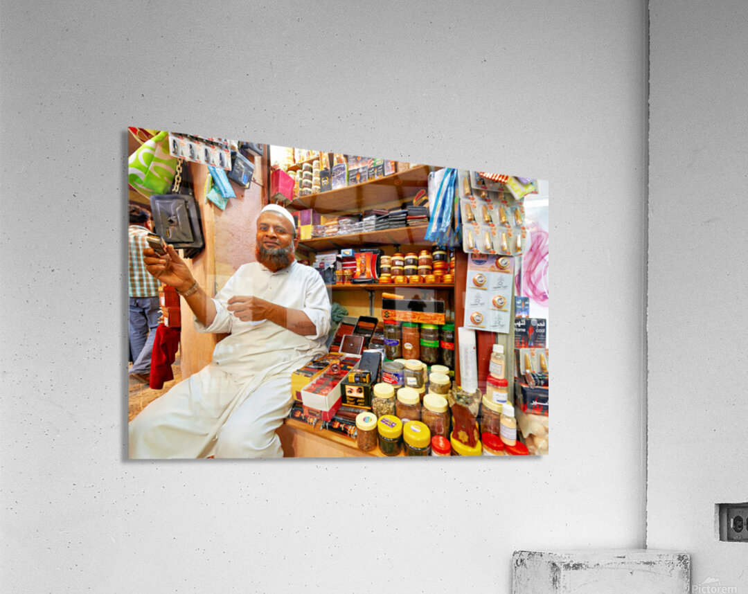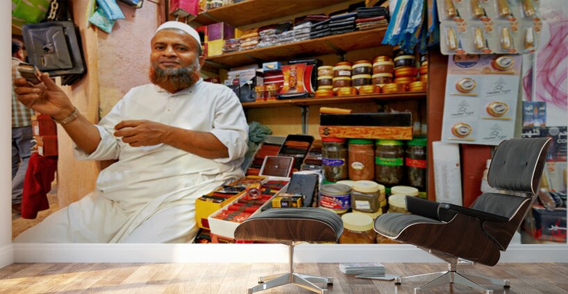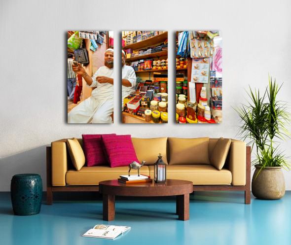 A shopkeeper waits in Mutrah Souq selling spices dates and other goods. The market is busy with travelers and local shoppers.