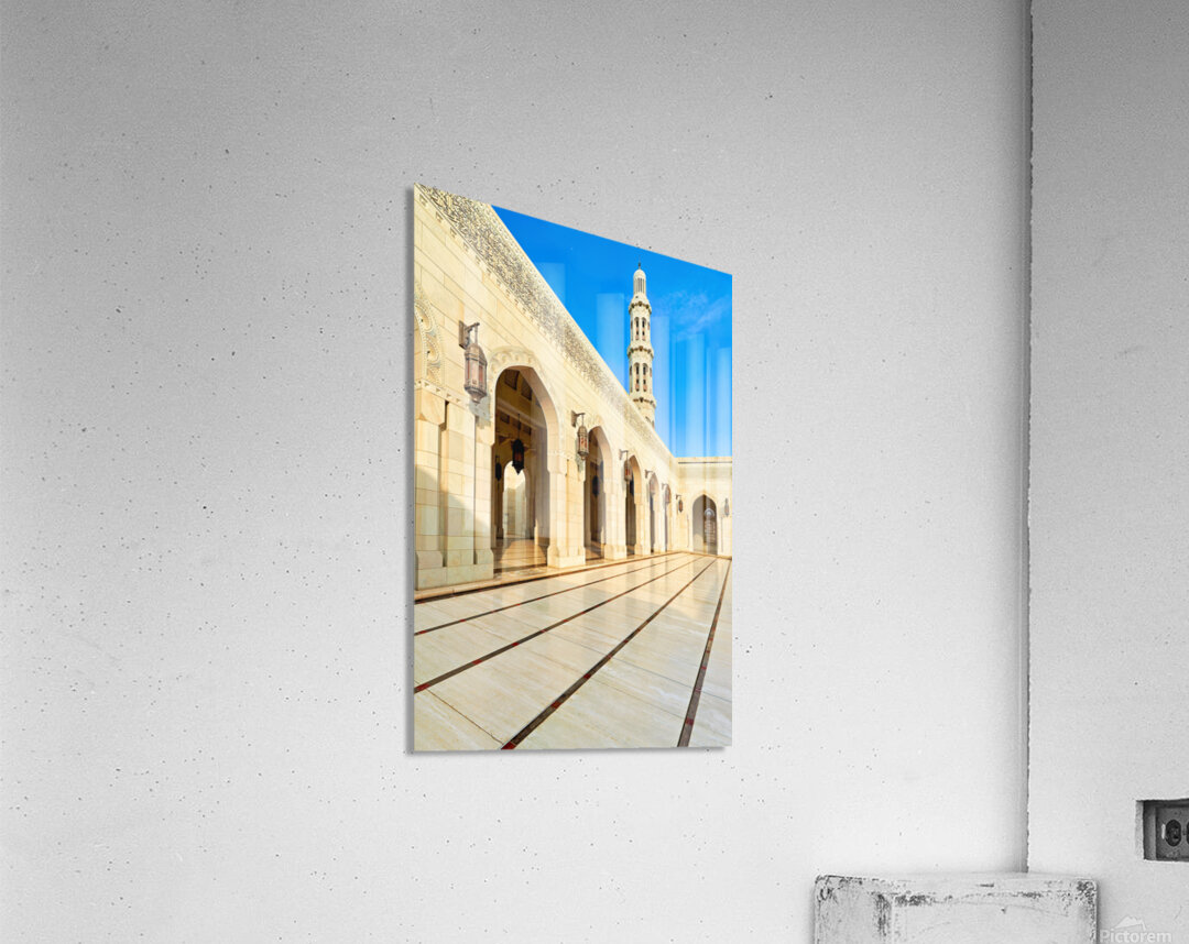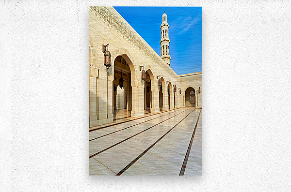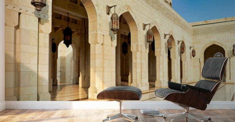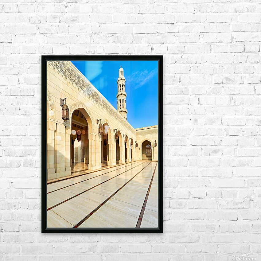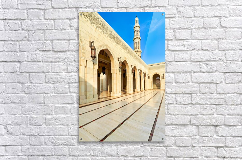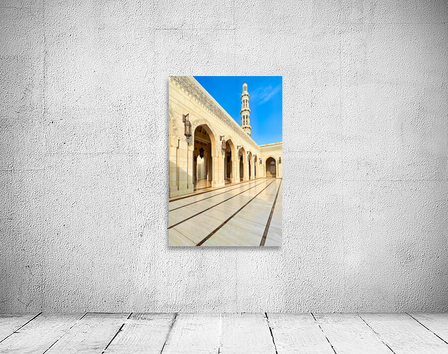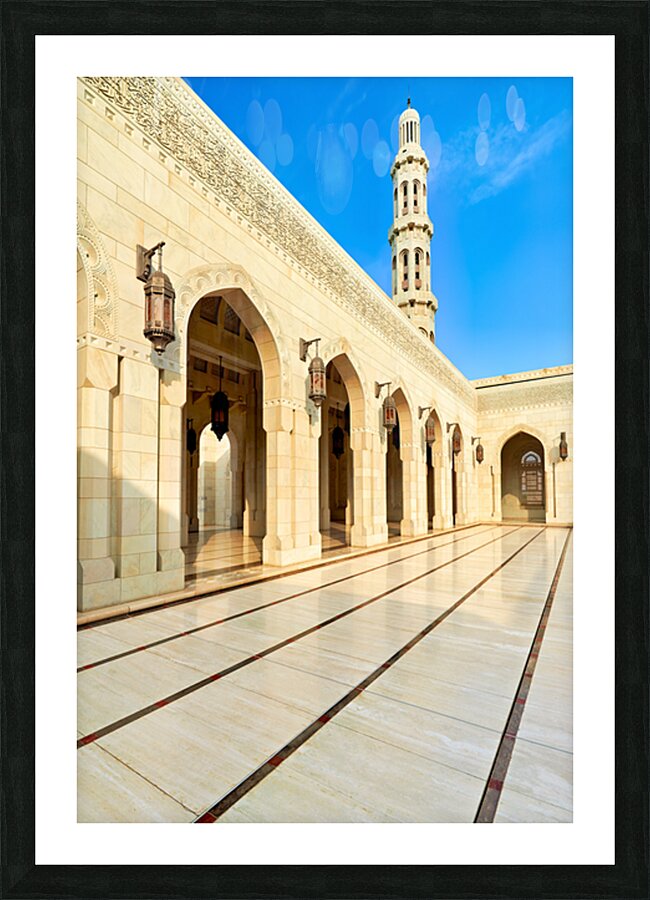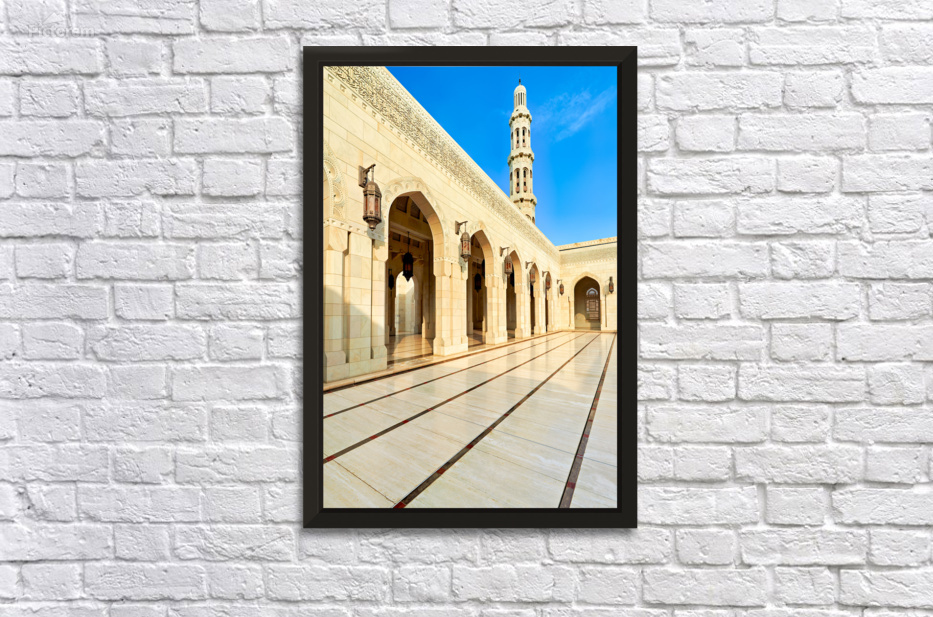 "Sultan Qaboos Grand Mosque in Muscat shows architectural design" in a framed print.