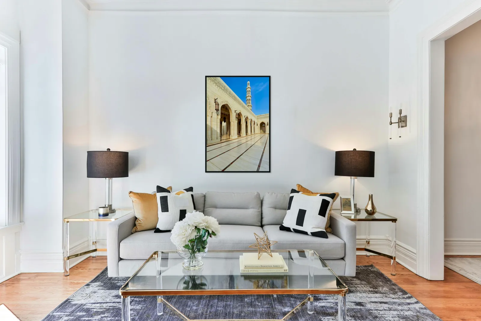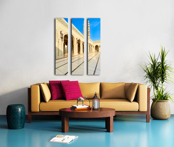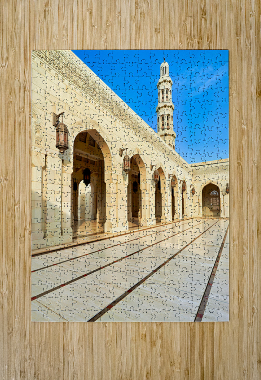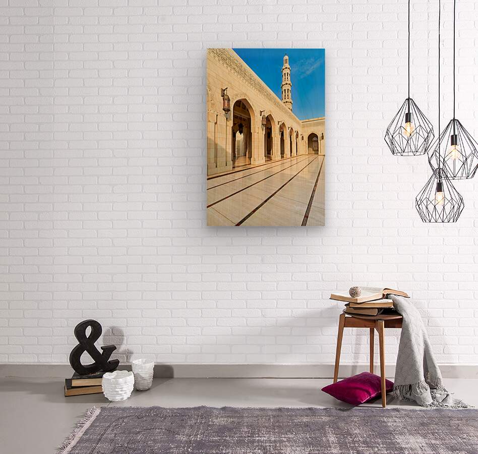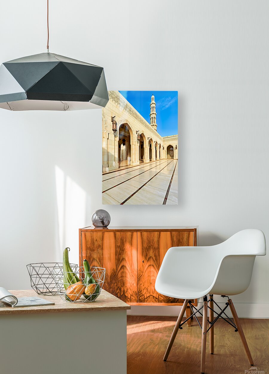 "Sultan Qaboos Grand Mosque in Muscat shows architectural design" in a framed print.