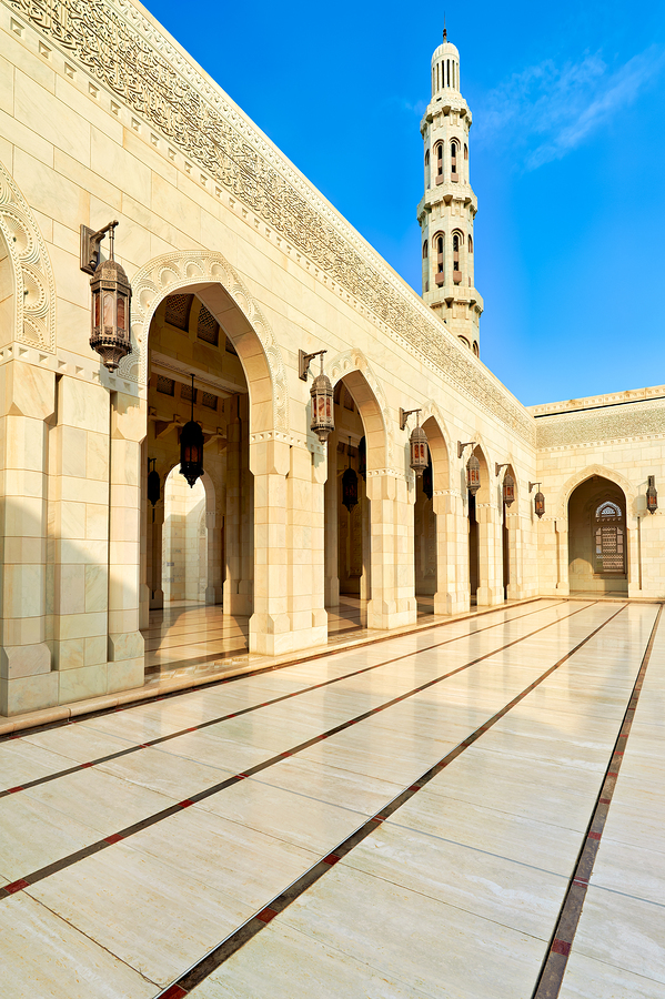 People walk through the Sultan Qaboos Grand Mosque grounds in Muscat Oman. The mosque features detailed arches and a tall tower.