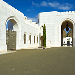 Visitors stand near Al Alam Palace in Muscat Oman. The bright white walls and arches draw attention under a clear blue sky.