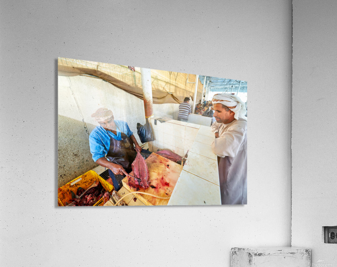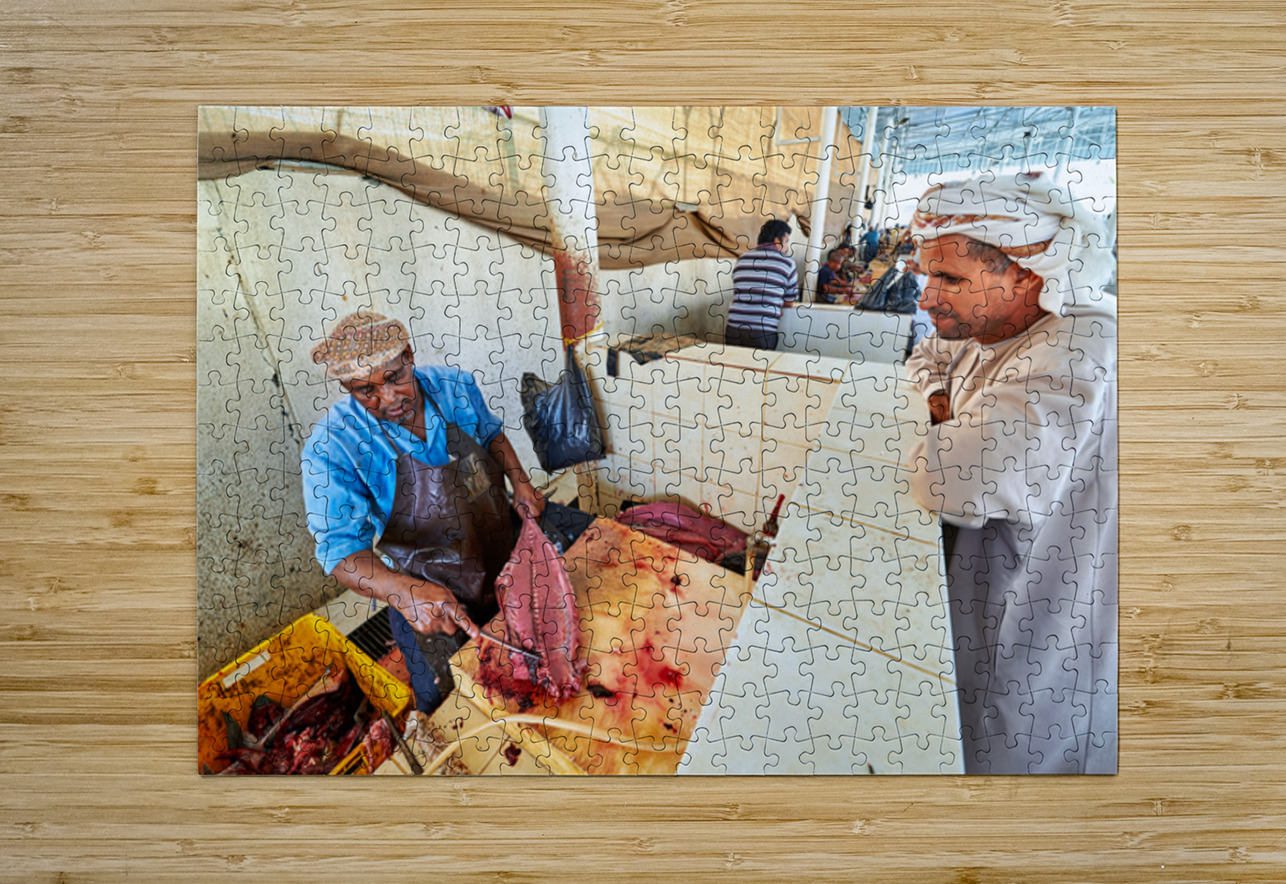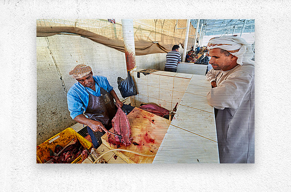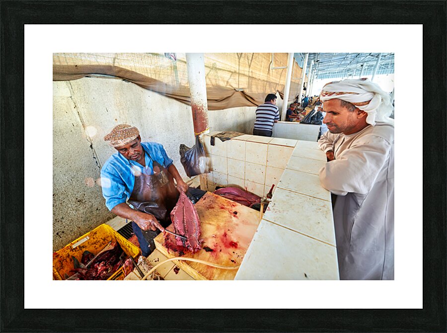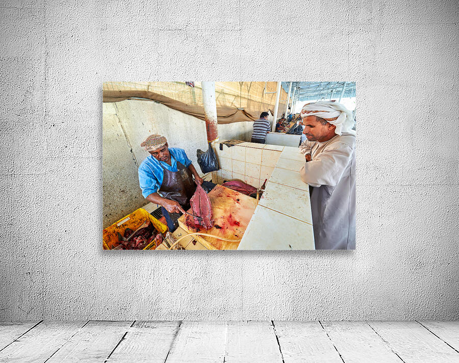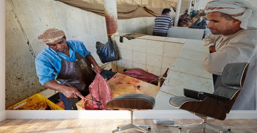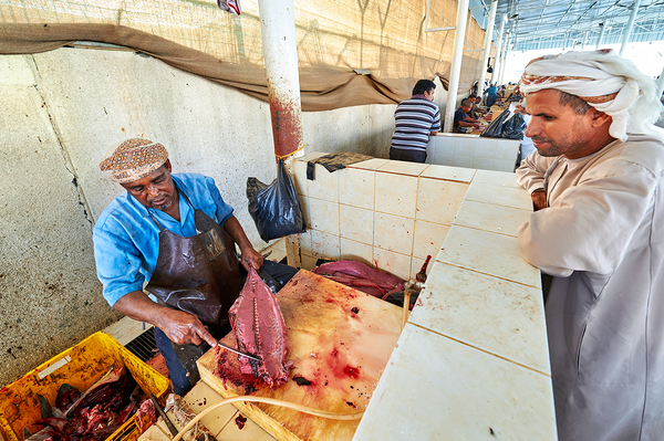 Fish vendors cut and prepare fish for sale at the market in Muscat Oman. Customers watch the work taking place around them as the market bustles.