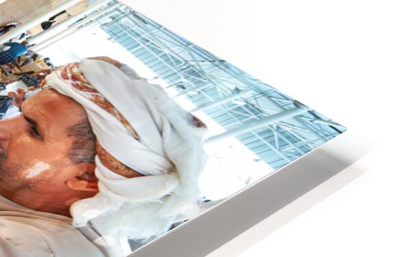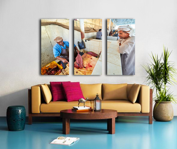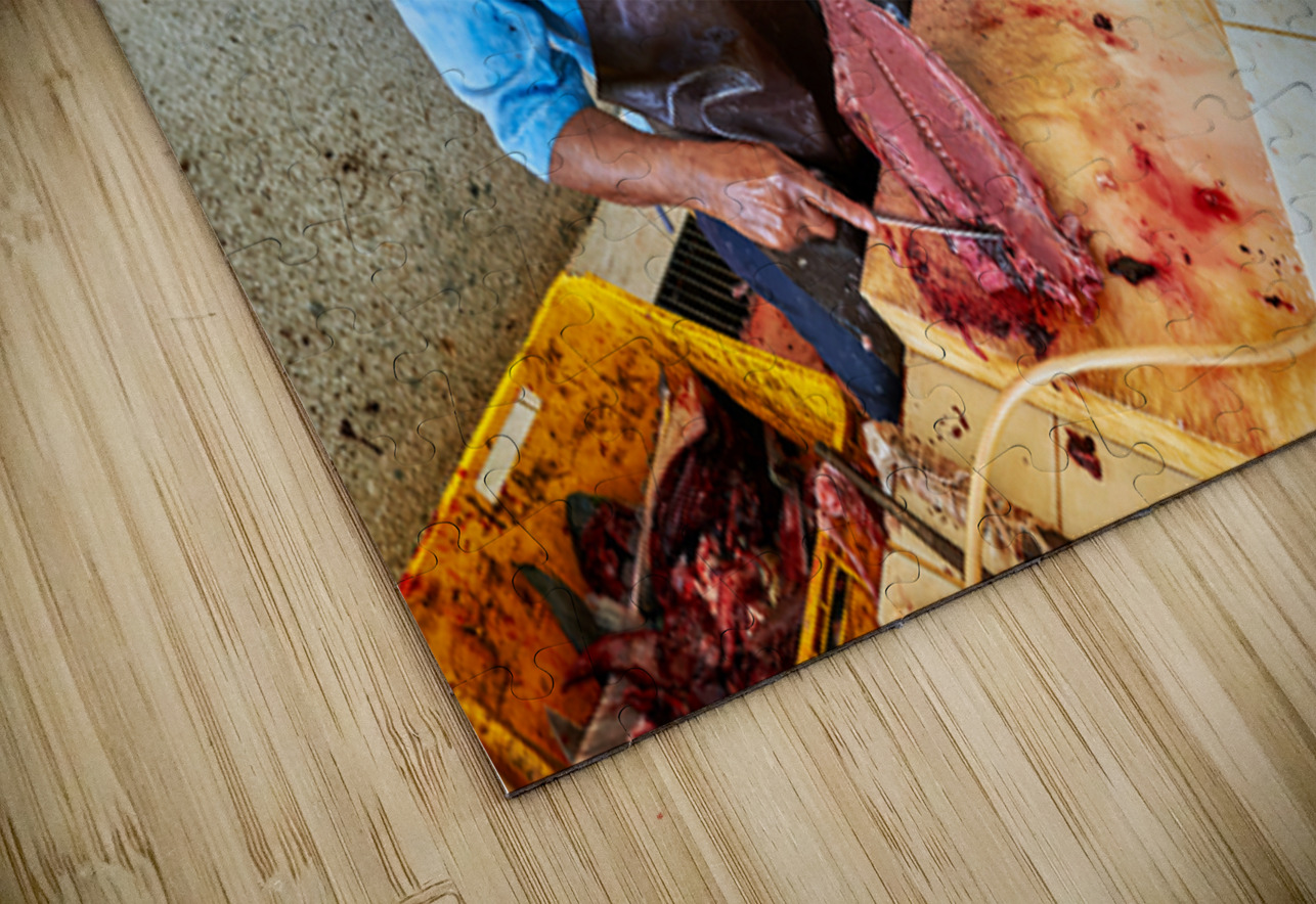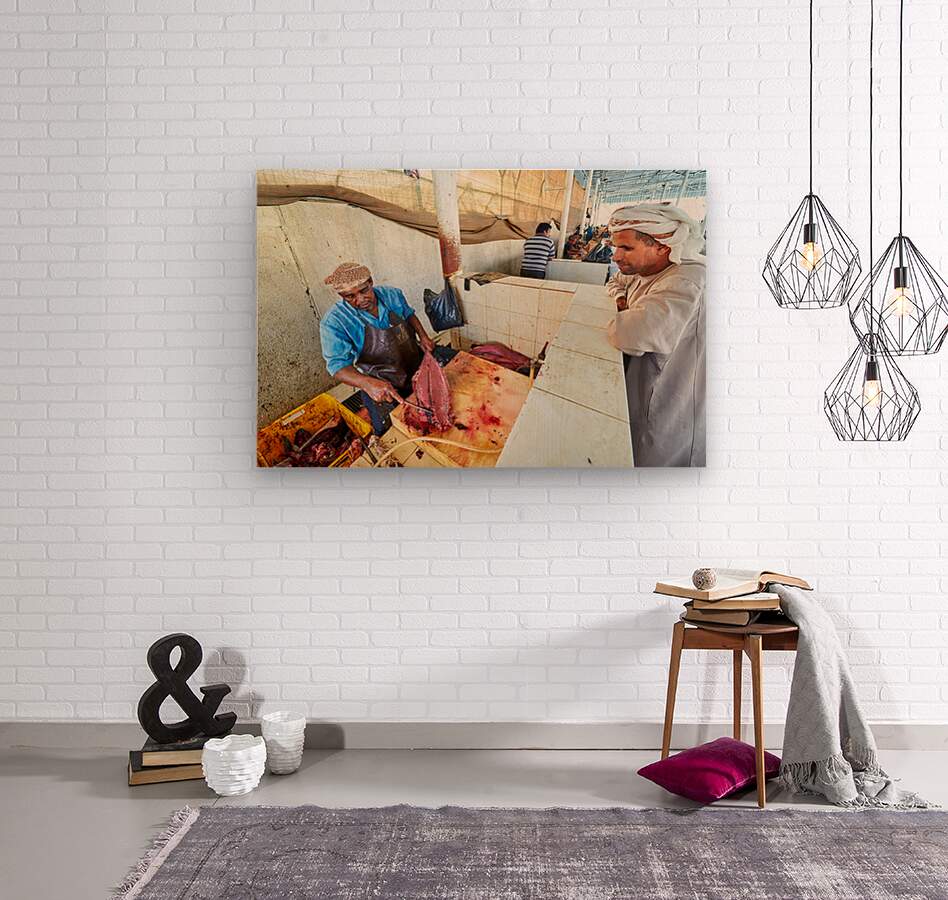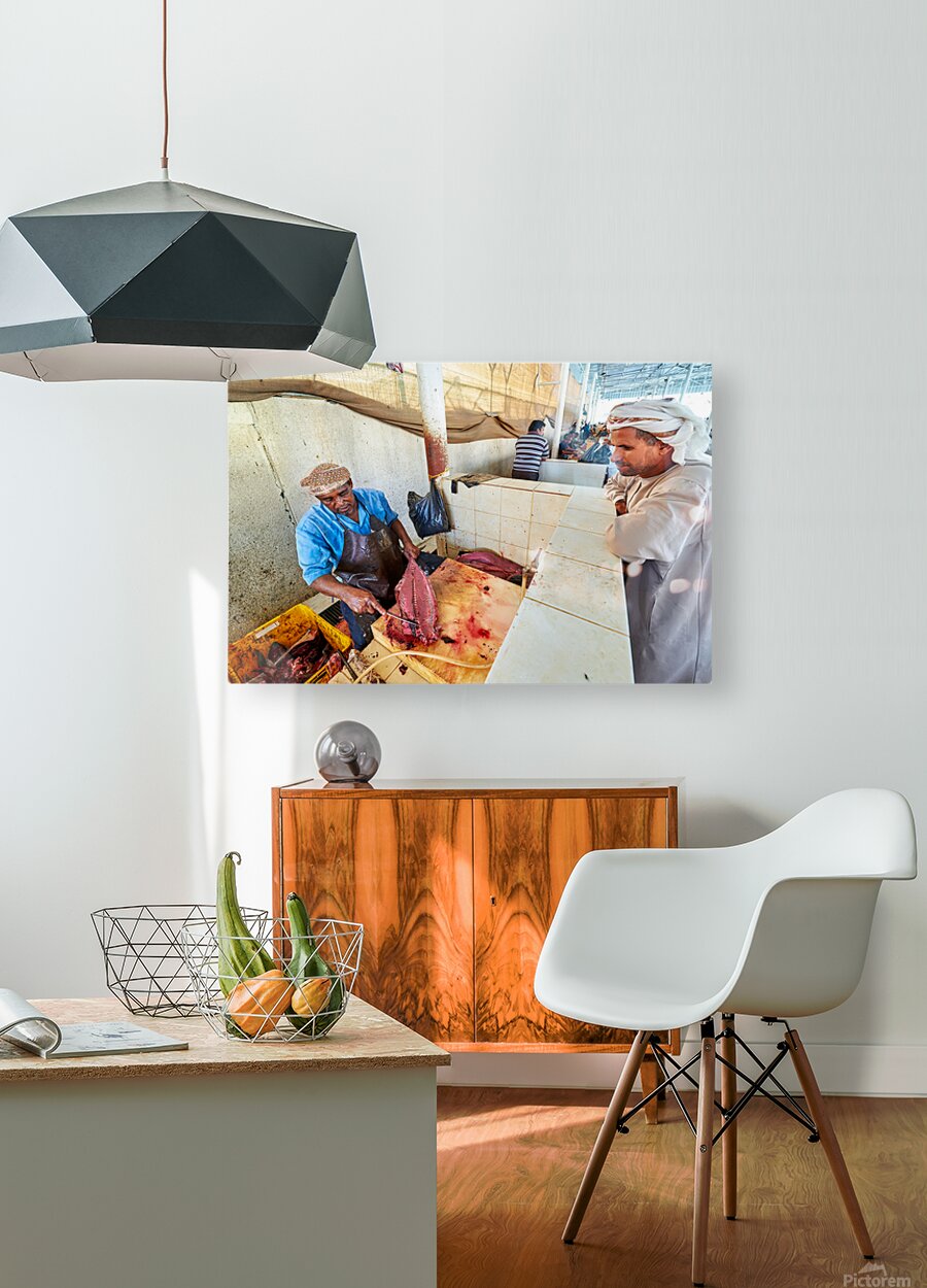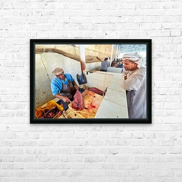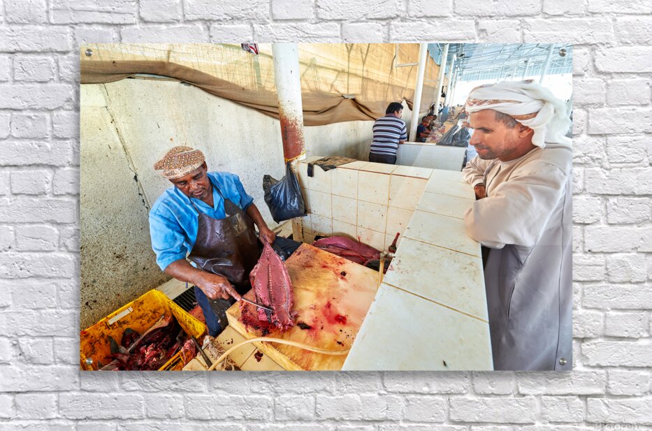 Fish vendors cut and prepare fish for sale at the market in Muscat Oman. Customers watch the work taking place around them as the market bustles.