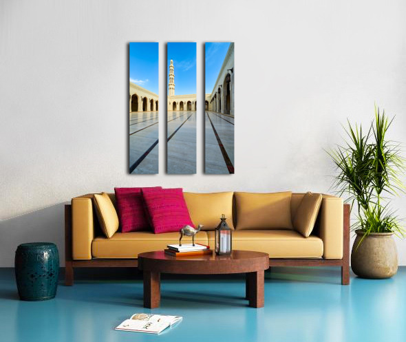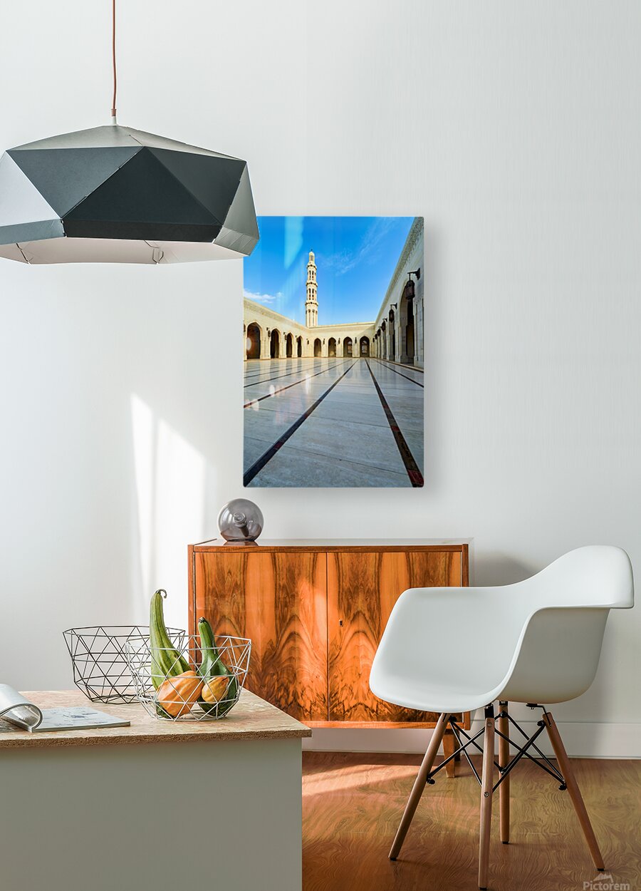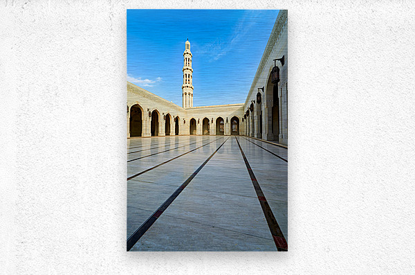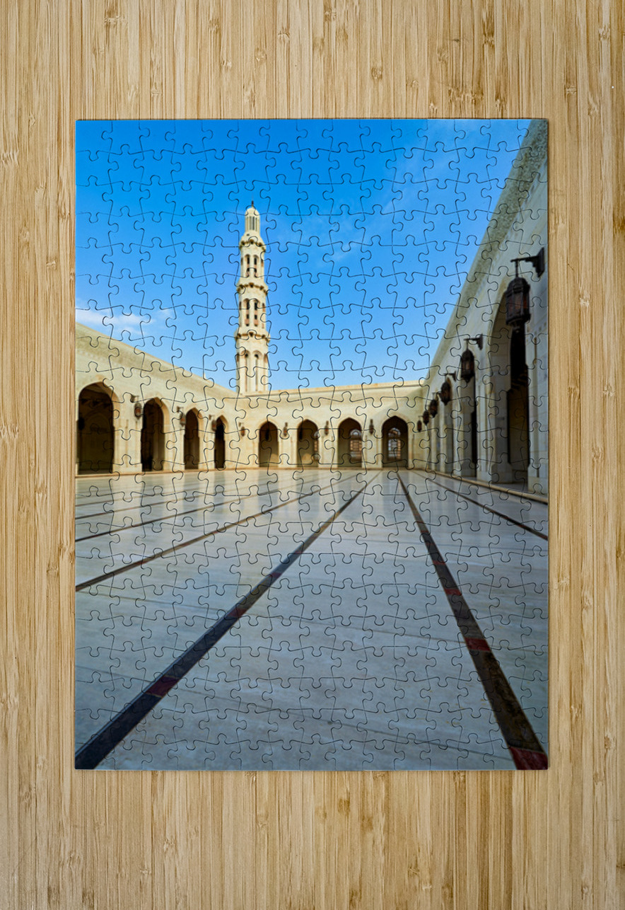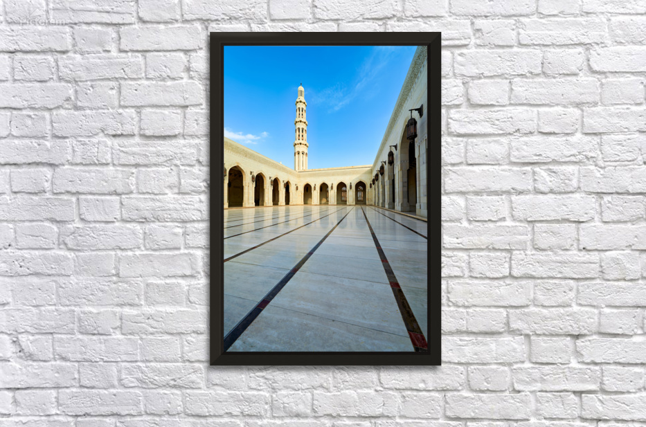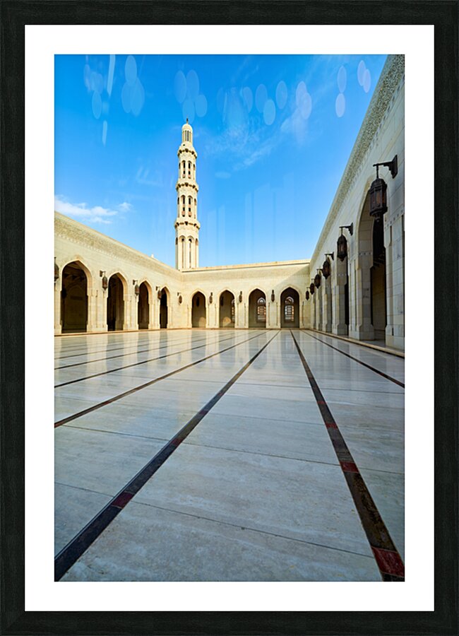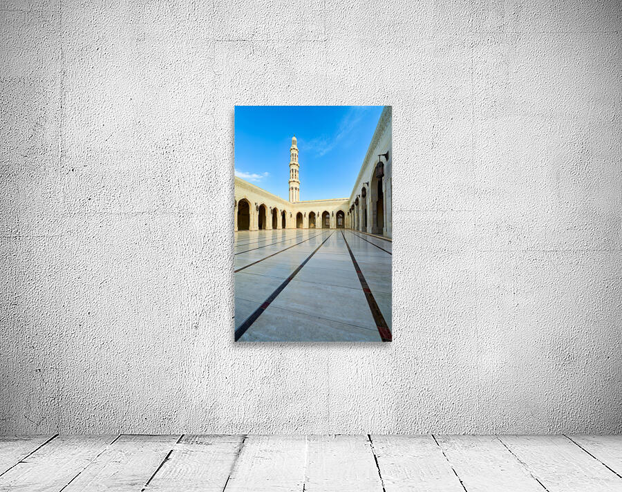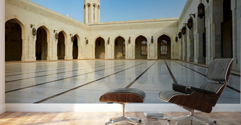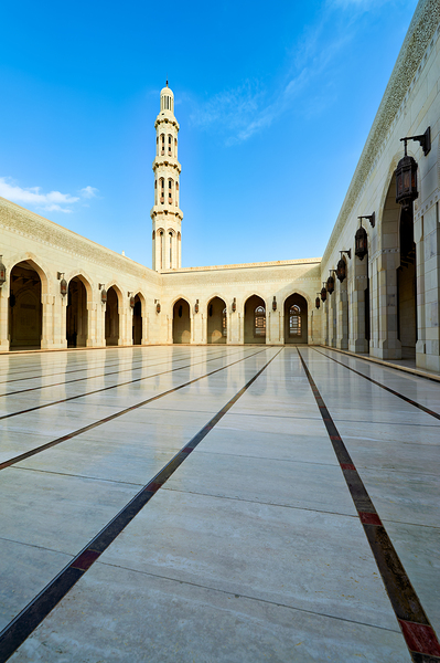 Tourists walk through the courtyard of Sultan Qaboos Grand Mosque in Muscat Oman on a clear blue sky day.