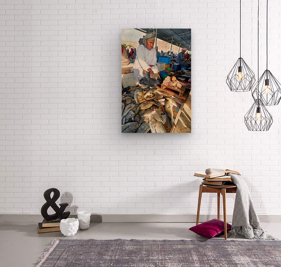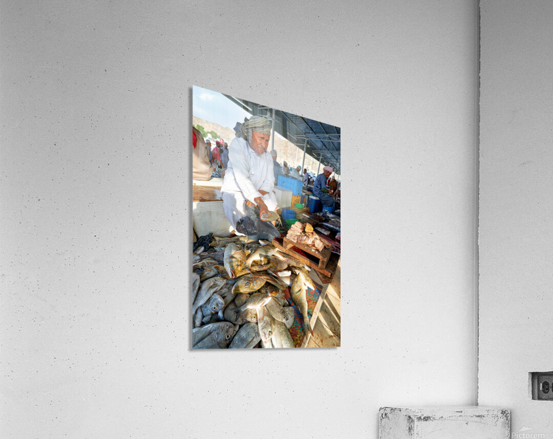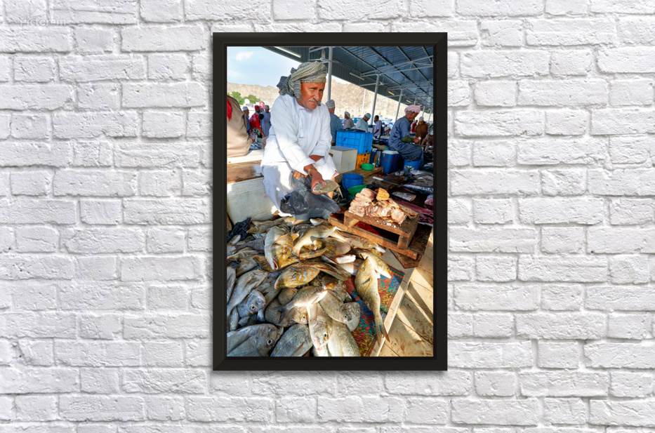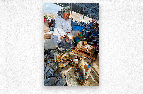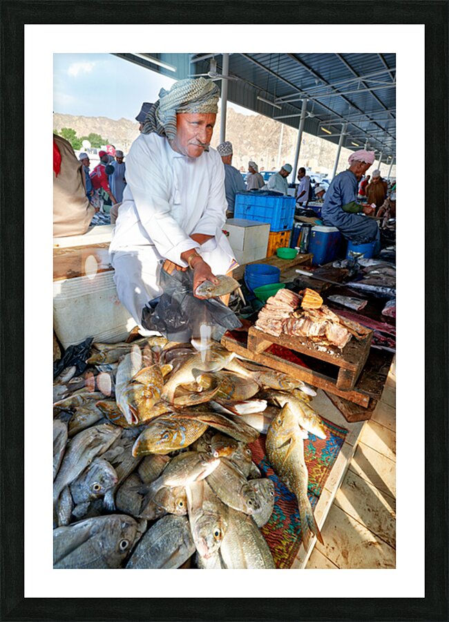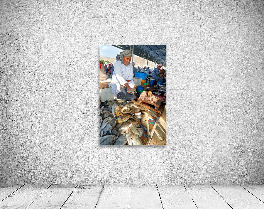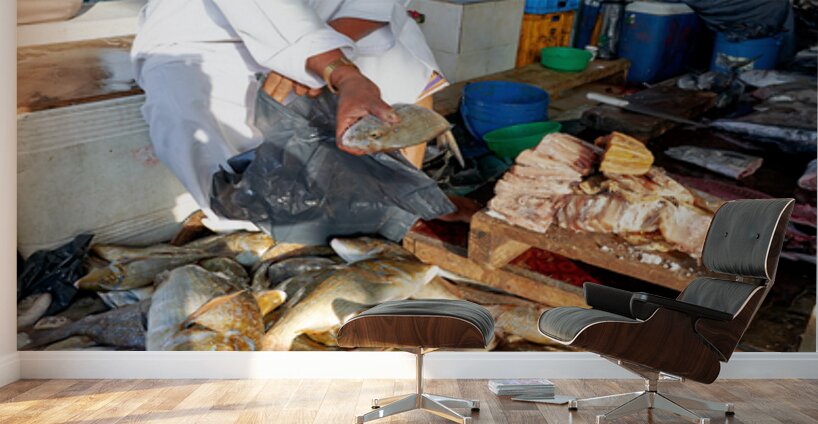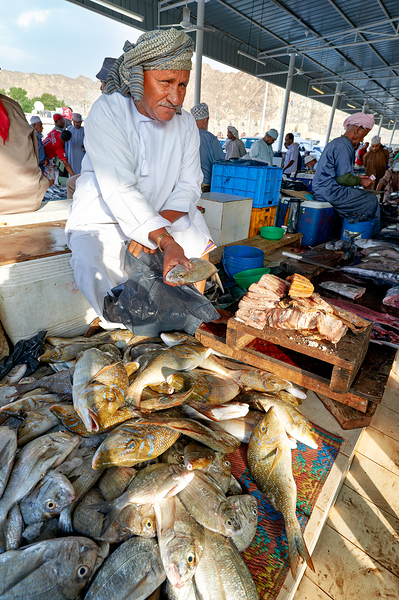 Sellers showcase various types of fish at the market in Muscat Oman. Customers browse and select seafood for their meals.