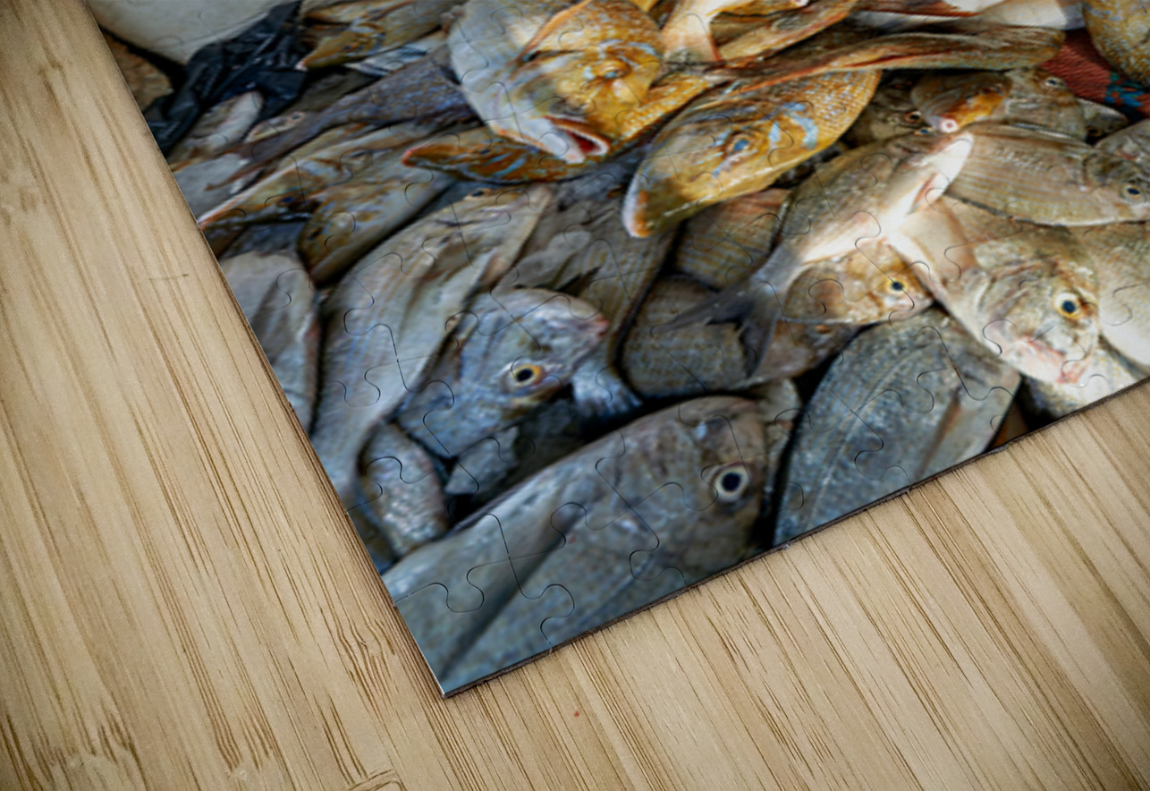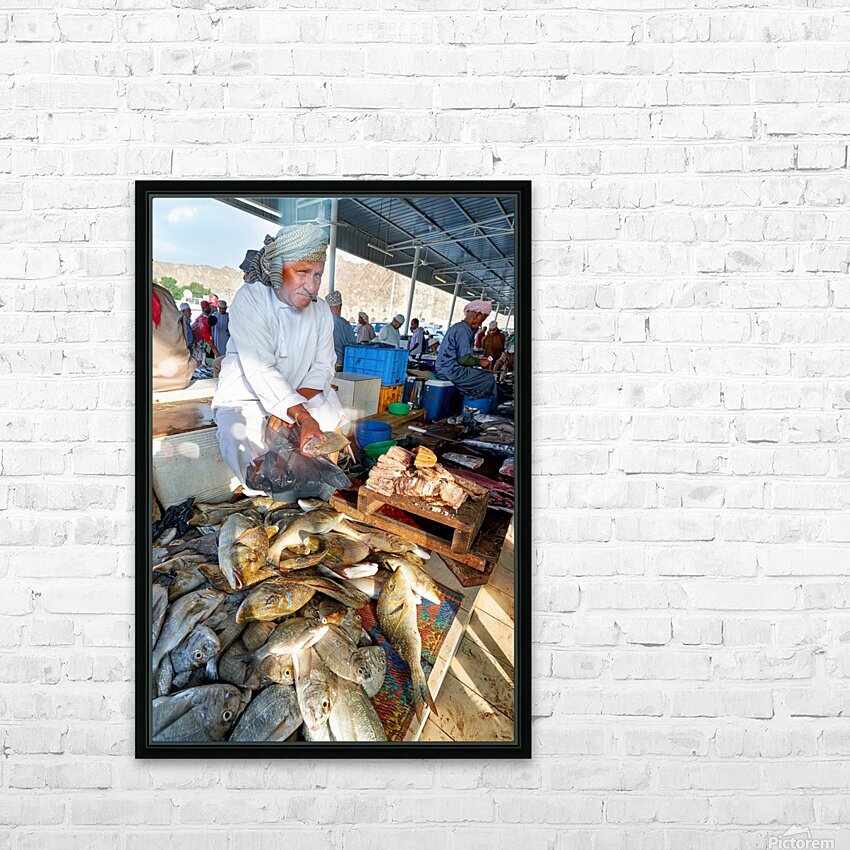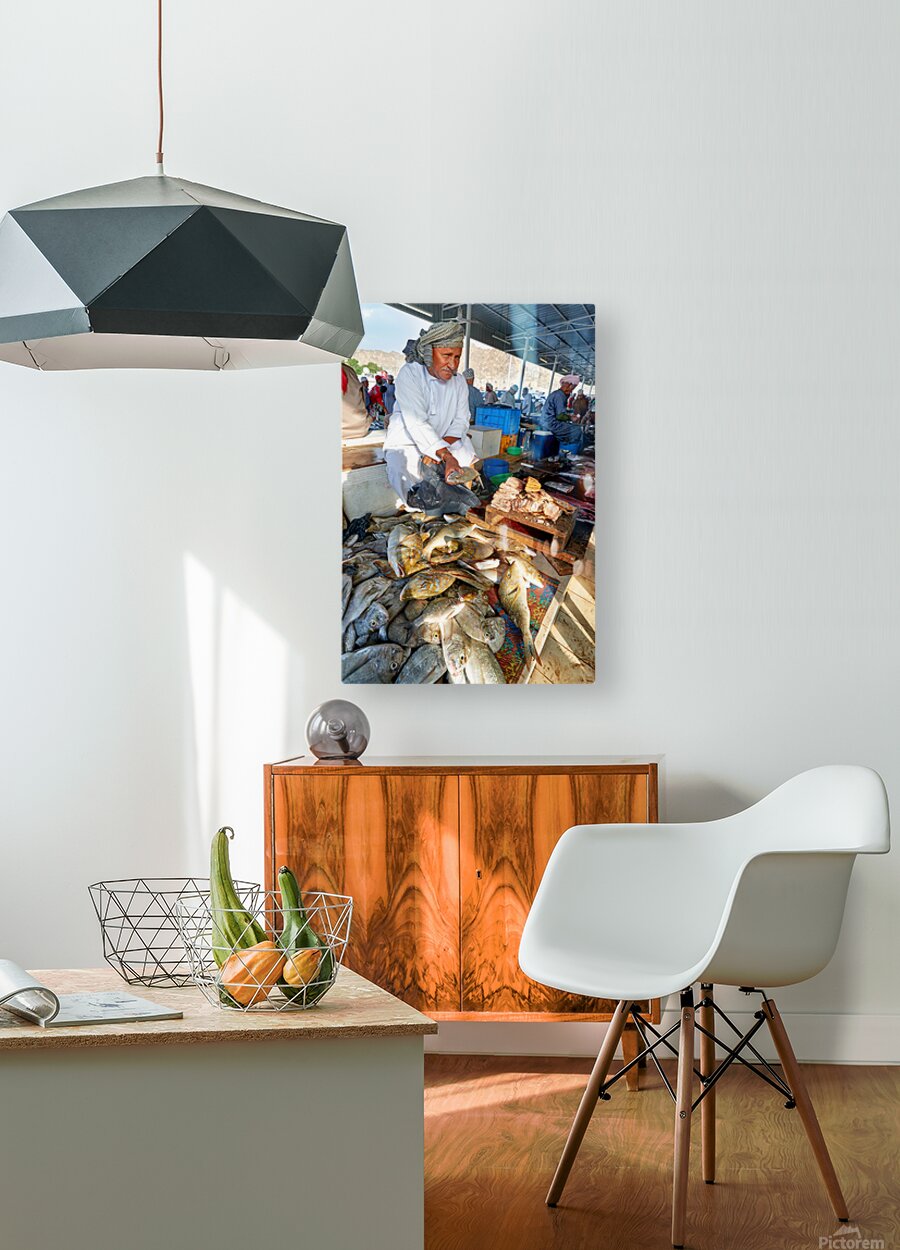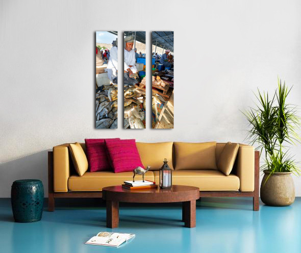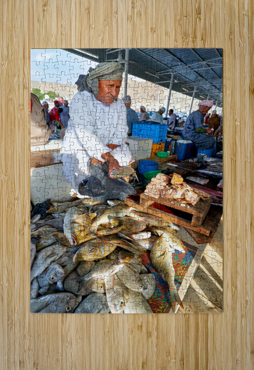 Sellers showcase various types of fish at the market in Muscat Oman. Customers browse and select seafood for their meals.