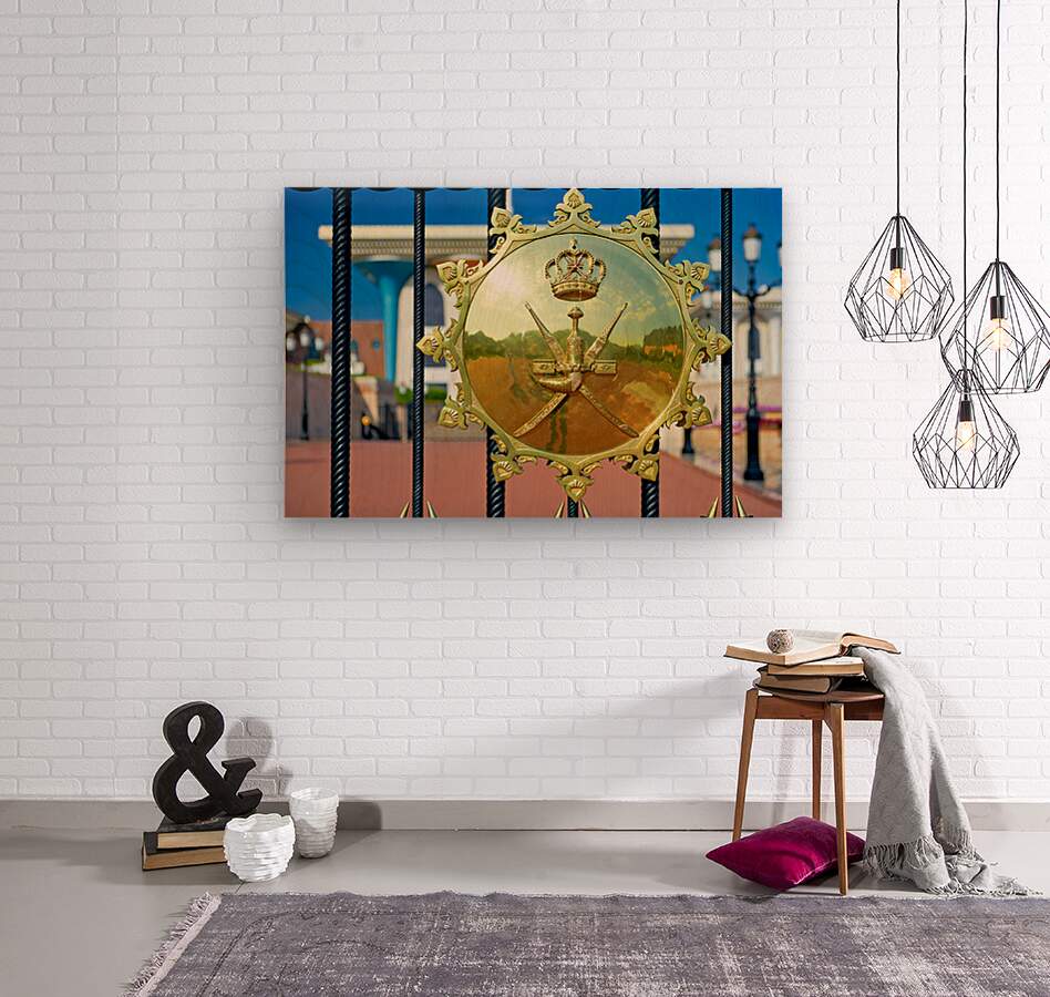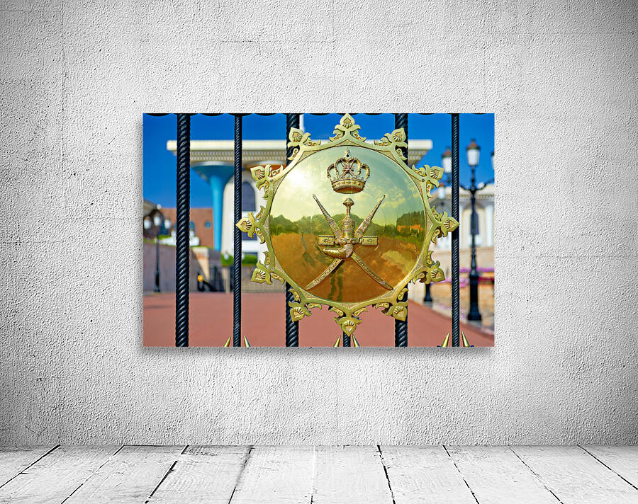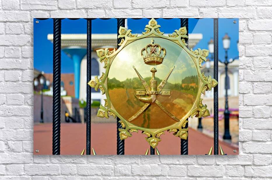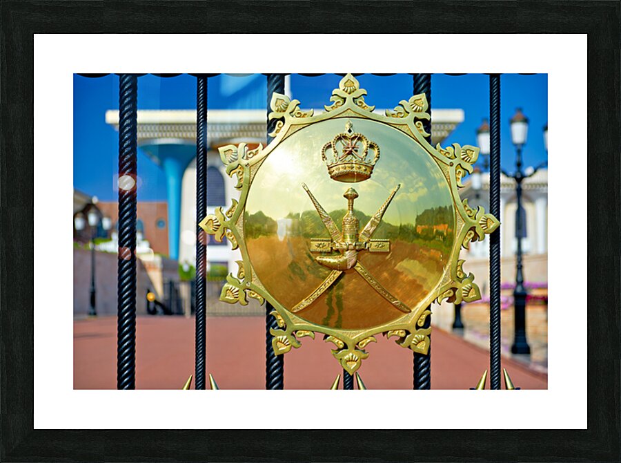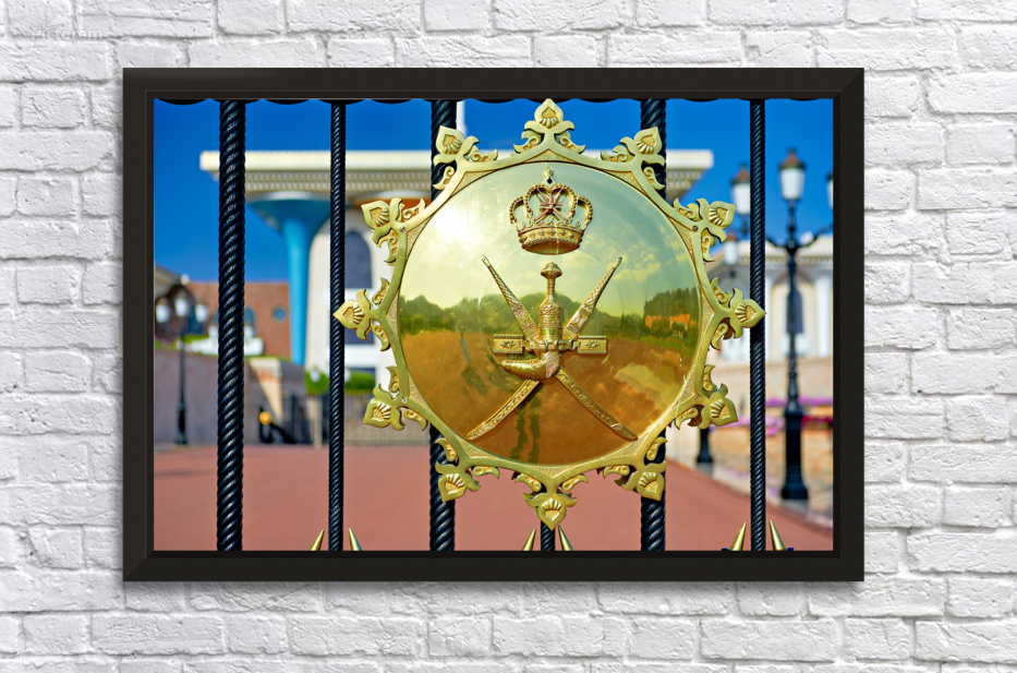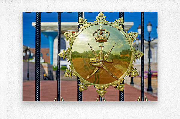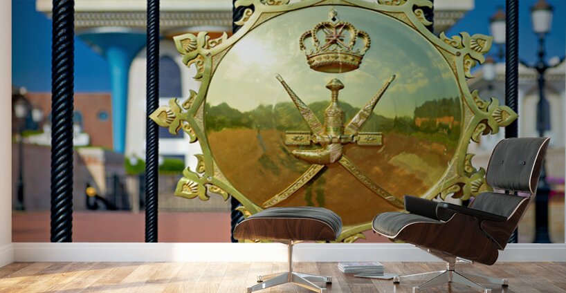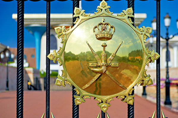 A close look at the emblem on the gate of Al Alam Palace in Muscat Oman during a sunny day. The palace structure shows in the background.