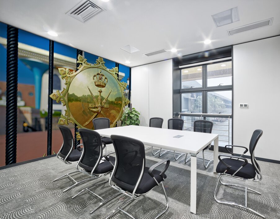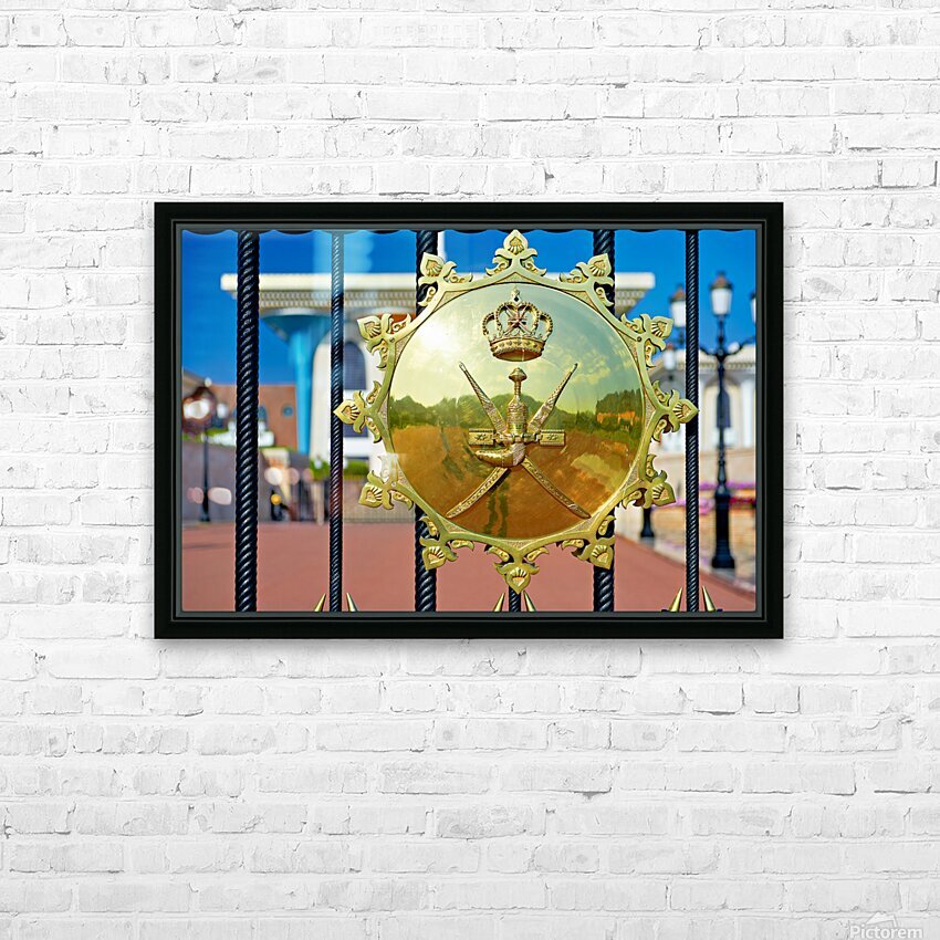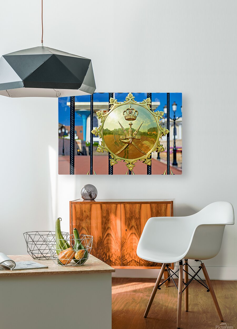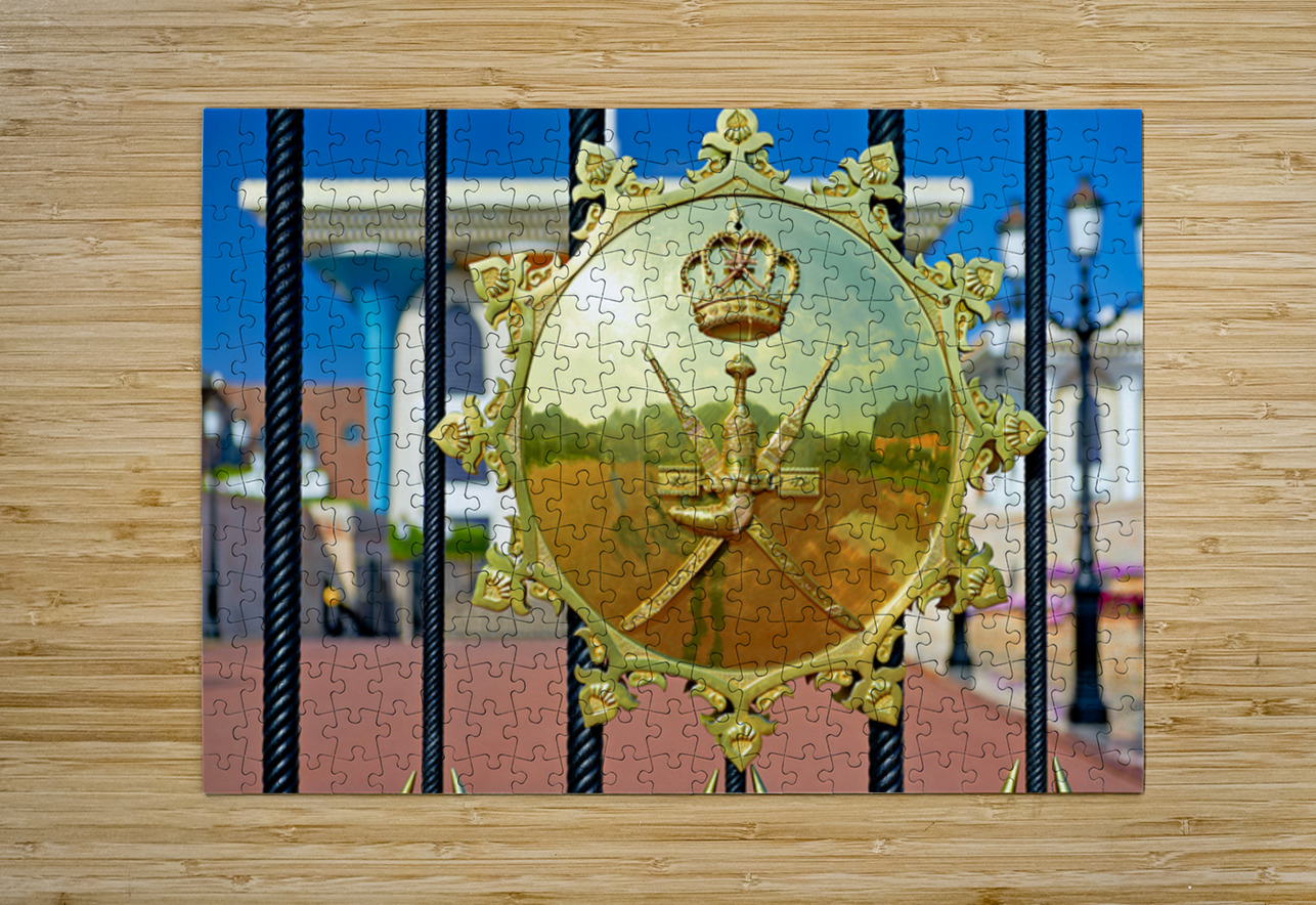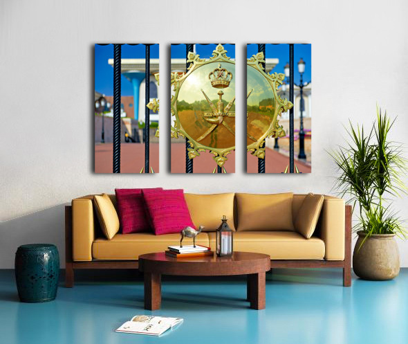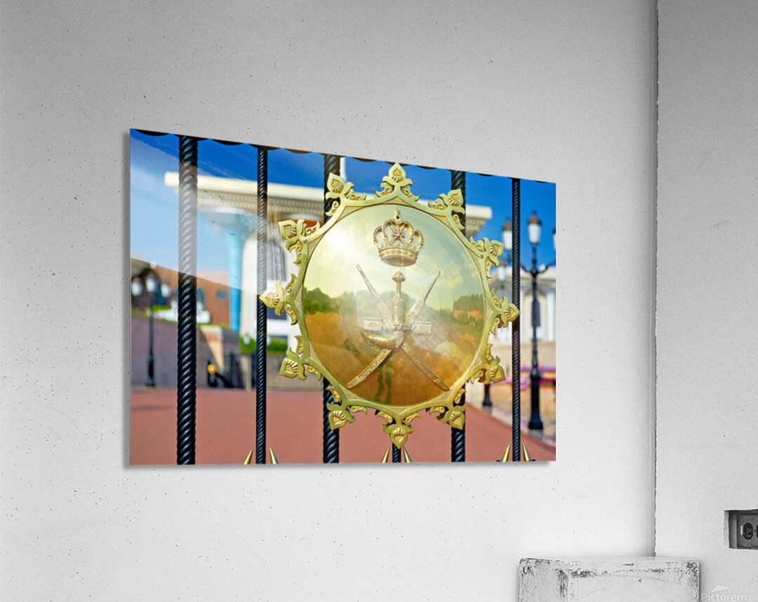 A close look at the emblem on the gate of Al Alam Palace in Muscat Oman during a sunny day. The palace structure shows in the background.