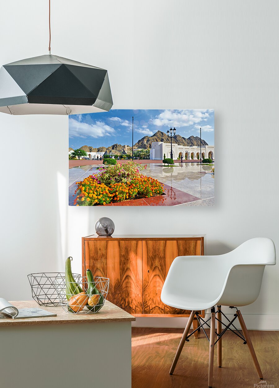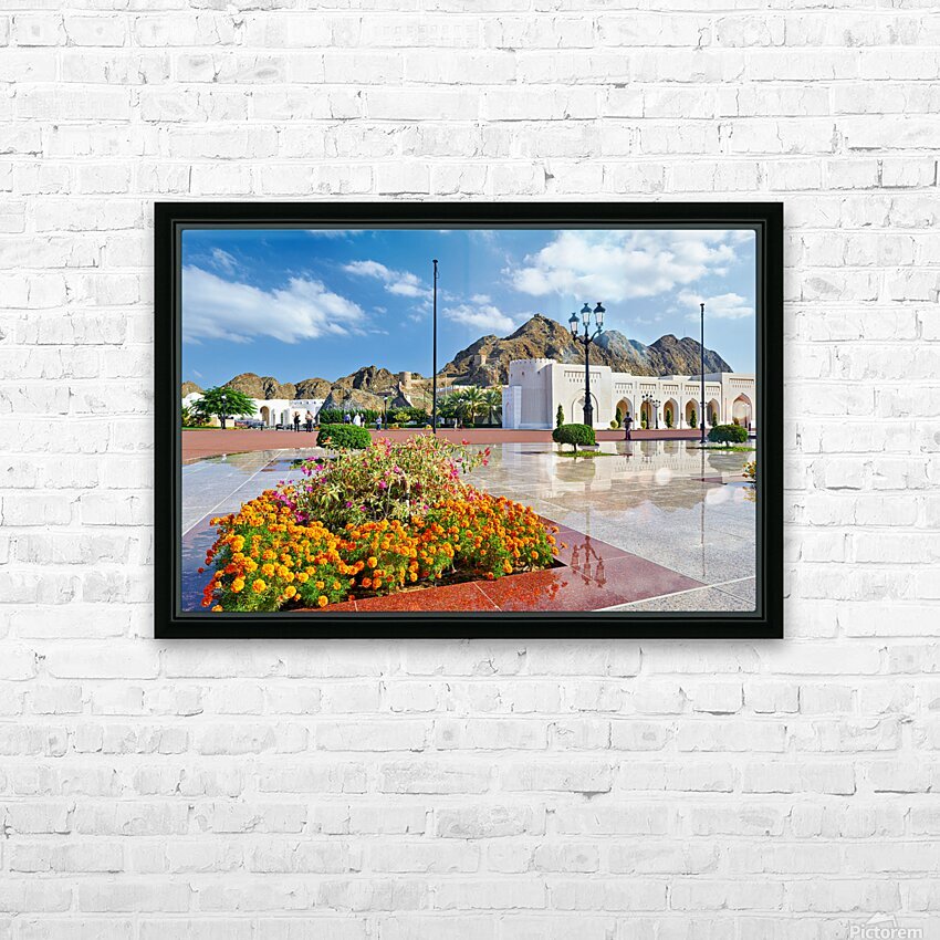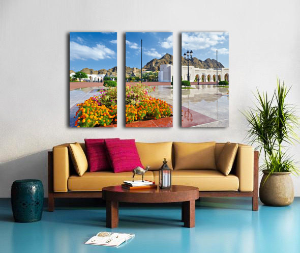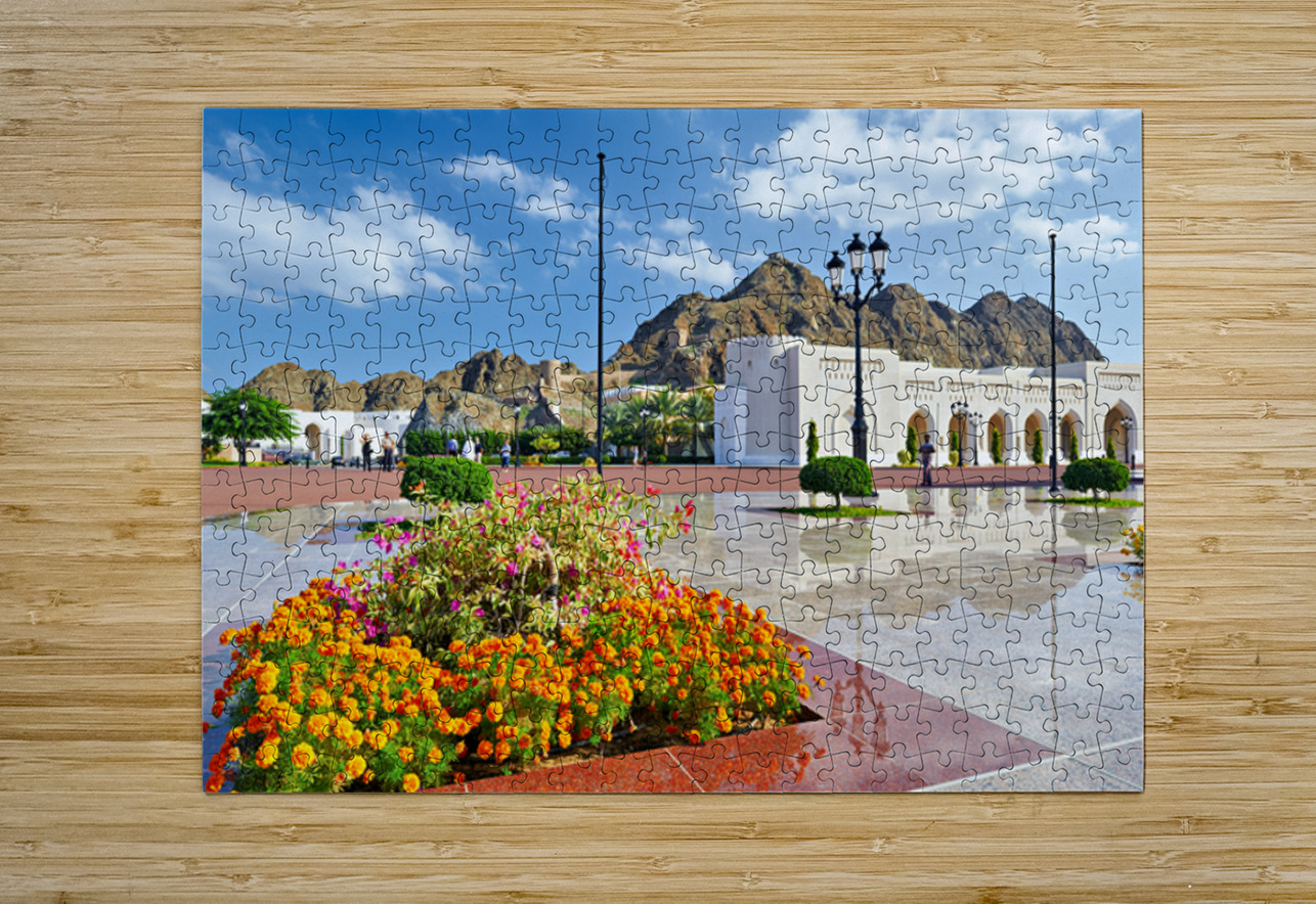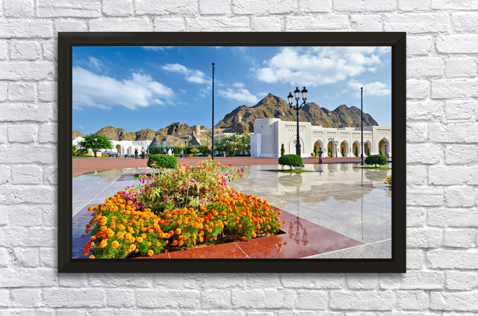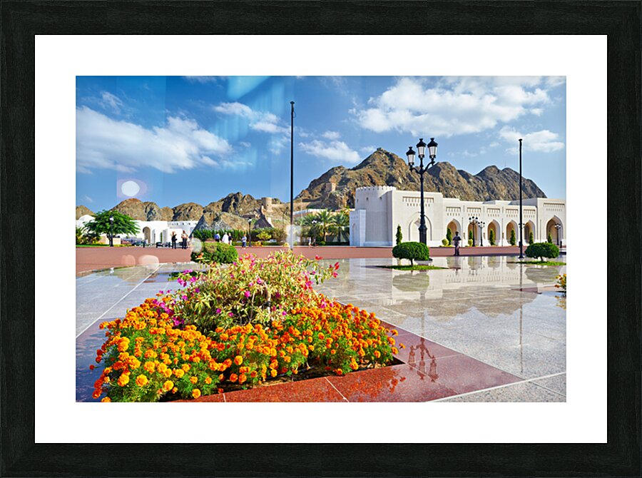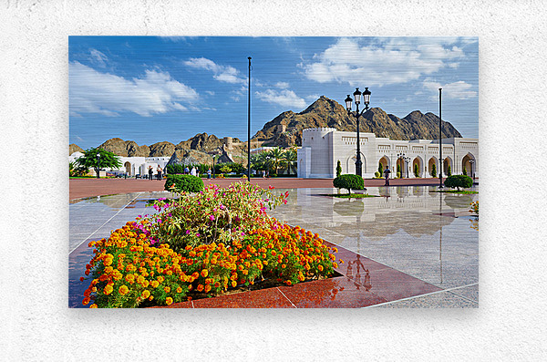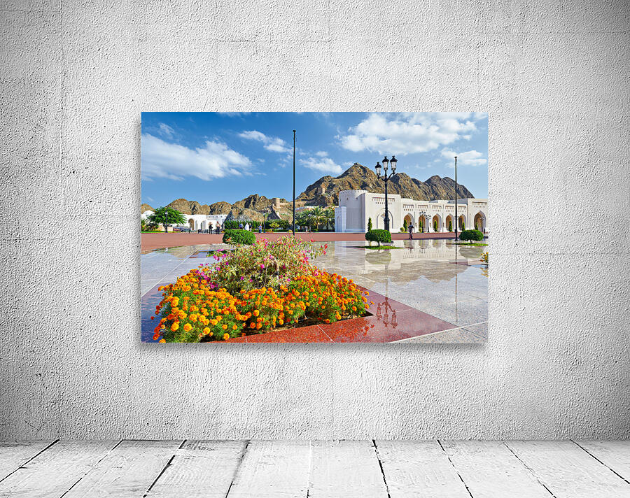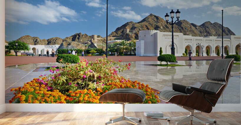 People walk around Al Alam Palace in Muscat Oman. Flowers bloom in the foreground while tourists enjoy the site and landscape.