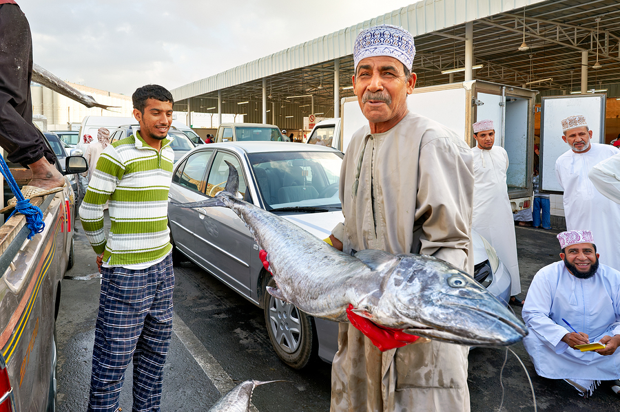 Local men are selling fish at the market in Muscat Oman. Customers are looking at the fresh catch from the sea.