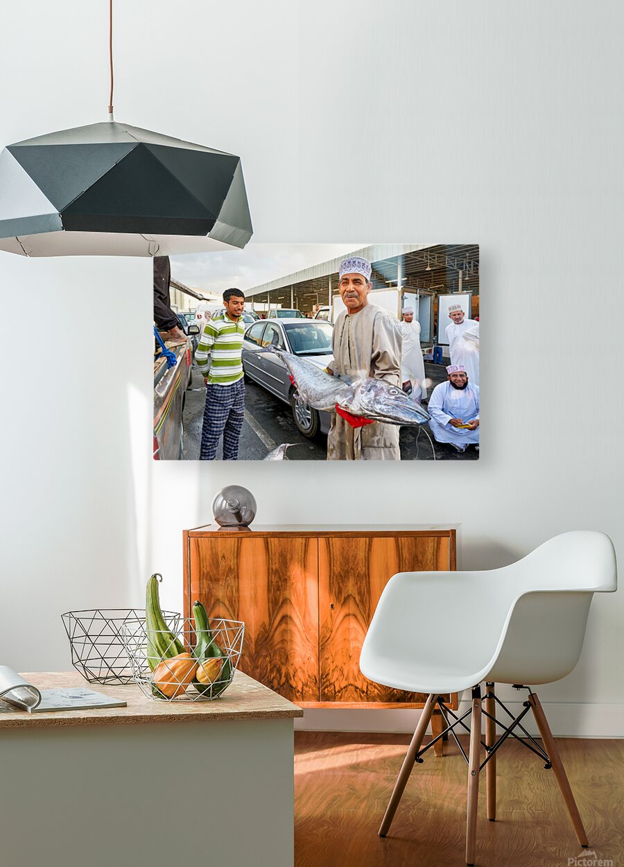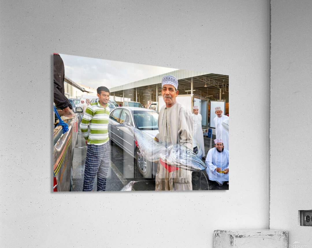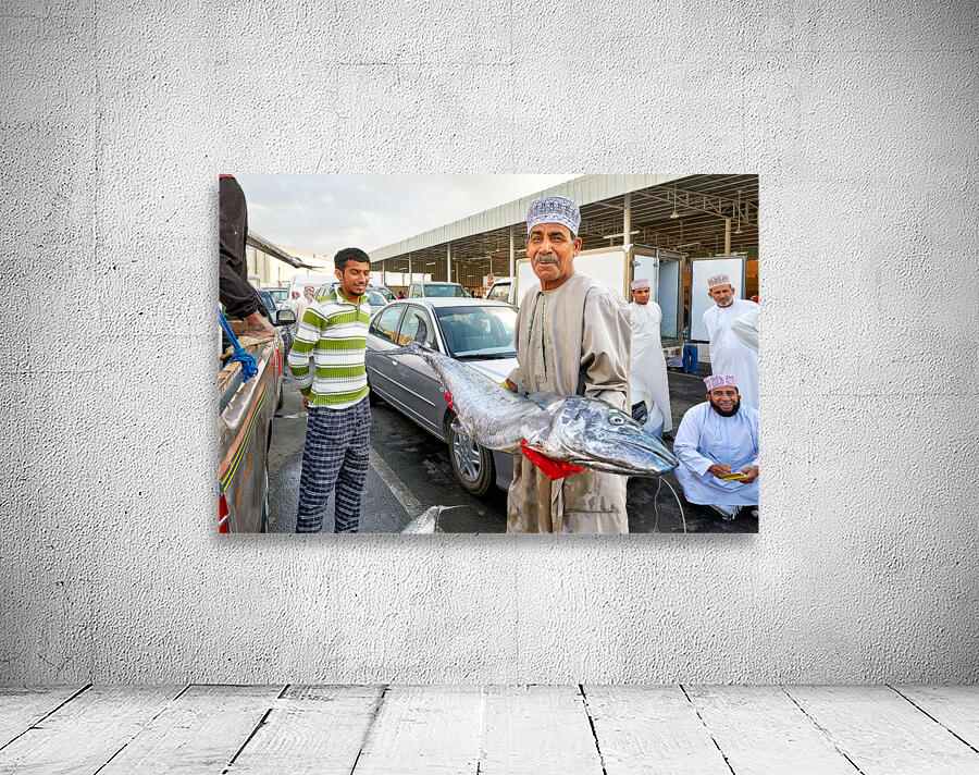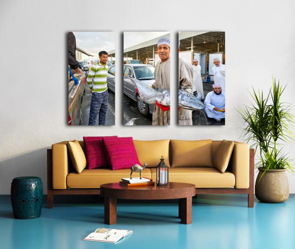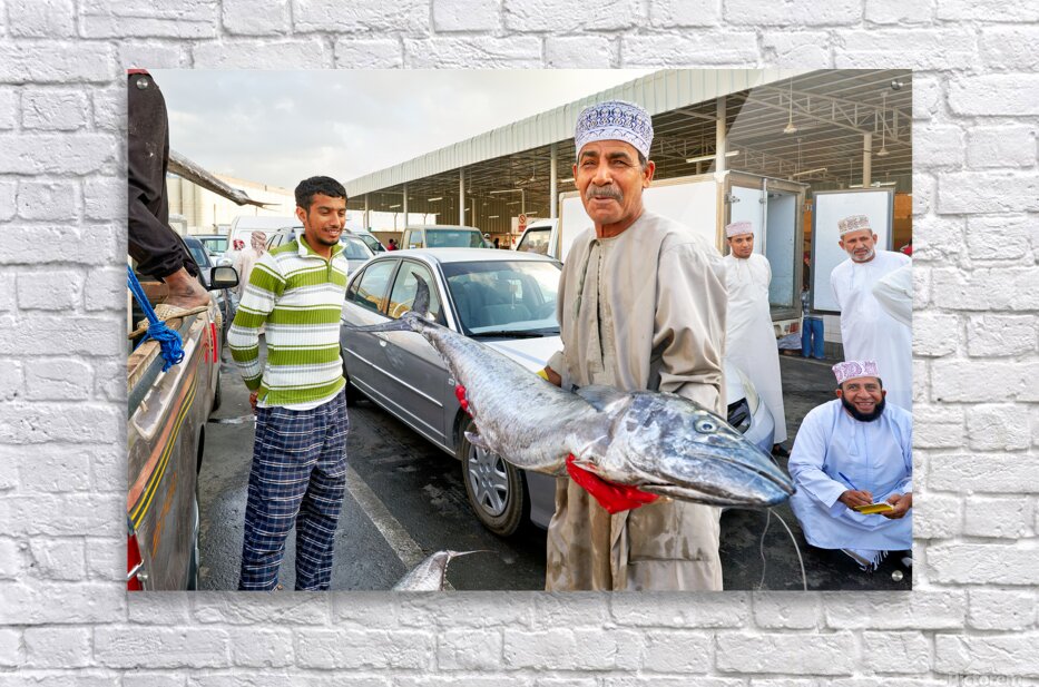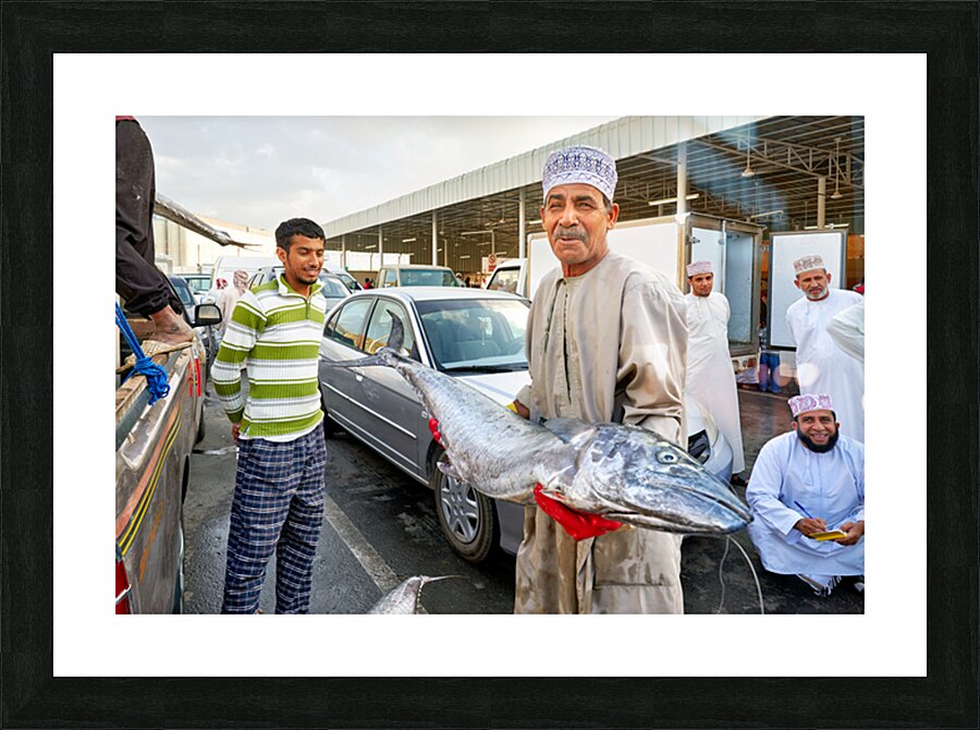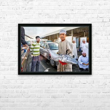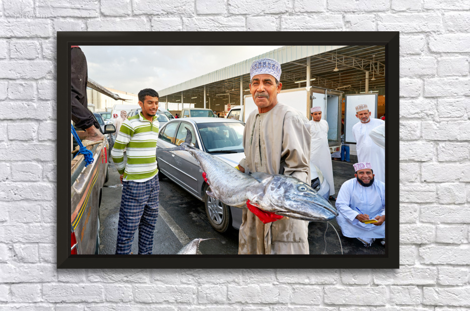 "Fish market activity in Muscat Oman during the day" in a framed print.