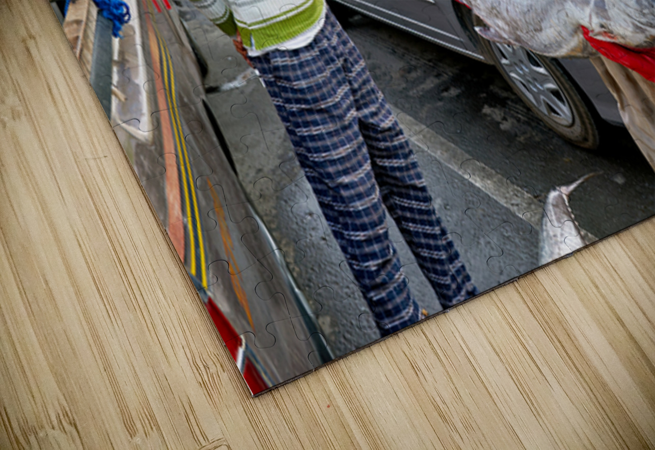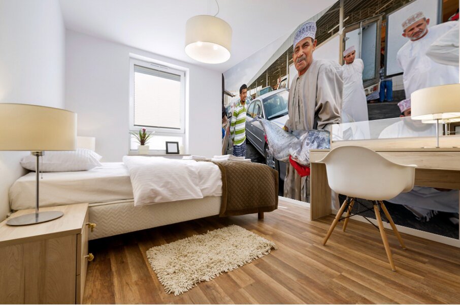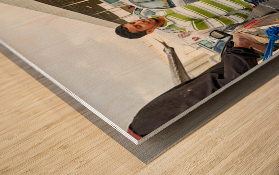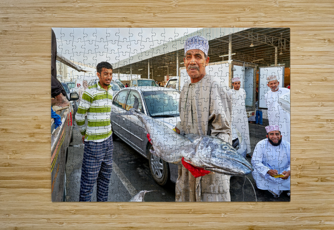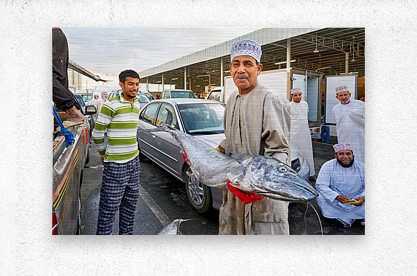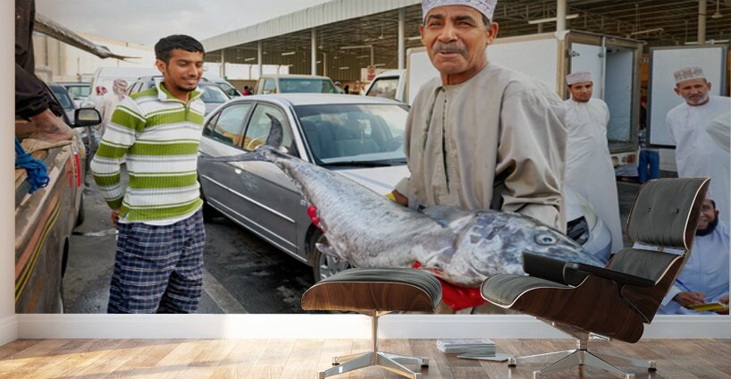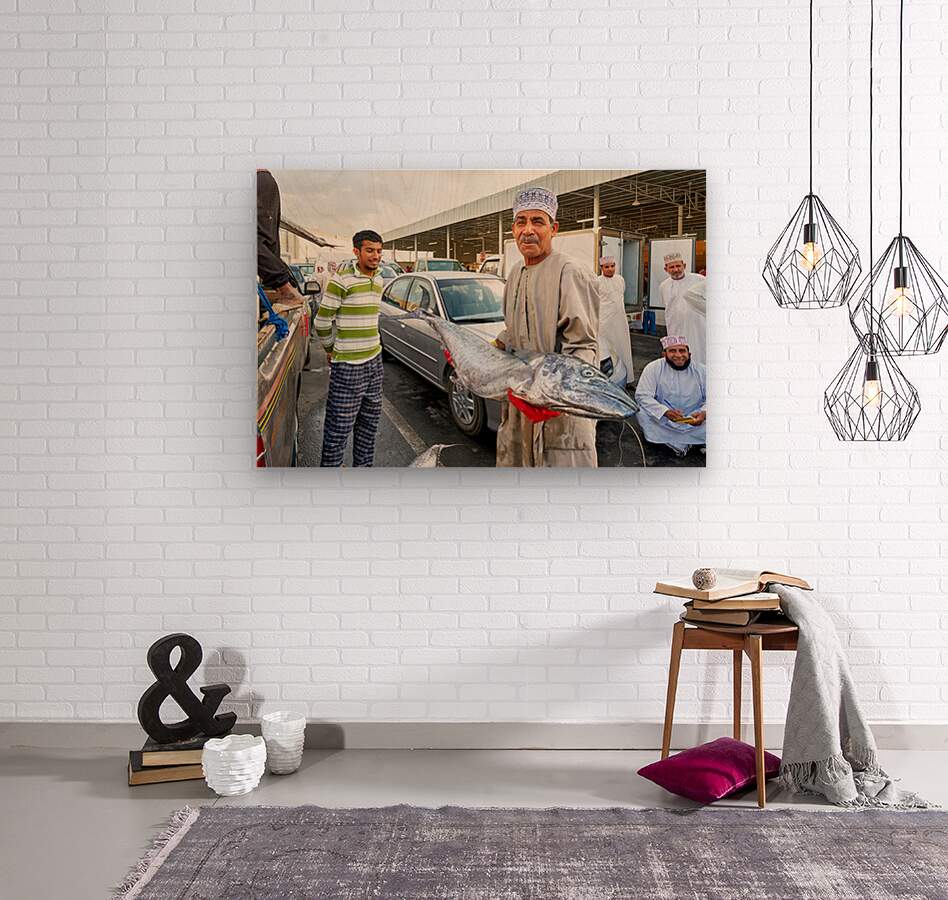 "Fish market activity in Muscat Oman during the day" in a framed print.