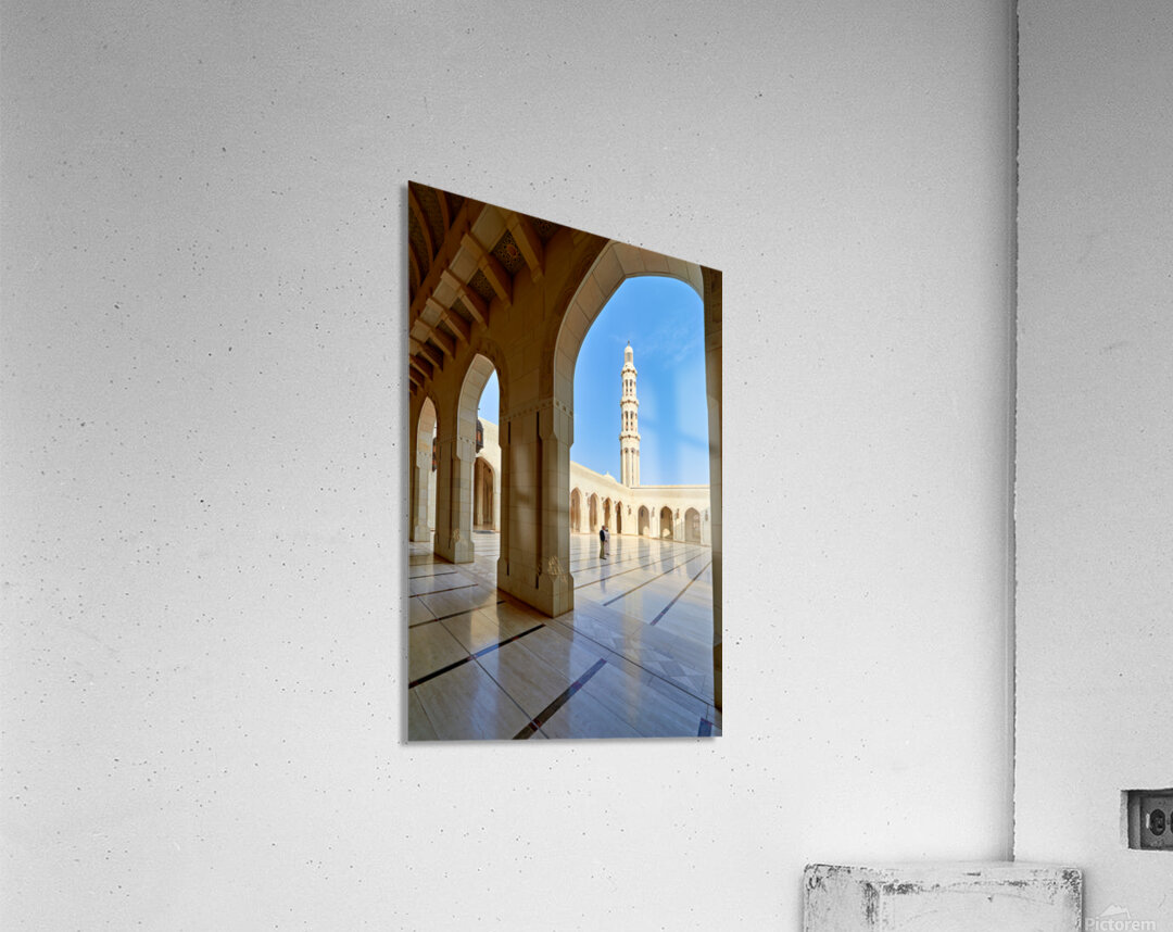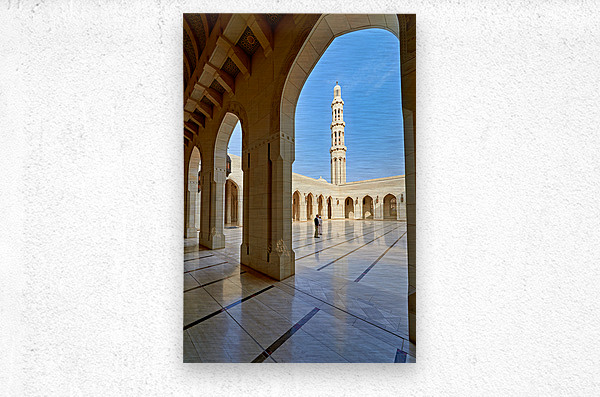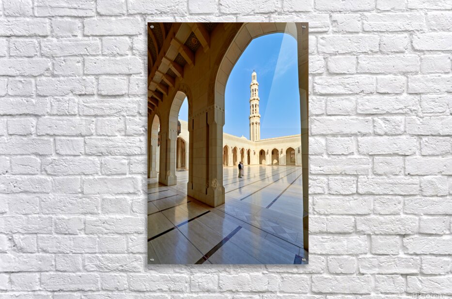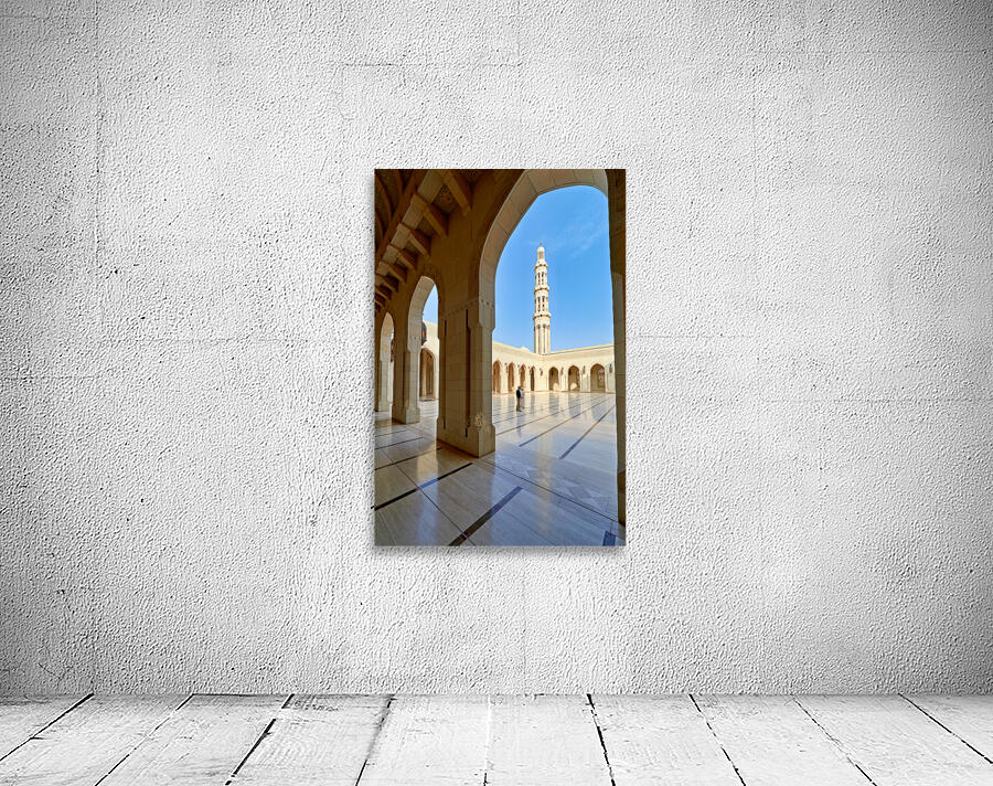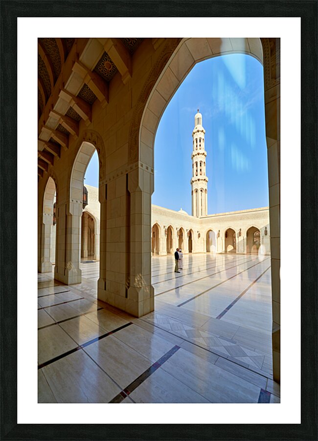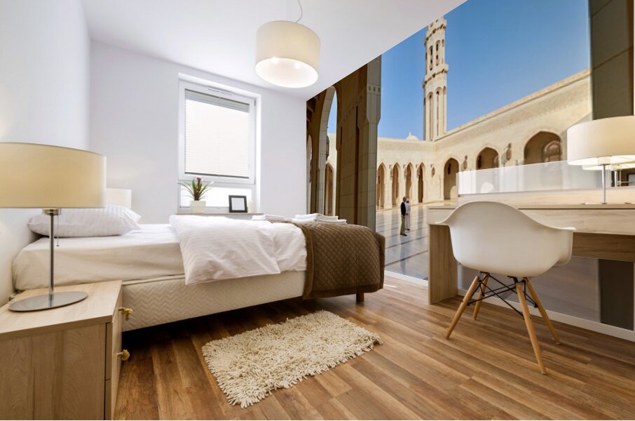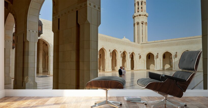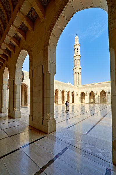 Visitors explore the interior of Sultan Qaboos Grand Mosque in Muscat. The architecture shows arches and a tall minaret under a blue sky.