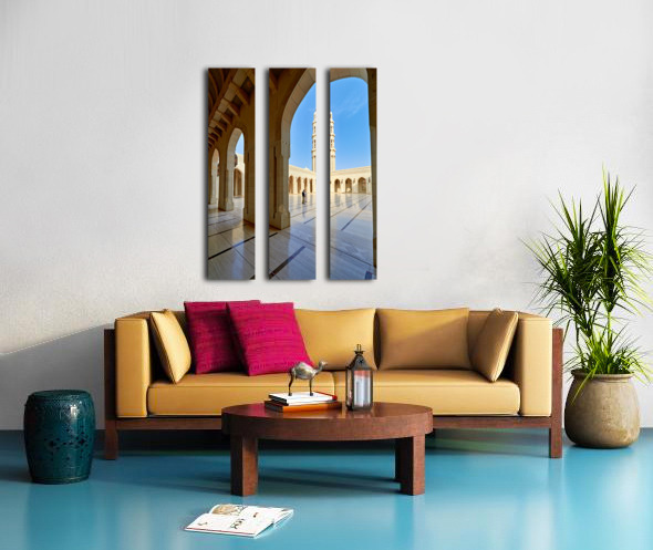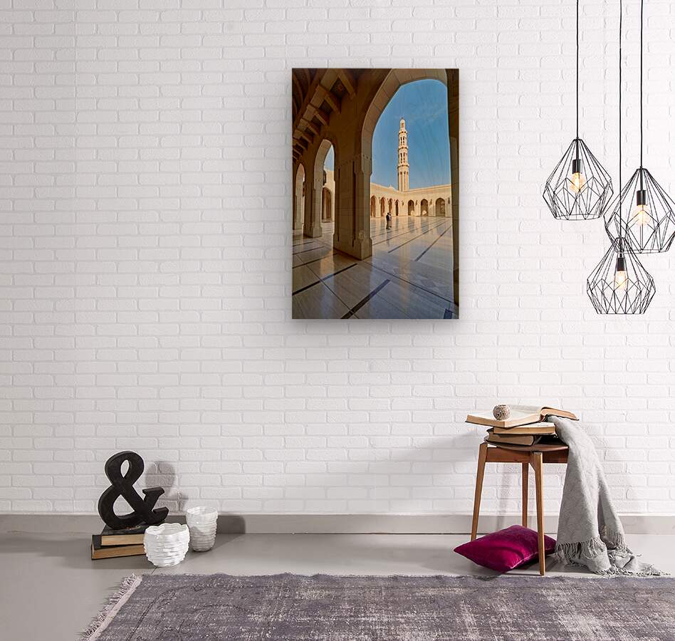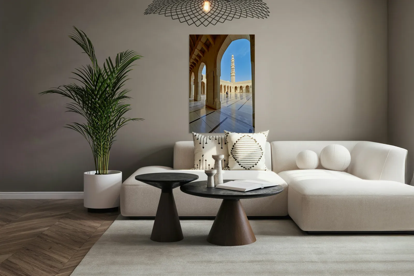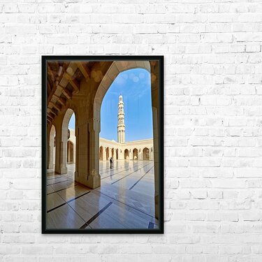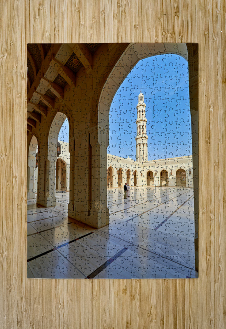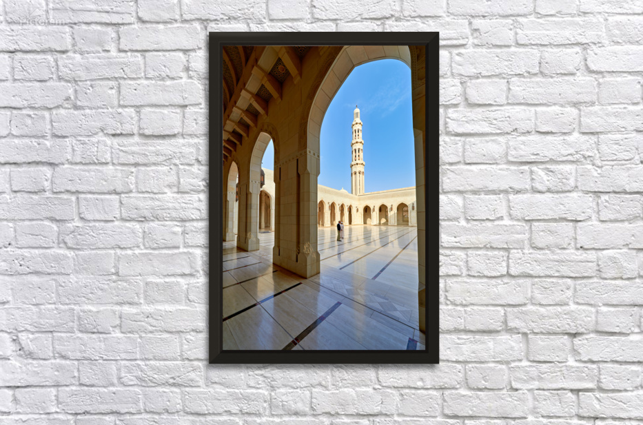 Visitors explore the interior of Sultan Qaboos Grand Mosque in Muscat. The architecture shows arches and a tall minaret under a blue sky.