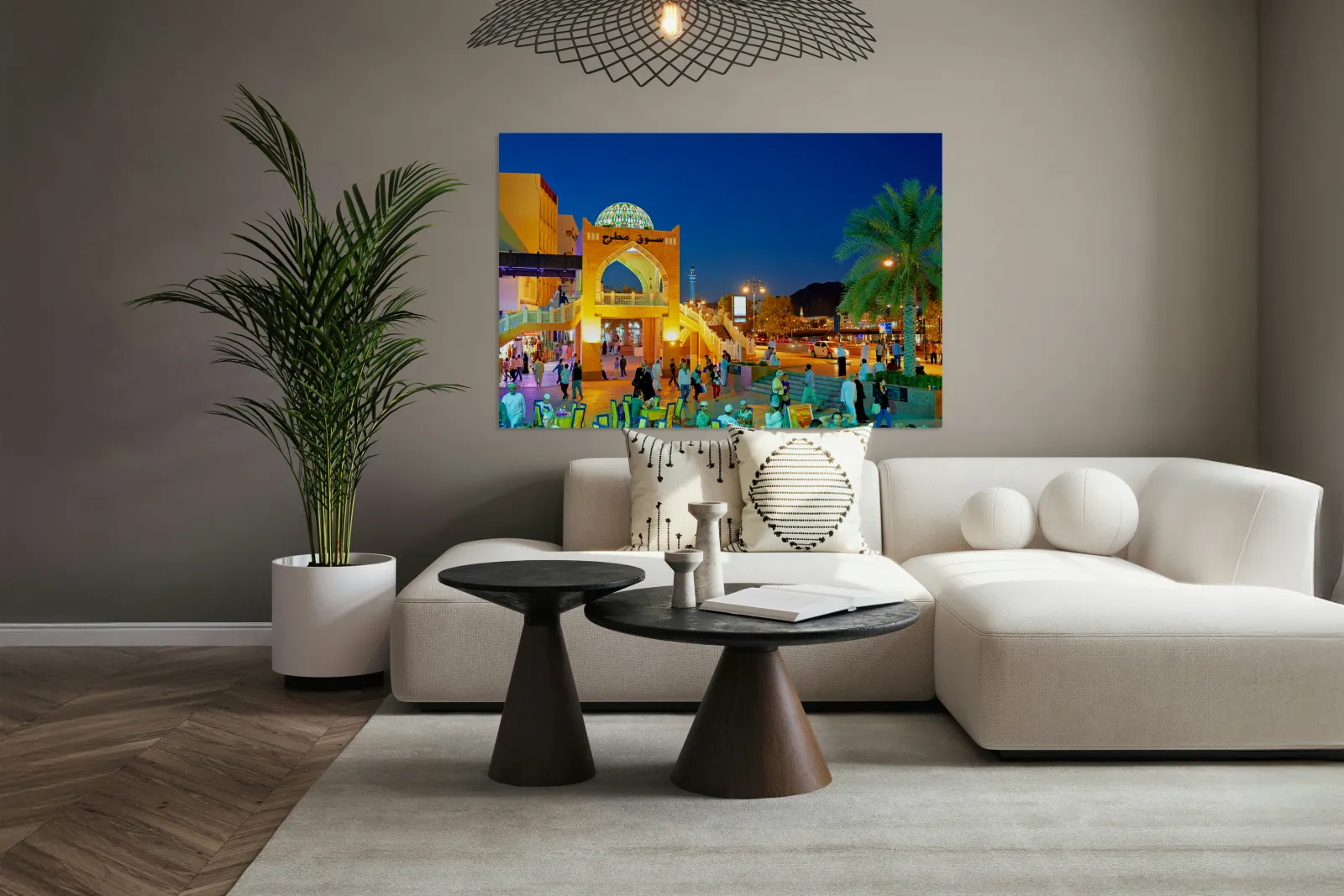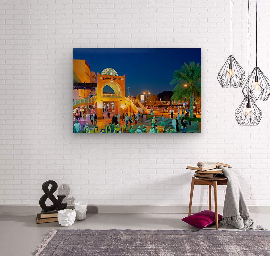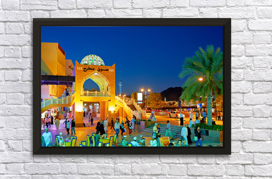 "Waterfront view of Mutrah Souq in Muscat at sunset time" in a framed print.