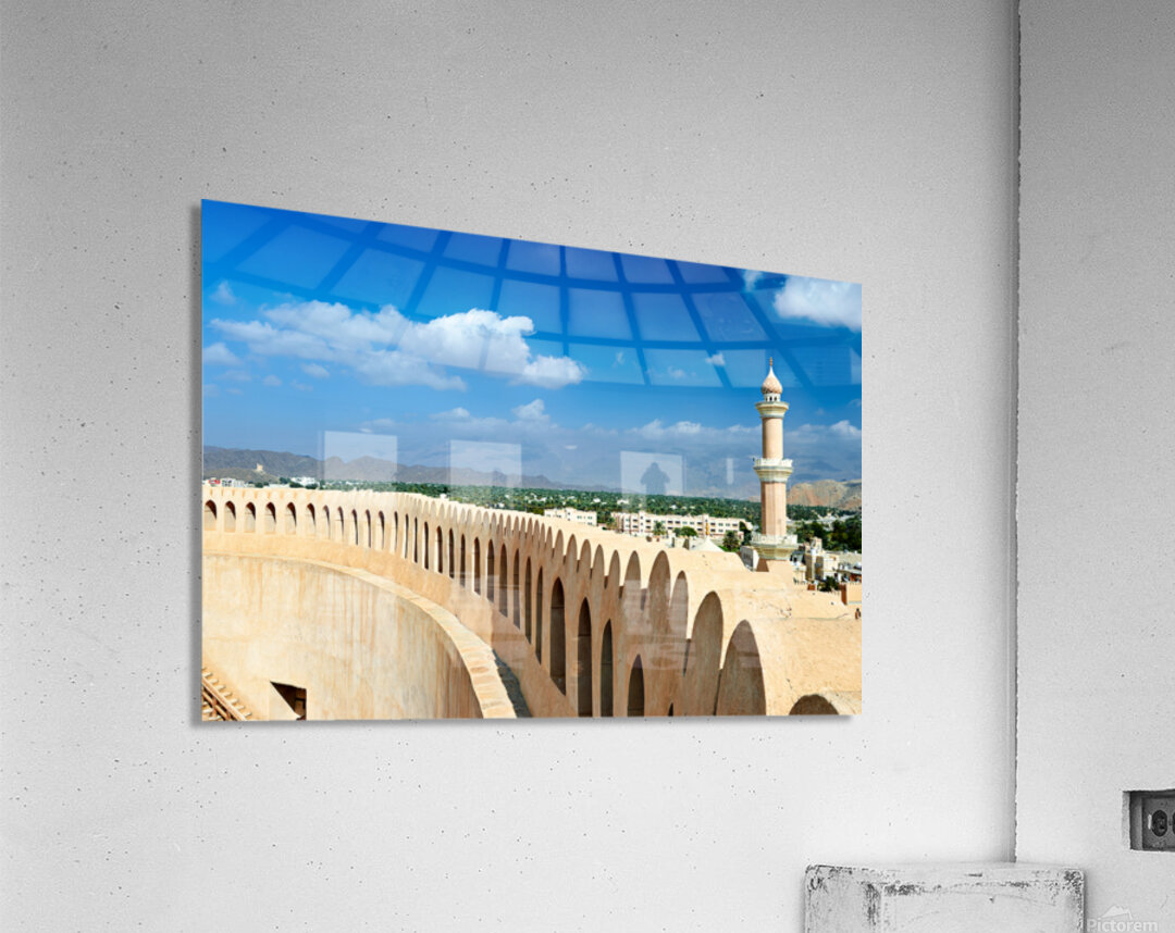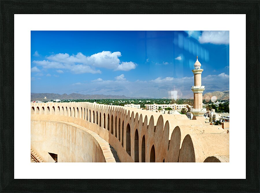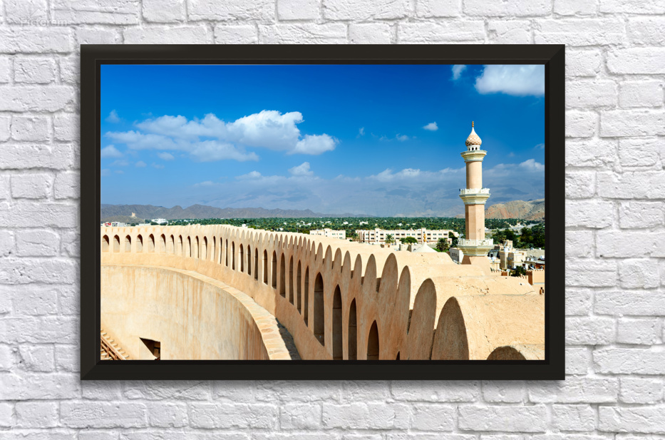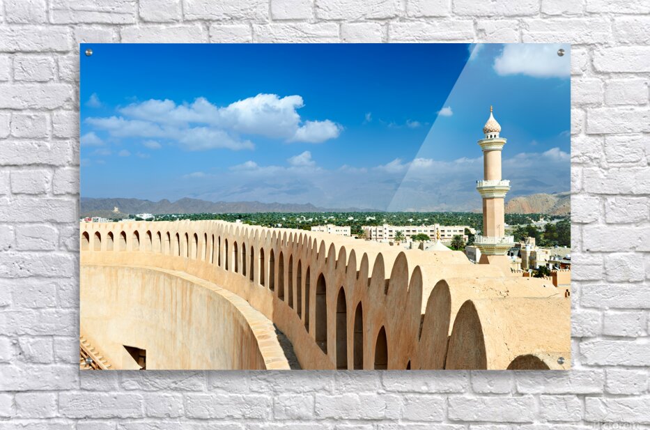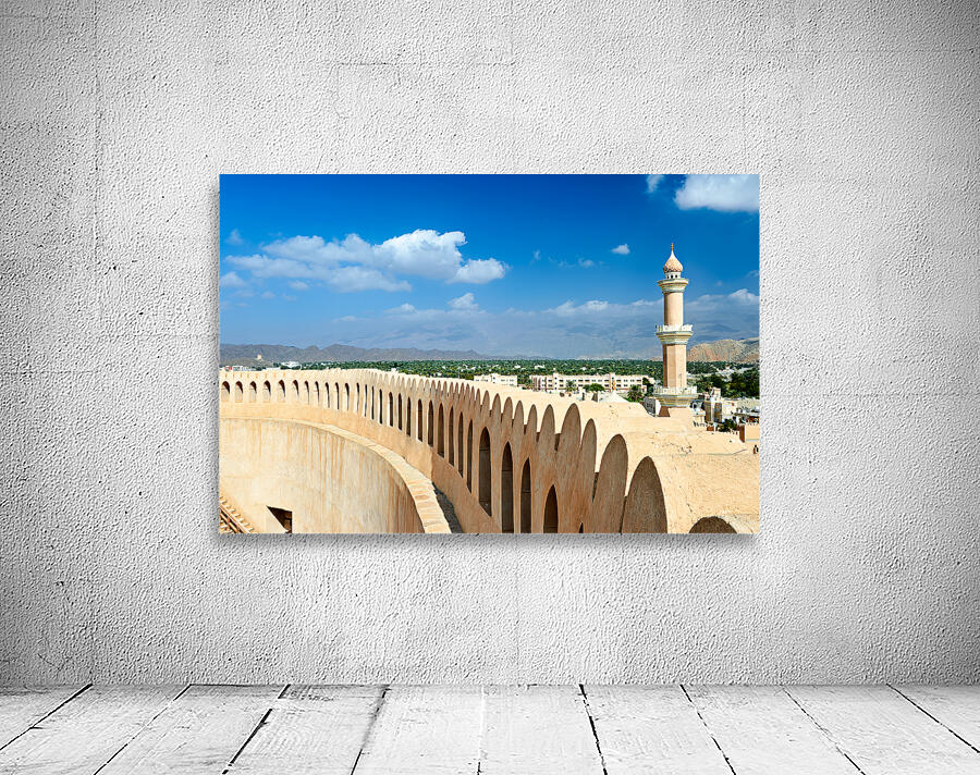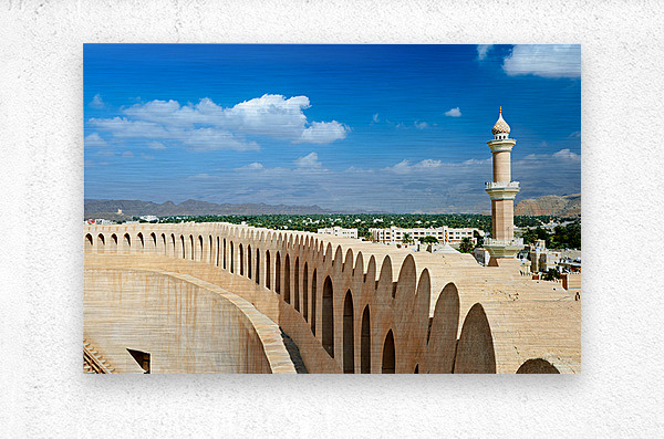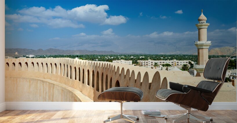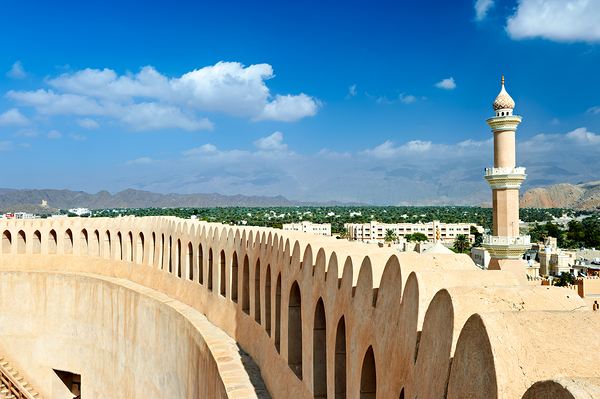 Nizwa Fort stands strong against the sky. Visitors explore the ramparts while enjoying views of the city and surrounding mountains.