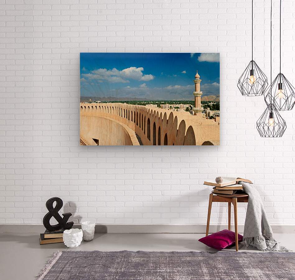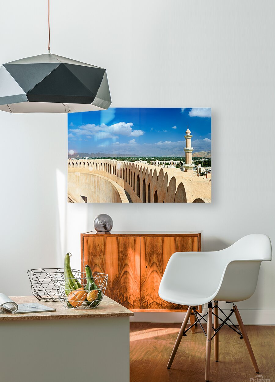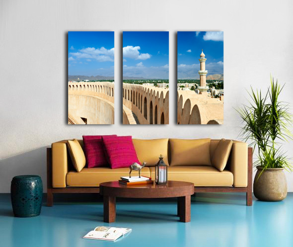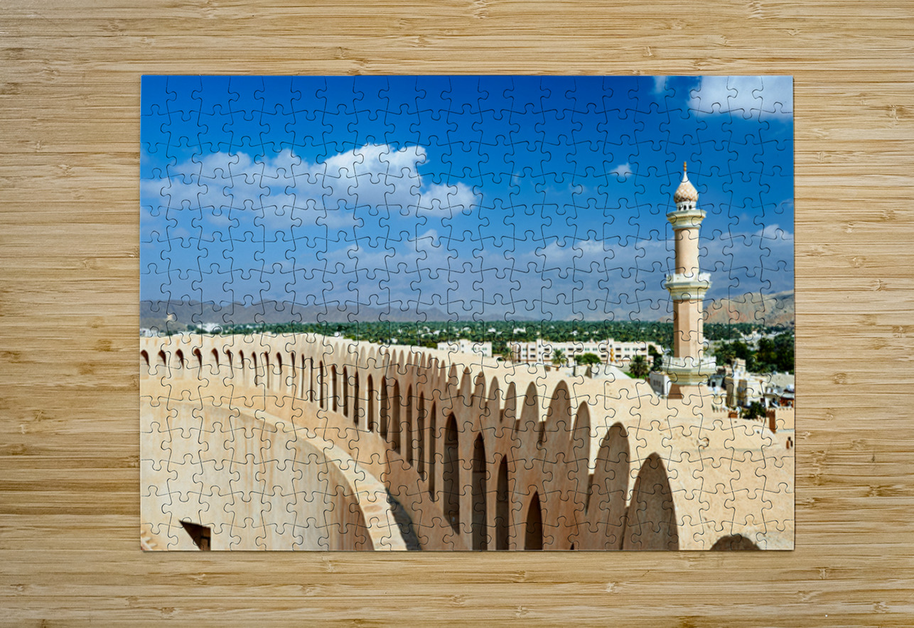 Nizwa Fort stands strong against the sky. Visitors explore the ramparts while enjoying views of the city and surrounding mountains.