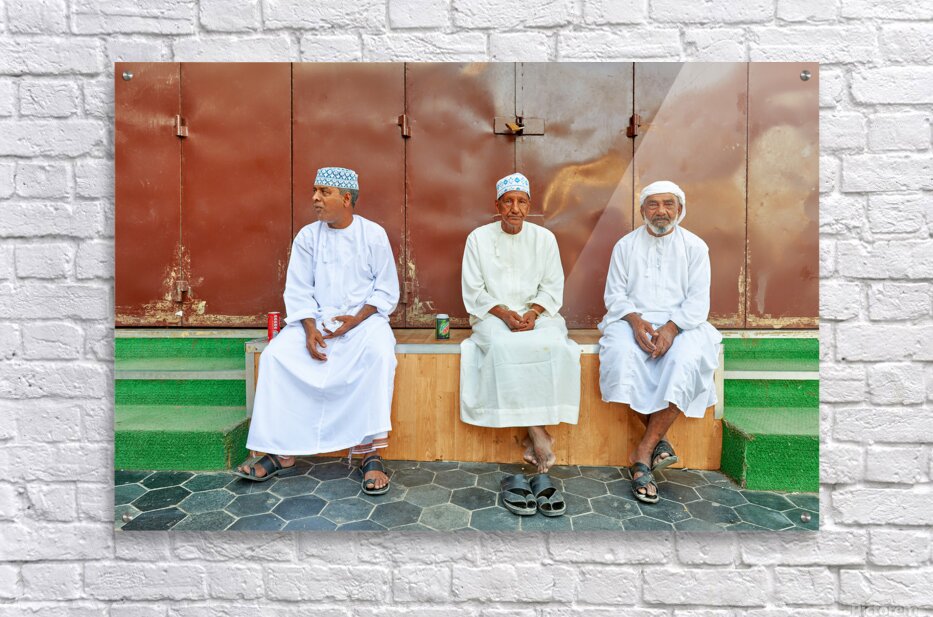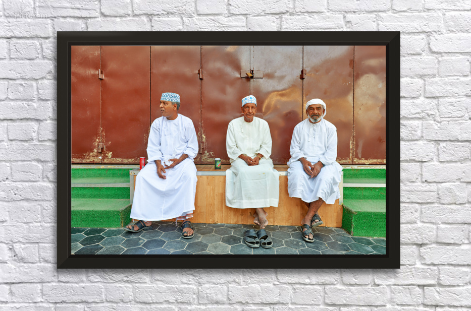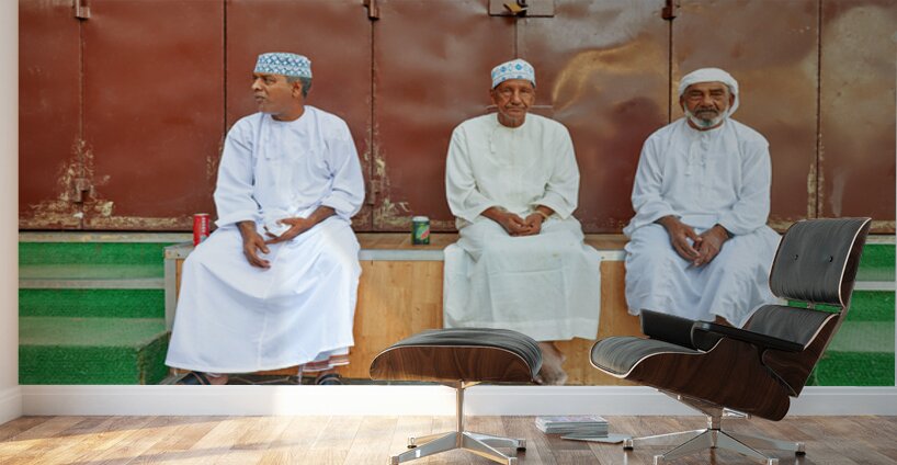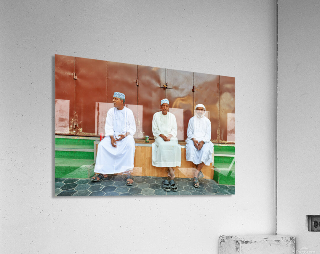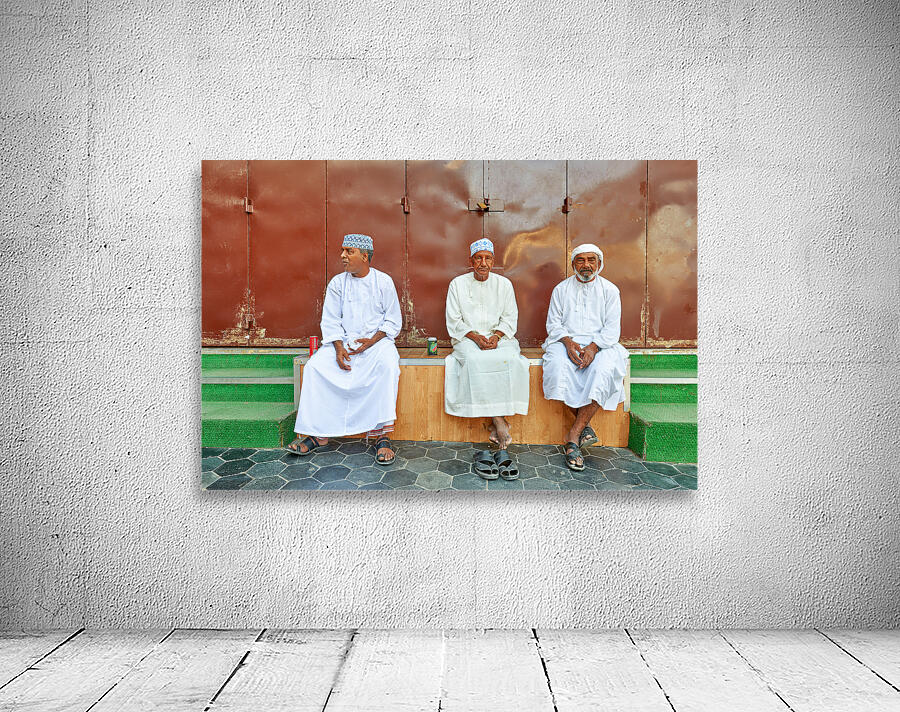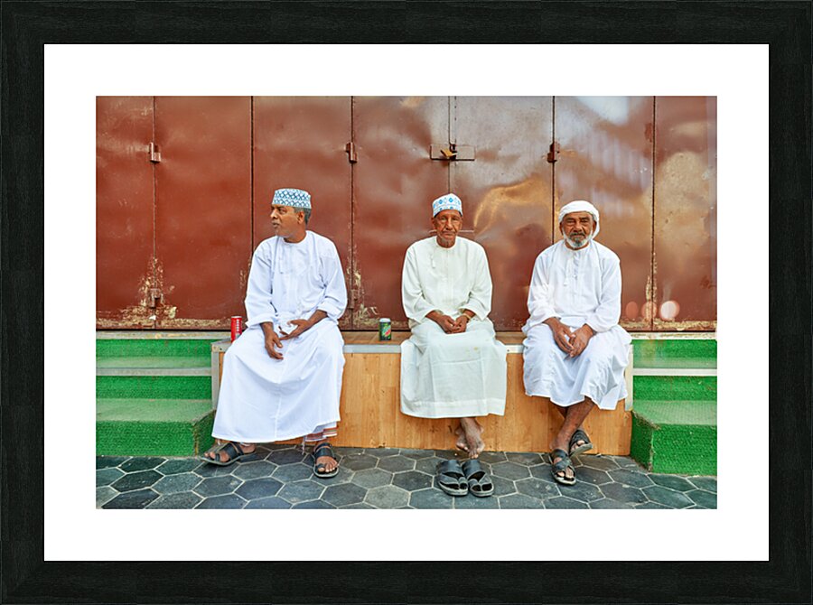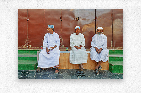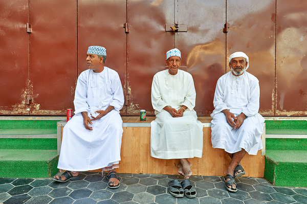 Three men sit on a bench in Muscat Oman. They wear traditional clothing and chat in the afternoon sun while enjoying drinks nearby.