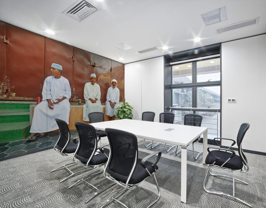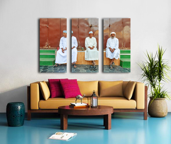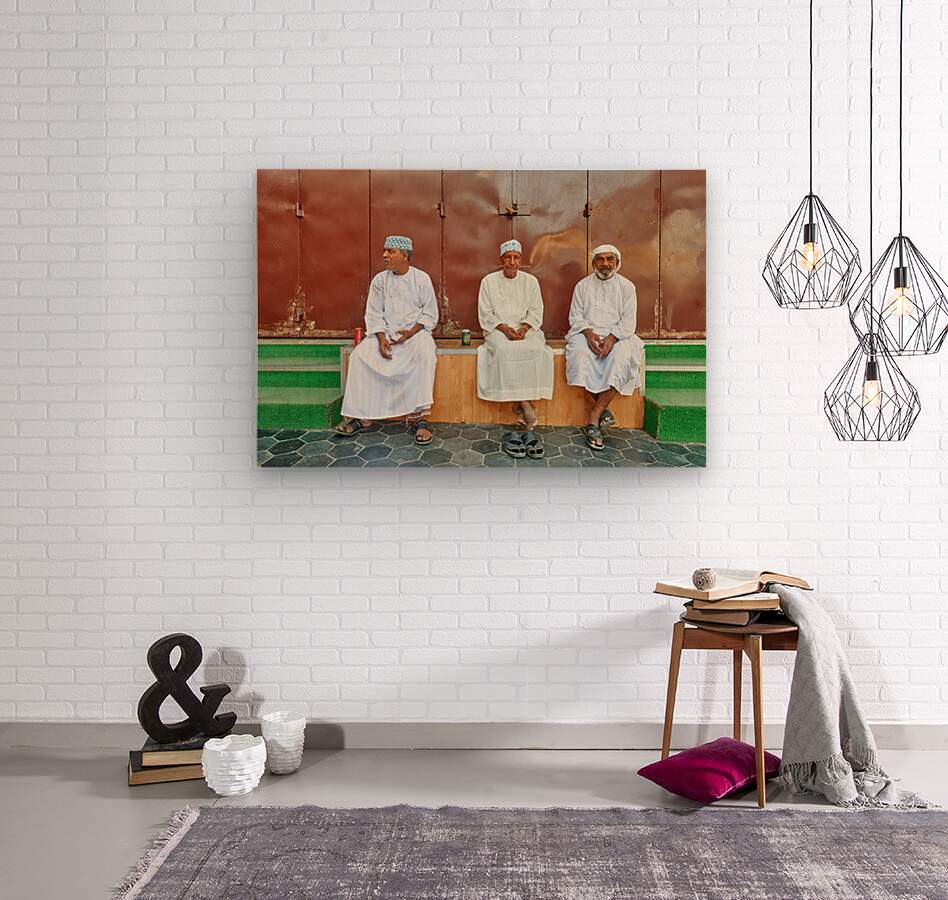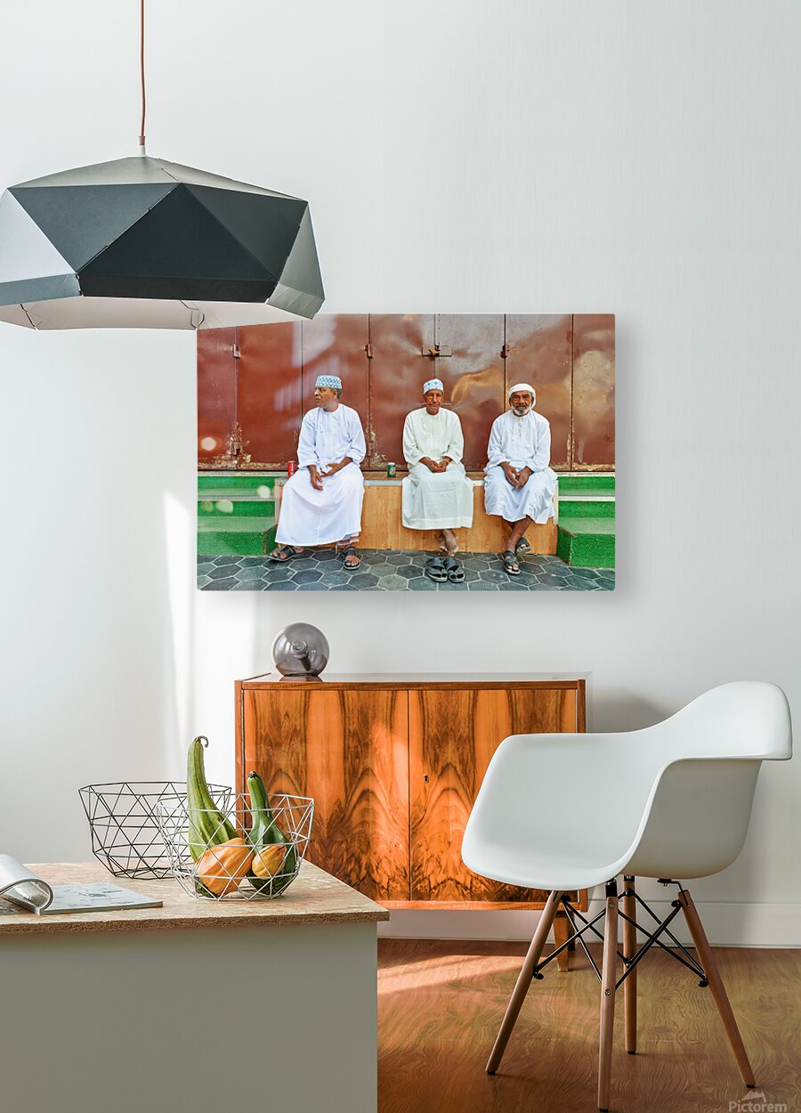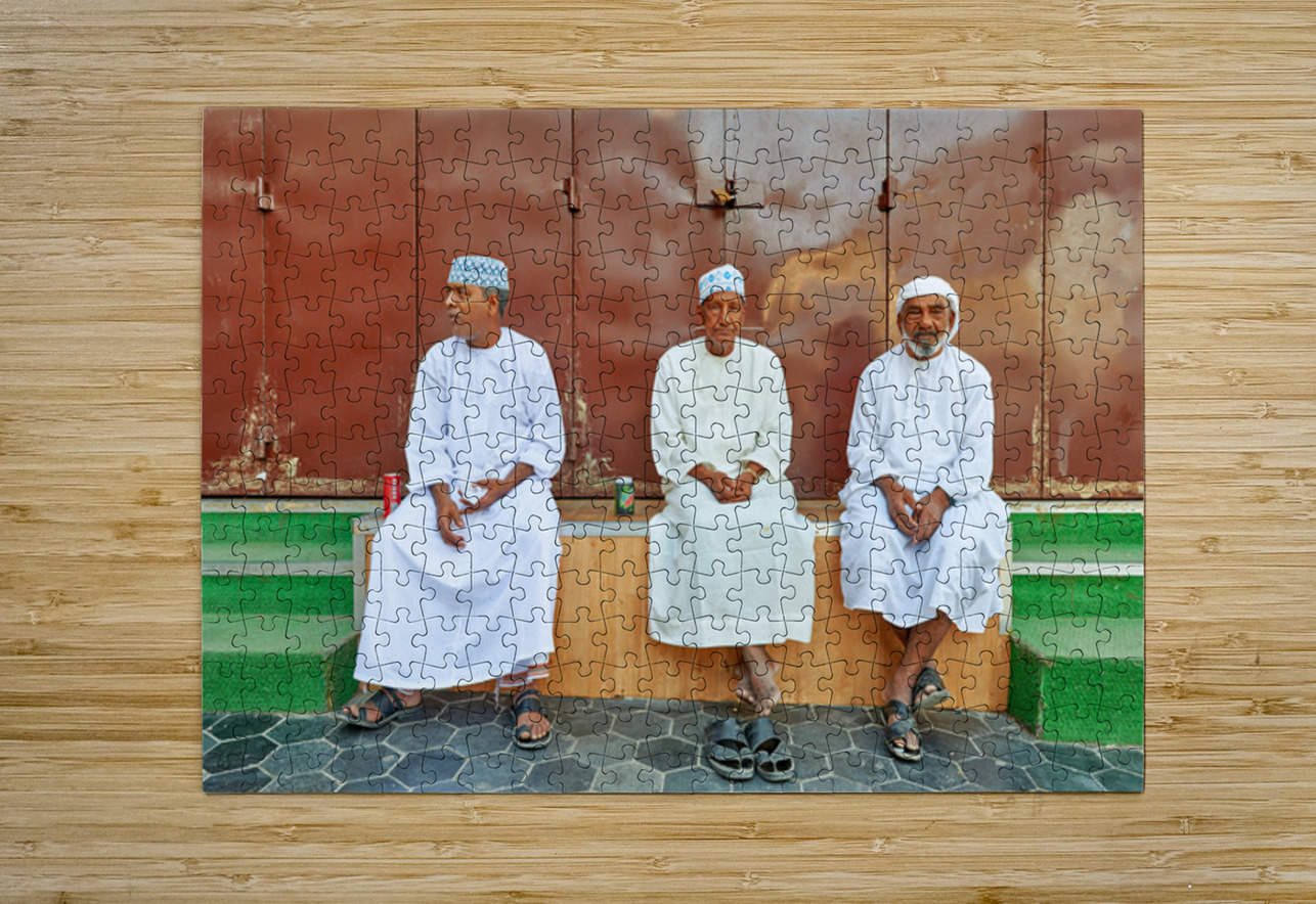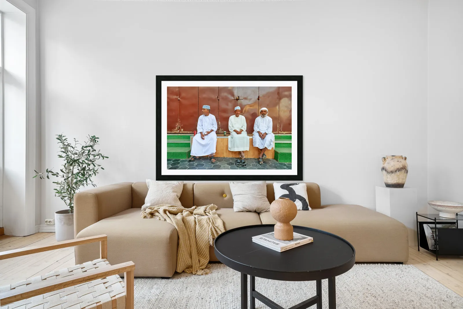Three men sit on a bench in Muscat Oman. They wear traditional clothing and chat in the afternoon sun while enjoying drinks nearby.